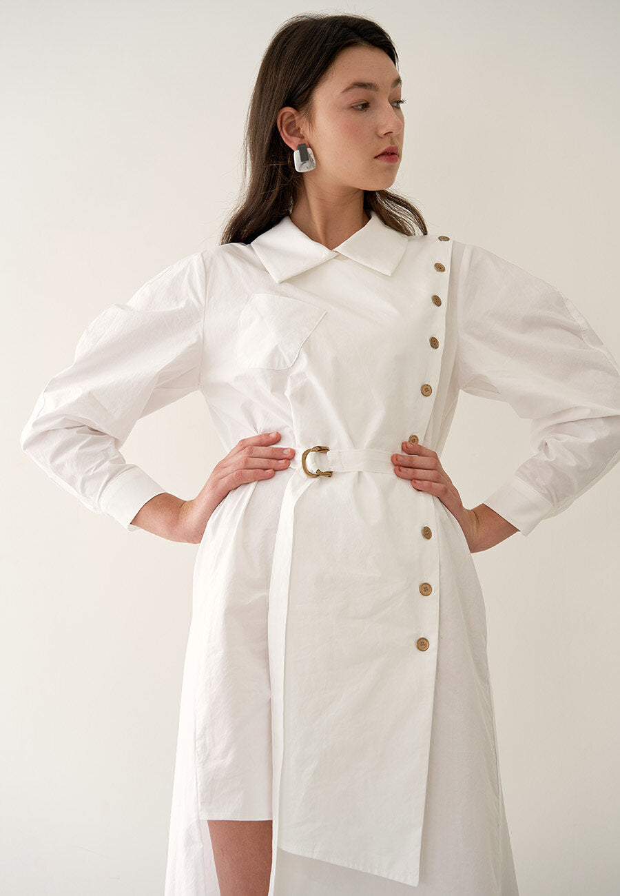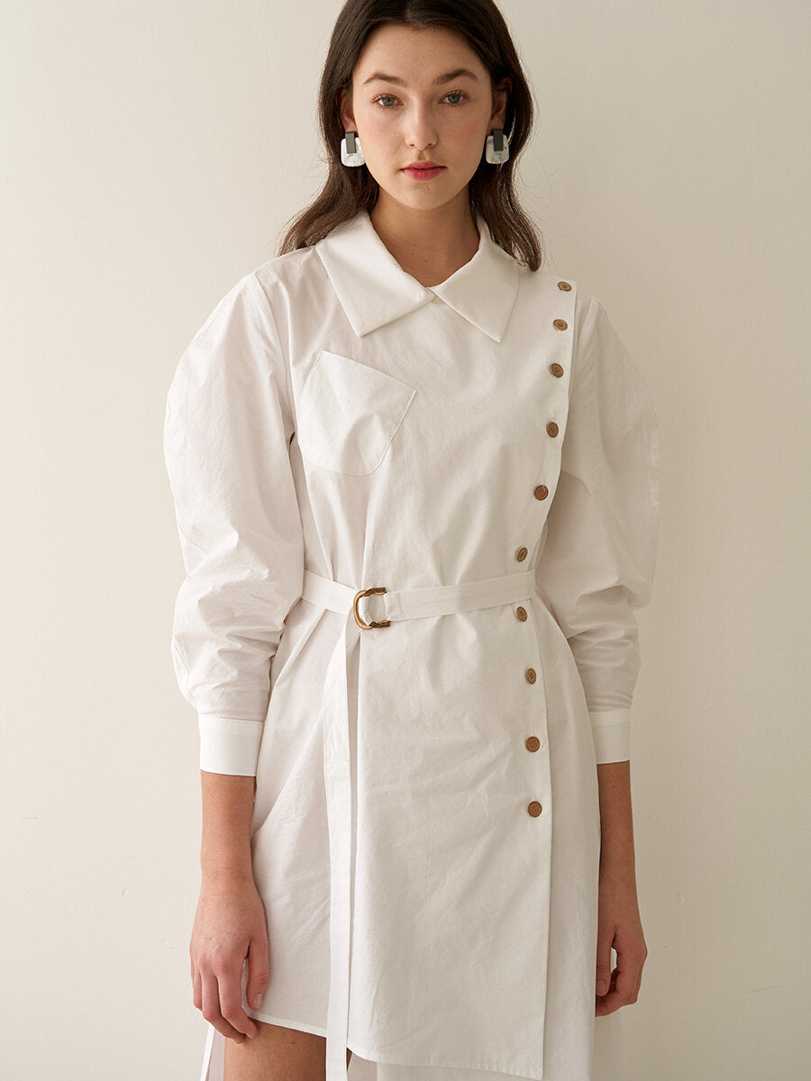 Elevate your wardrobe with this asymmetric button-detail linen dress by Laura Ren. Crafted from high-quality, breathable linen, this piece combines tailored sophistication with modern artistry. The structured puff sleeves and angled button placket add a striking silhouette, while the belted waist accentuates feminine shape. Ideal for elevated everyday wear or statement-making occasions, this linen dress is equal parts comfort and couture. Designed for the discerning woman who values design, detail, and timeless fabric, Laura Ren delivers effortless elegance through this contemporary must-have.
