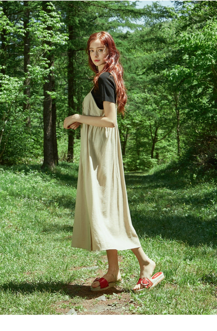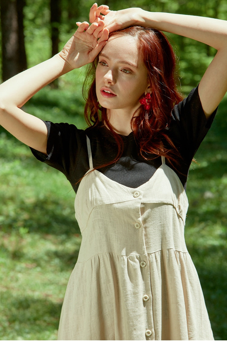 Laura Ren introduces a breezy and elegant linen dress designed for effortless charm. Featuring a softly gathered waistline and unique asymmetric button placement, this dress combines casual comfort with eye-catching detail. Thin spaghetti straps and a flowing A-line skirt make it ideal for layering or warm-weather wear. A versatile piece for picnics, strolls, or vacations.