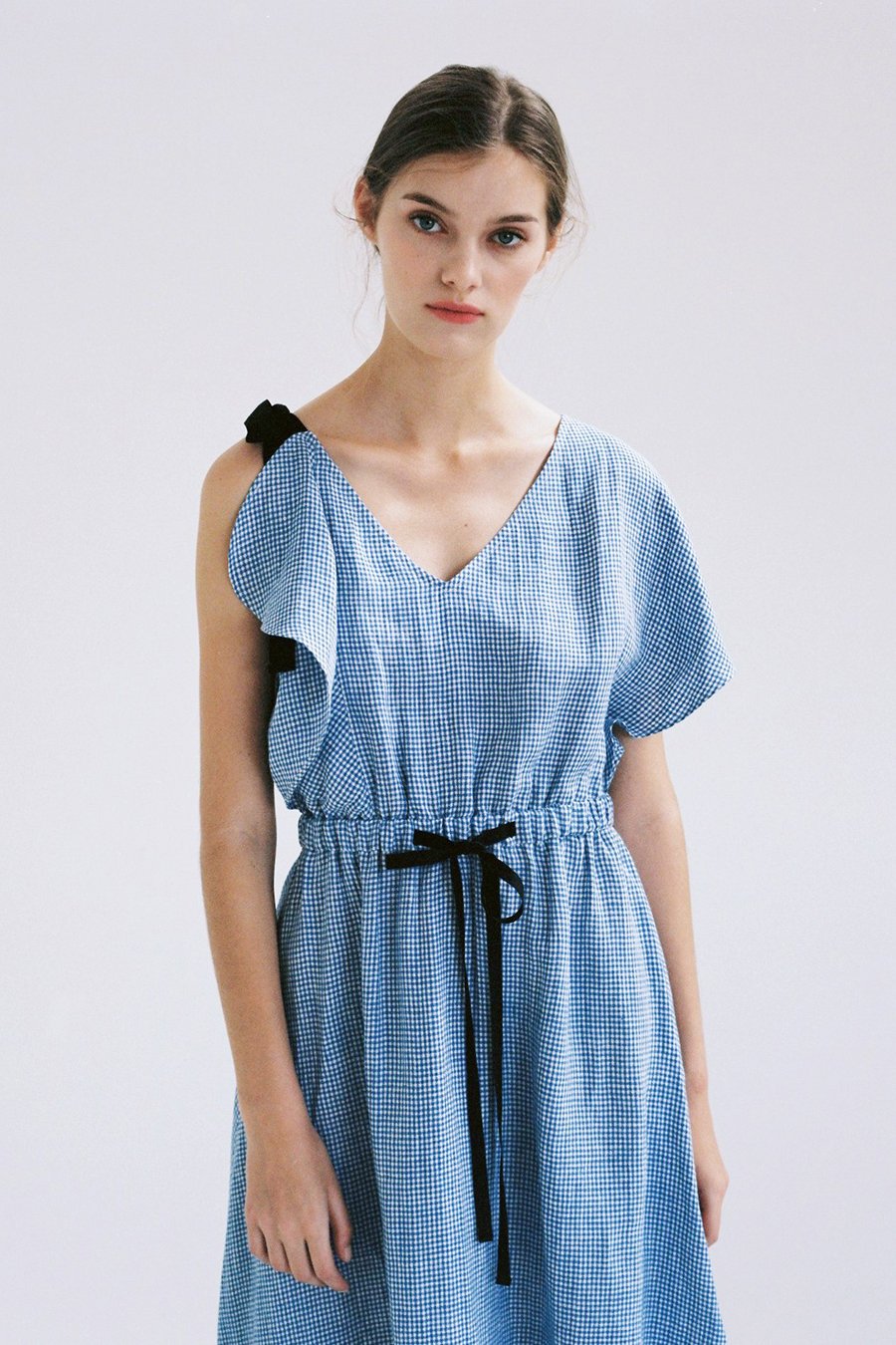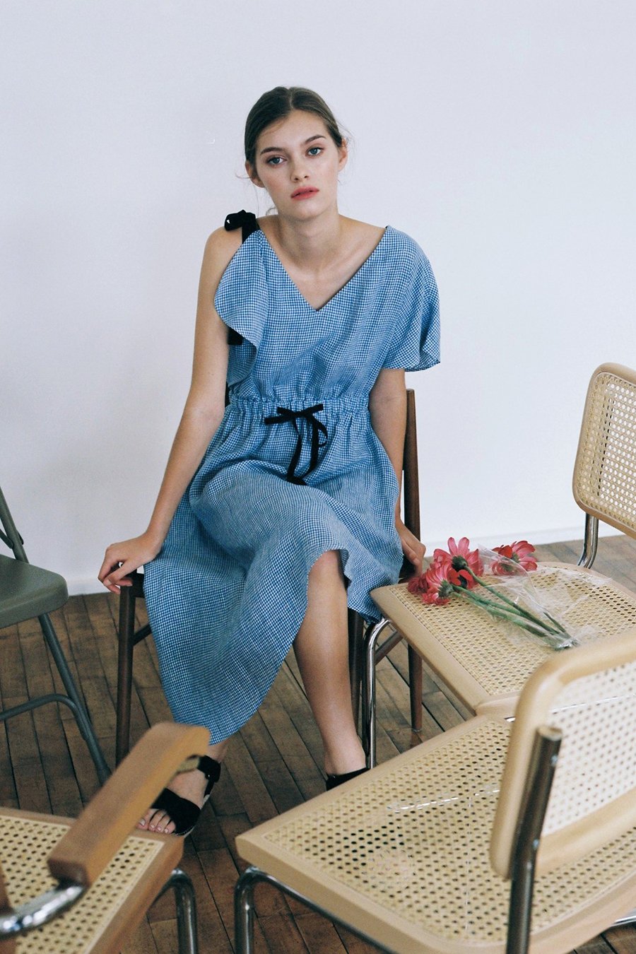 Laura Ren presents a standout summer silhouette with this asymmetric one-shoulder linen dress. Crafted from lightweight checked linen, this piece is defined by its off-balance design—one side features a draped sleeve, the other a shoulder tie with bold contrast ribbon. The soft V-neckline and elasticated waist offer flattering comfort, while the slanted hem adds dynamic movement and visual intrigue. A perfect fusion of ease and elegance, this dress is ideal for sun-drenched escapes or artistic city strolls. Elevate your warm-weather wardrobe with this unique linen piece from Laura Ren’s refined collection of minimalist statements.