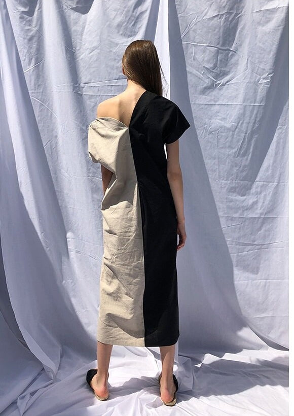 This striking asymmetrical linen midi dress by Laura Ren features bold contrast paneling for a contemporary take on minimalism. Made from premium breathable linen, the dress combines a sculptural off-shoulder neckline with a sleek color-block design in neutral tones. A waist tie gently defines the silhouette, while a side slit adds movement and ease. The back reveals a clean, uninterrupted flow of fabric, enhancing the dress's elegant lines. Ideal for warm-weather dressing, artful evenings, or standout resort styling, this piece offers refined simplicity with modern edge.