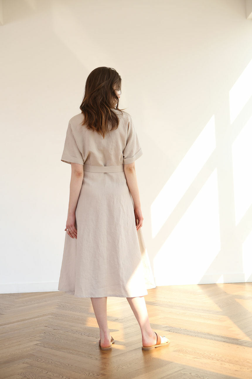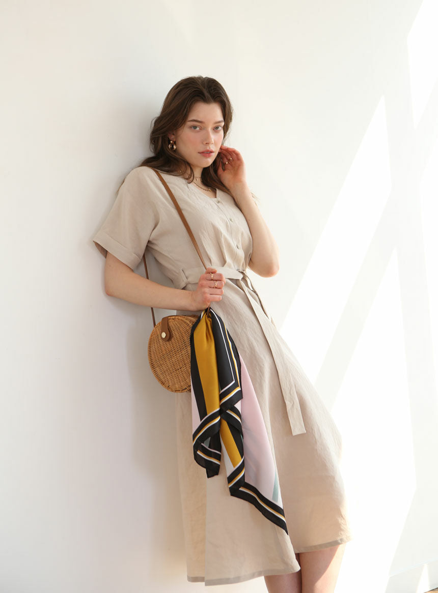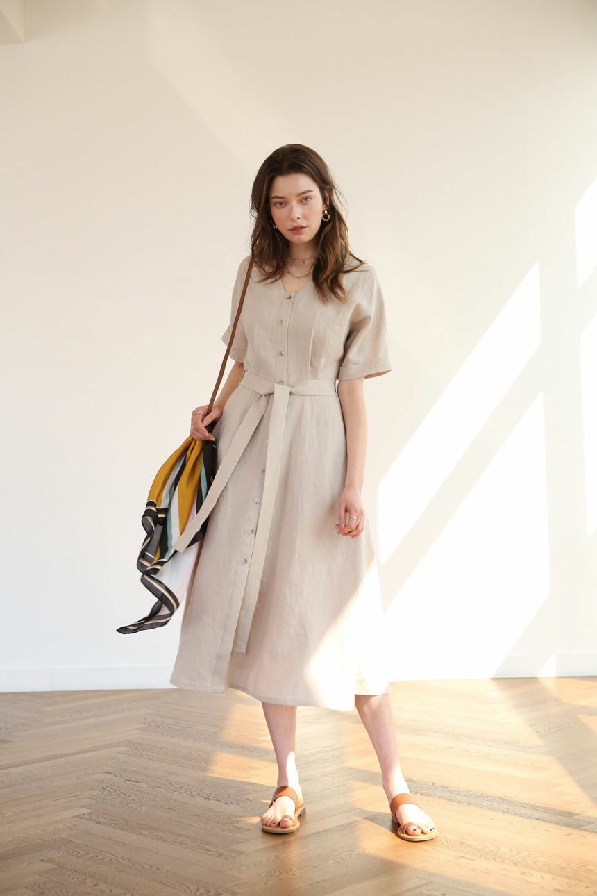 Laura Ren presents a beautifully tailored linen dress that blends comfort and sophistication. Crafted from breathable linen, this midi-length silhouette features a flattering V-neckline, short sleeves, and a waist-defining self-tie belt. The button-down front adds structure while allowing styling versatility. Perfect for weekend outings, garden parties, or casual summer brunches, this dress embodies timeless elegance with a modern touch.