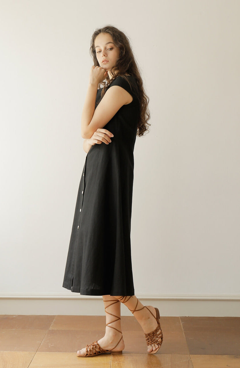 A timeless essential, this black linen midi dress from Laura Ren combines minimalist charm with refined tailoring. Crafted from breathable linen, it features a graceful boat neckline, cap sleeves, and a row of contrasting buttons down the front for a polished finish. The fitted waist and subtly flared skirt offer a flattering silhouette that moves effortlessly from day to evening. Perfect for warm-weather dressing, this piece blends comfort, style, and versatility—whether paired with flats for casual chic or elevated with accessories for dinner out.