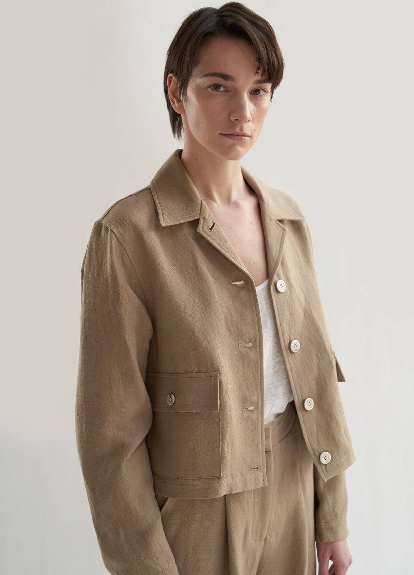 The cropped linen blazer from Laura Ren is a refined addition to warm-weather tailoring. Cut from breathable linen, this minimalist blazer features a structured collar, front patch pocket with flap detailing, and a row of tonal buttons for a polished finish. Designed with a clean, cropped hem that layers effortlessly over tanks or blouses, it elevates casual ensembles while remaining lightweight and versatile. Whether paired with its matching trousers or styled with denim, this piece brings effortless sophistication to your seasonal wardrobe. Laura Ren continues to deliver sleek essentials with thoughtful tailoring and elevated texture.
