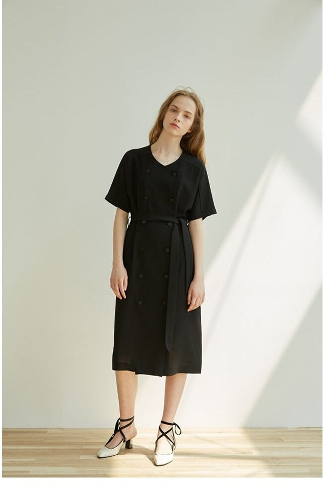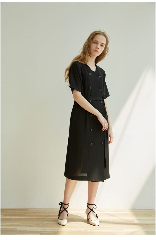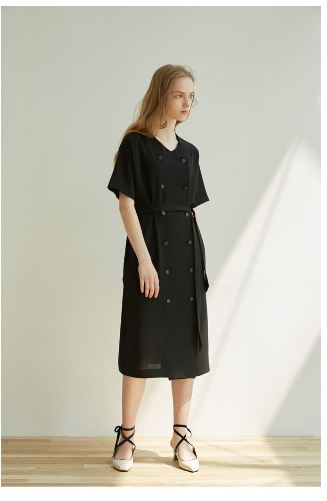 Double-Breasted Linen Midi Dress with Short Sleeves and Waist Tie for Modern Sophisticated Look