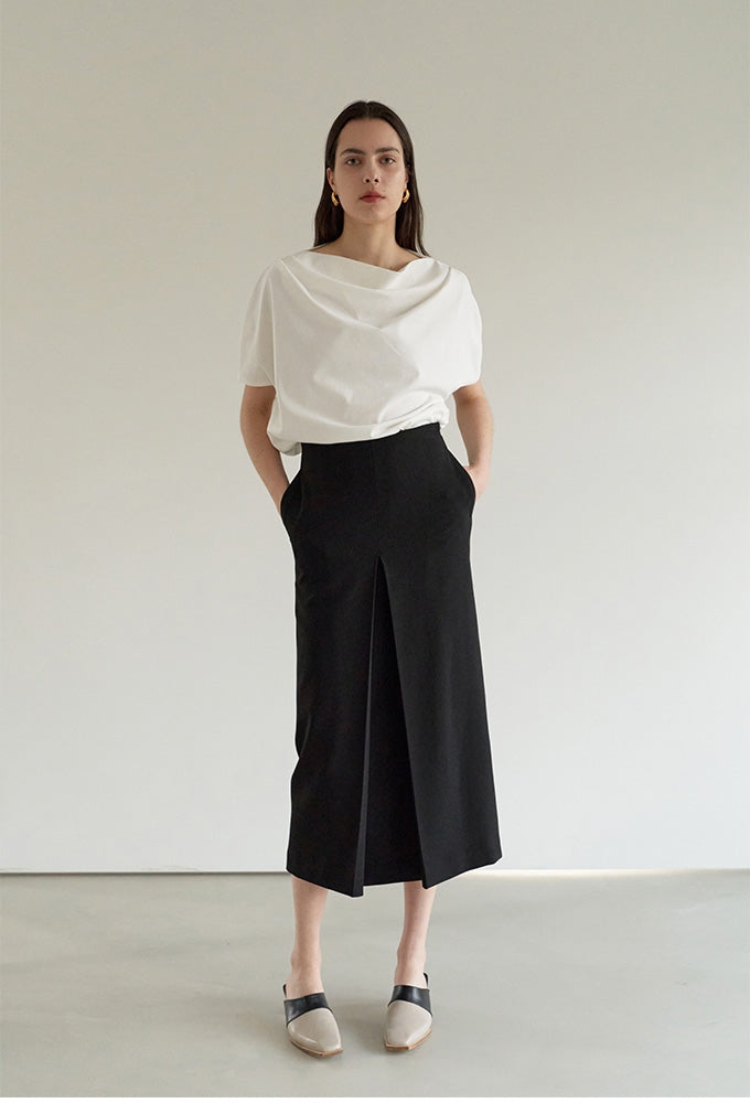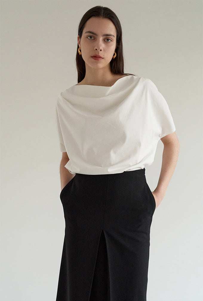 Refined and effortless, this soft white top by Laura Ren is crafted from a breathable linen blend that offers lightweight structure with natural texture. The elegant cowl neckline drapes beautifully across the collarbone, creating a graceful silhouette that elevates everyday styling. With relaxed short sleeves and a fluid fit, this piece pairs seamlessly with tailored skirts or wide-leg trousers. Ideal for both casual refinement and understated evening looks, it's a versatile staple designed for modern minimalist wardrobes.
