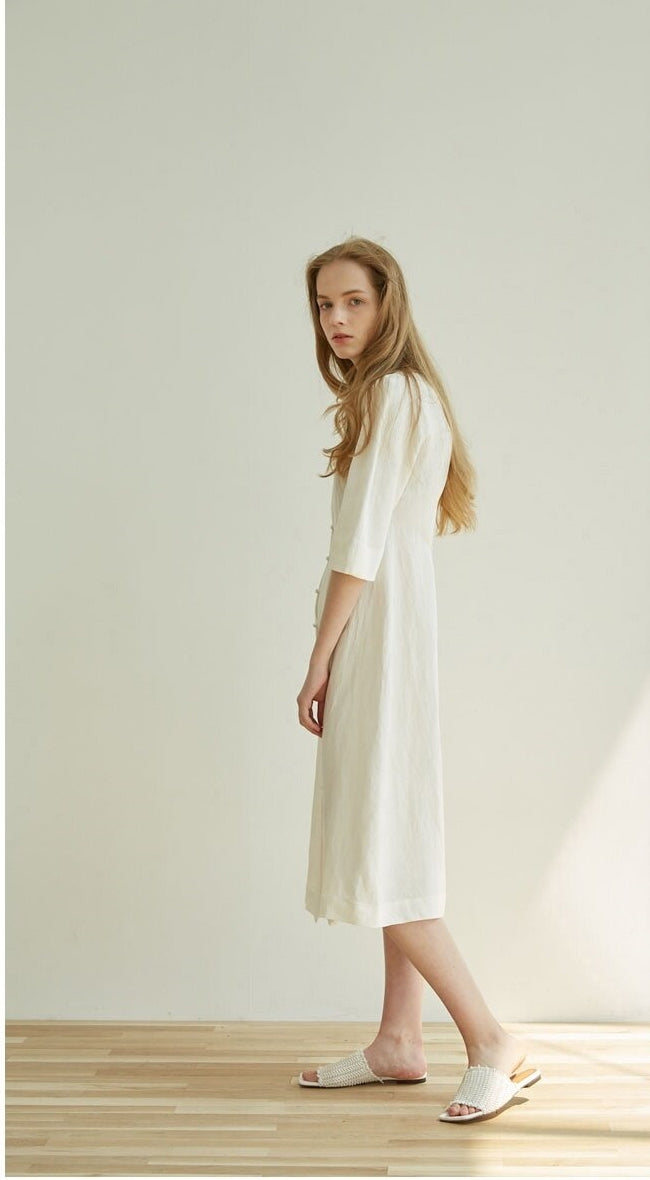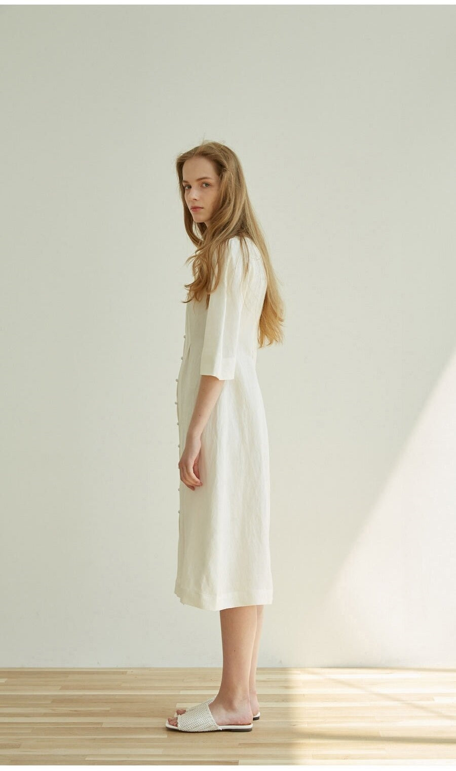 Elegant Button-Front V-Neck Linen Dress with Half Sleeves and Tailored Waist Detail