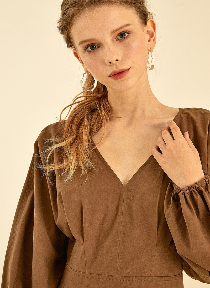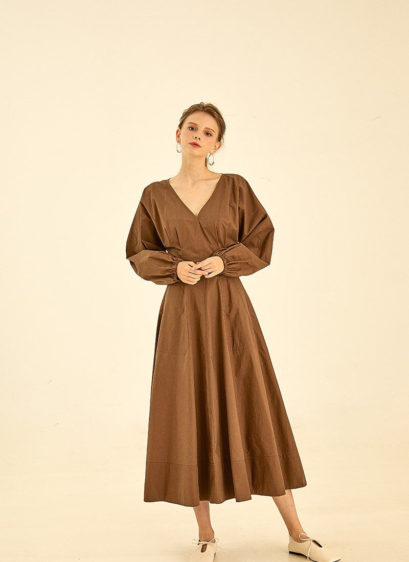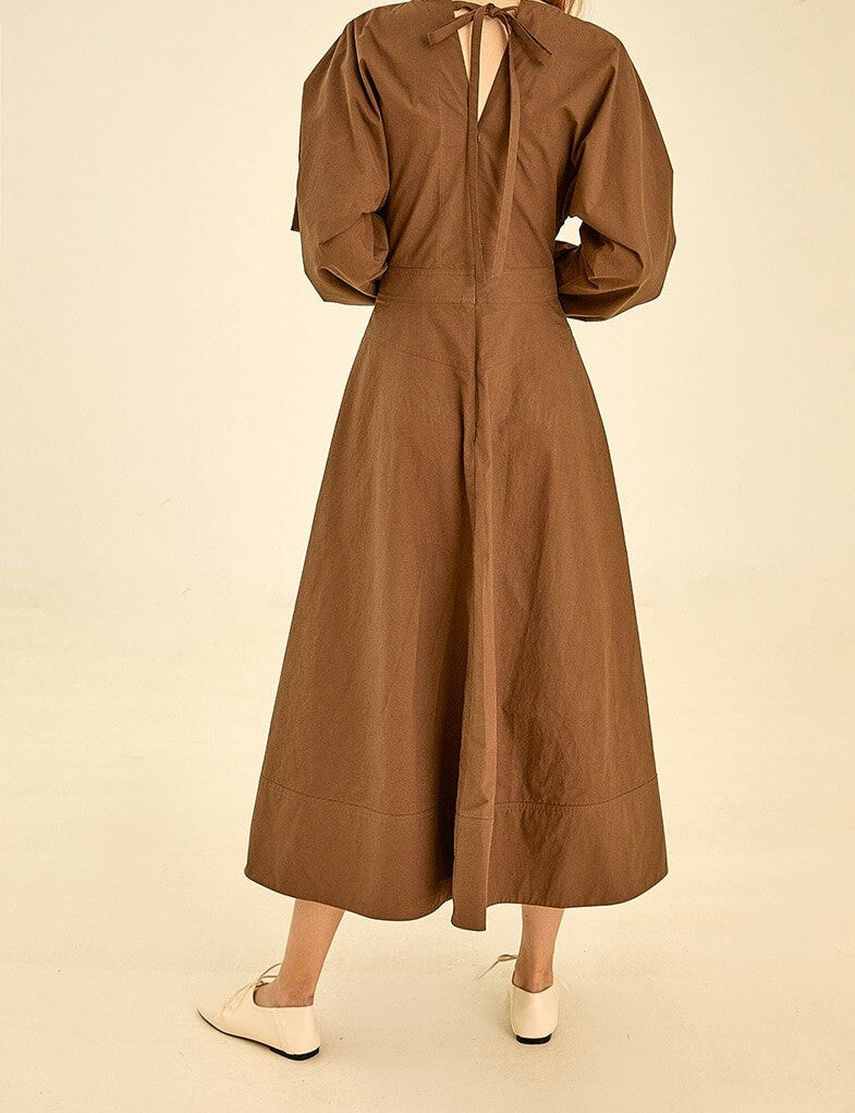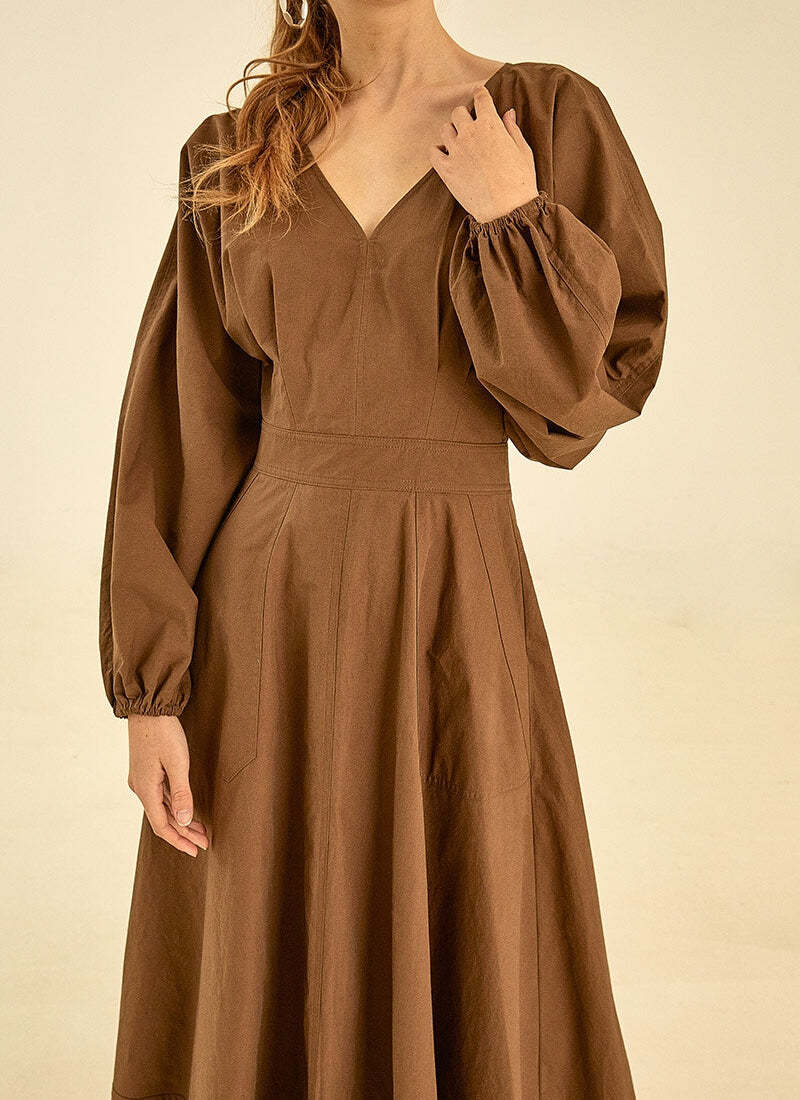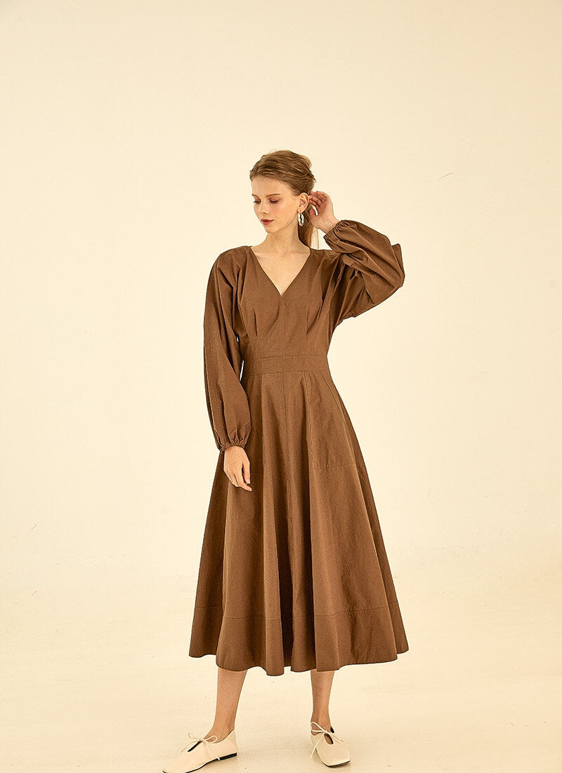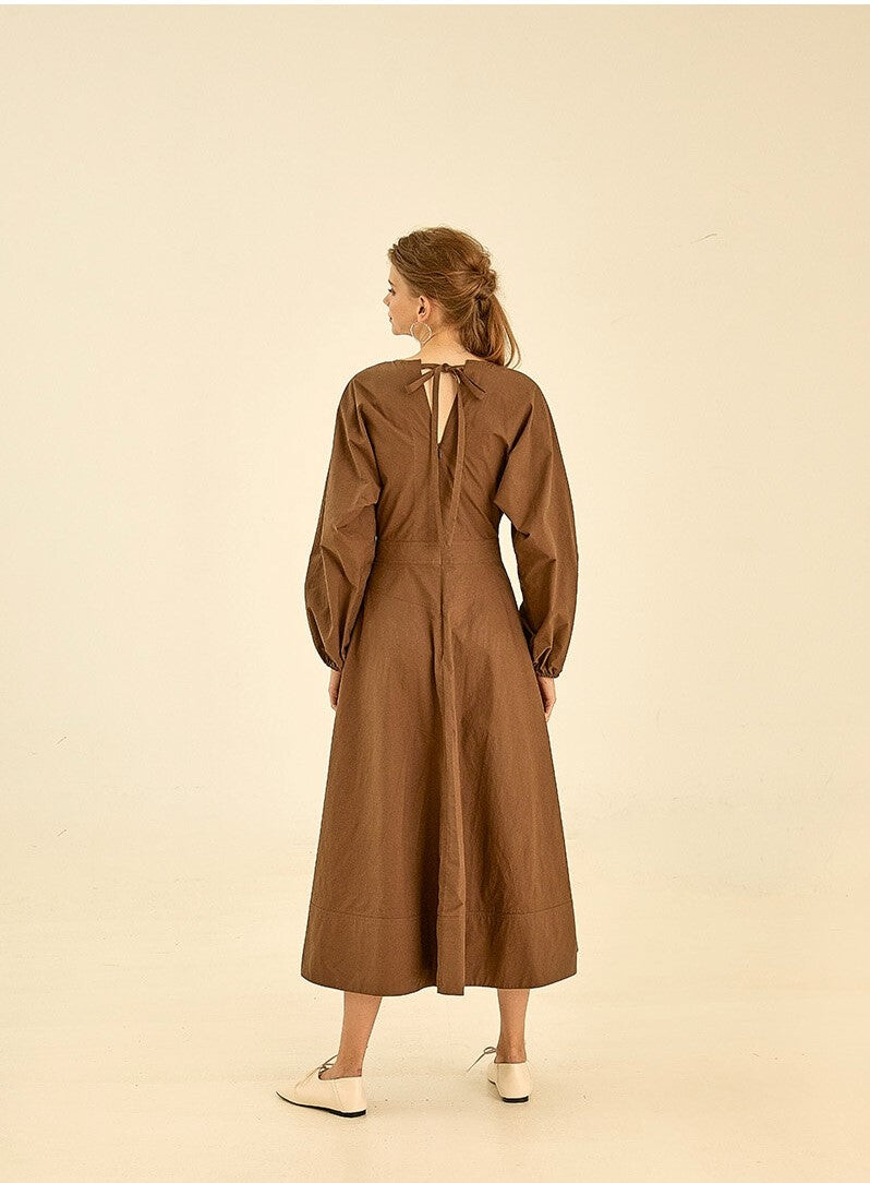 This cotton poplin dress from Laura Ren redefines understated elegance with its refined silhouette and luxurious fabric. Crafted from premium cotton poplin, the dress features a flattering V-neckline, voluminous long sleeves, and a softly gathered waist that enhances the feminine shape. The flared midi-length skirt offers graceful movement, making it ideal for both everyday elegance and refined occasions. A discreet back-tie detail completes the polished look. Designed for the modern woman, this dress blends comfort with contemporary sophistication—perfect for elevated daywear or effortless evening transitions.