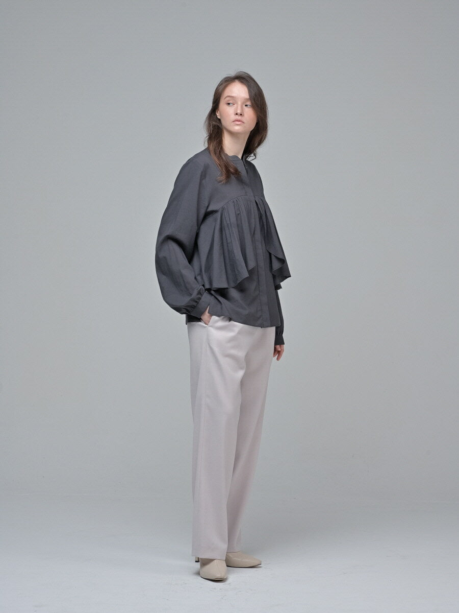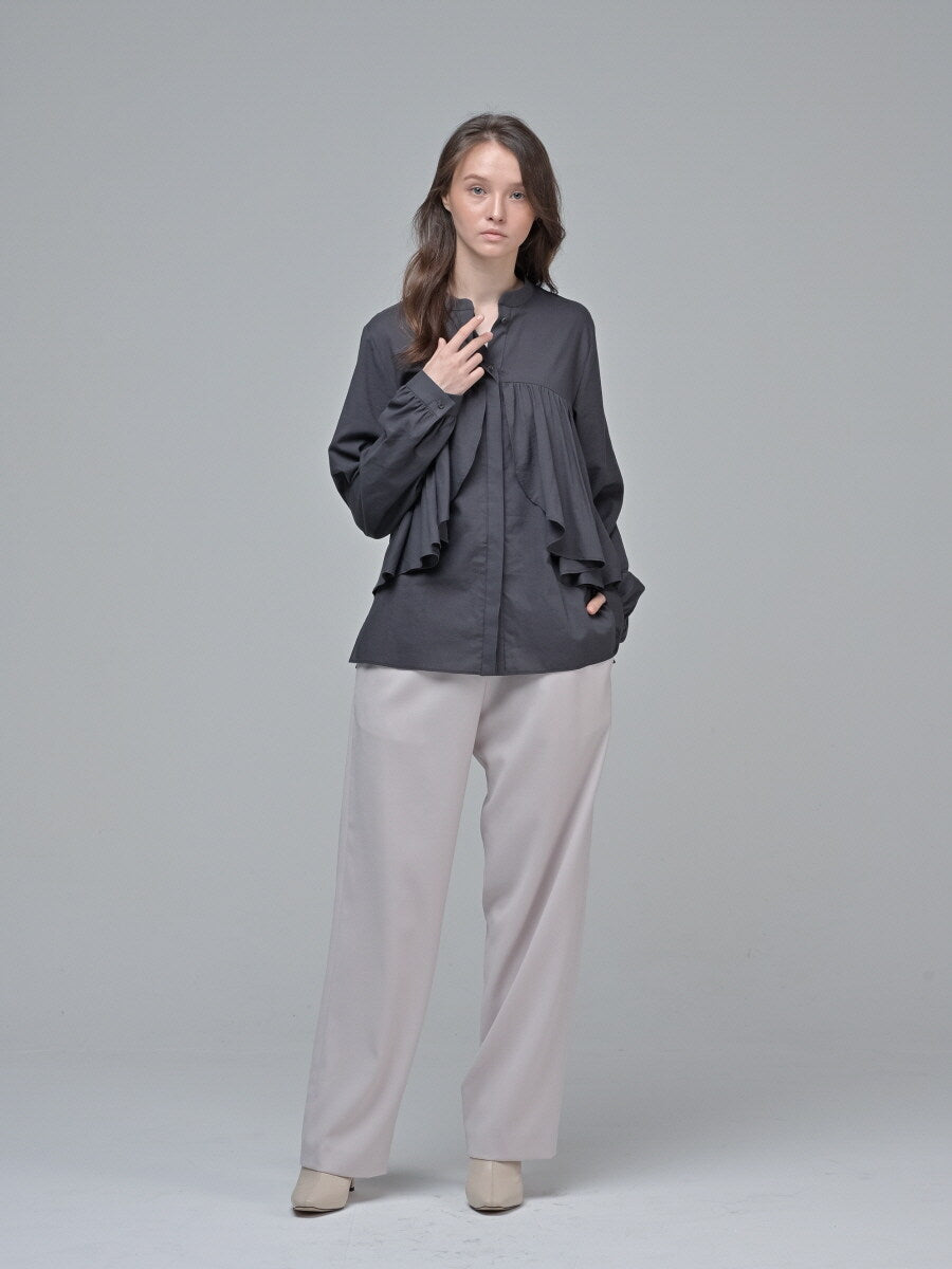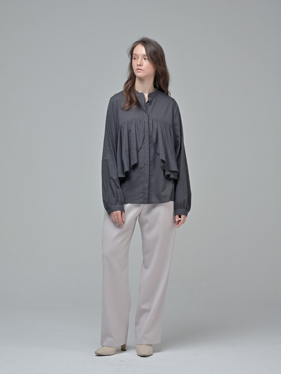 Refined and sophisticated, this long-sleeve cotton poplin blouse from Laura Ren is designed for the modern woman who values comfort and elegance. Crafted from breathable, natural linen, the blouse features a softly structured silhouette with a striking draped ruffle detail at the front, adding texture and visual interest. The relaxed fit ensures easy movement, while the band collar and hidden button placket offer a clean, contemporary finish. Ideal for both professional settings and elevated casual wear, this blouse pairs effortlessly with tailored trousers or a midi skirt for timeless sophistication. A must-have addition to any curated wardrobe, blending luxury craftsmanship with versatile design.