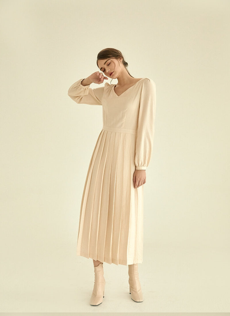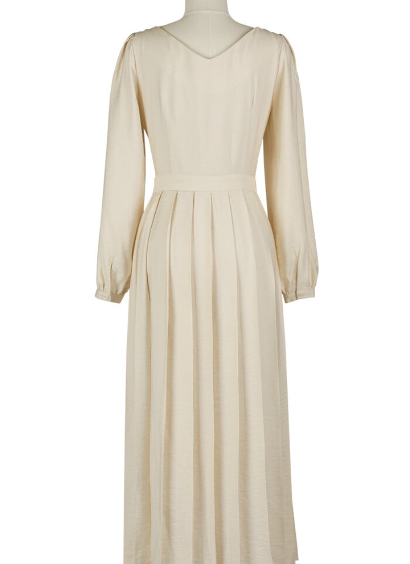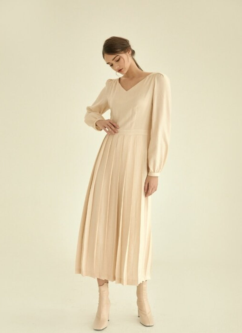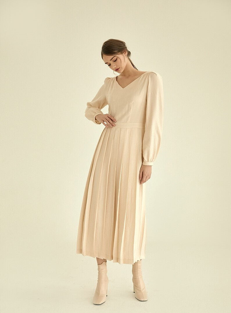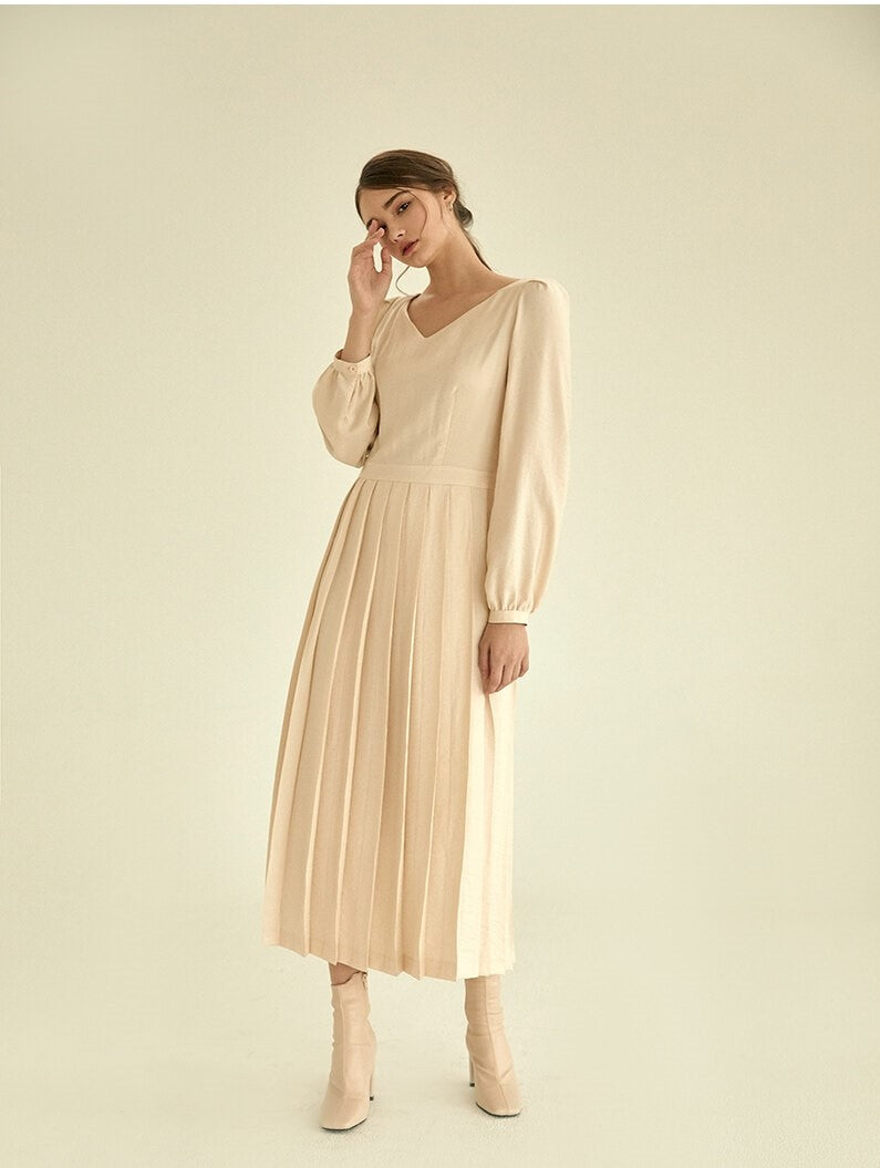 This beautifully crafted midi dress from Laura Ren is made from premium-quality linen, offering a breathable yet structured silhouette perfect for refined everyday wear or special occasions. The design features a flattering V-neckline, long sleeves with subtle gathers at the cuff, and a graceful pleated skirt that flows effortlessly with each step. Its tailored waist enhances the feminine figure while maintaining comfort and ease. Designed with a minimalist aesthetic and timeless structure, this linen dress from Laura Ren is a versatile wardrobe staple ideal for both casual elegance and polished looks. Add understated luxury and texture to your seasonal wardrobe with this essential piece.