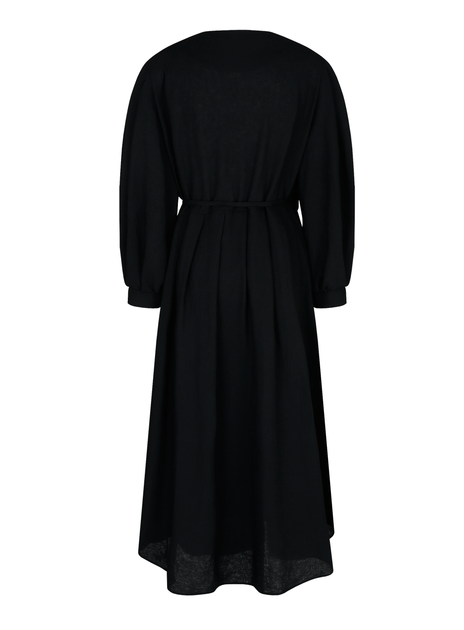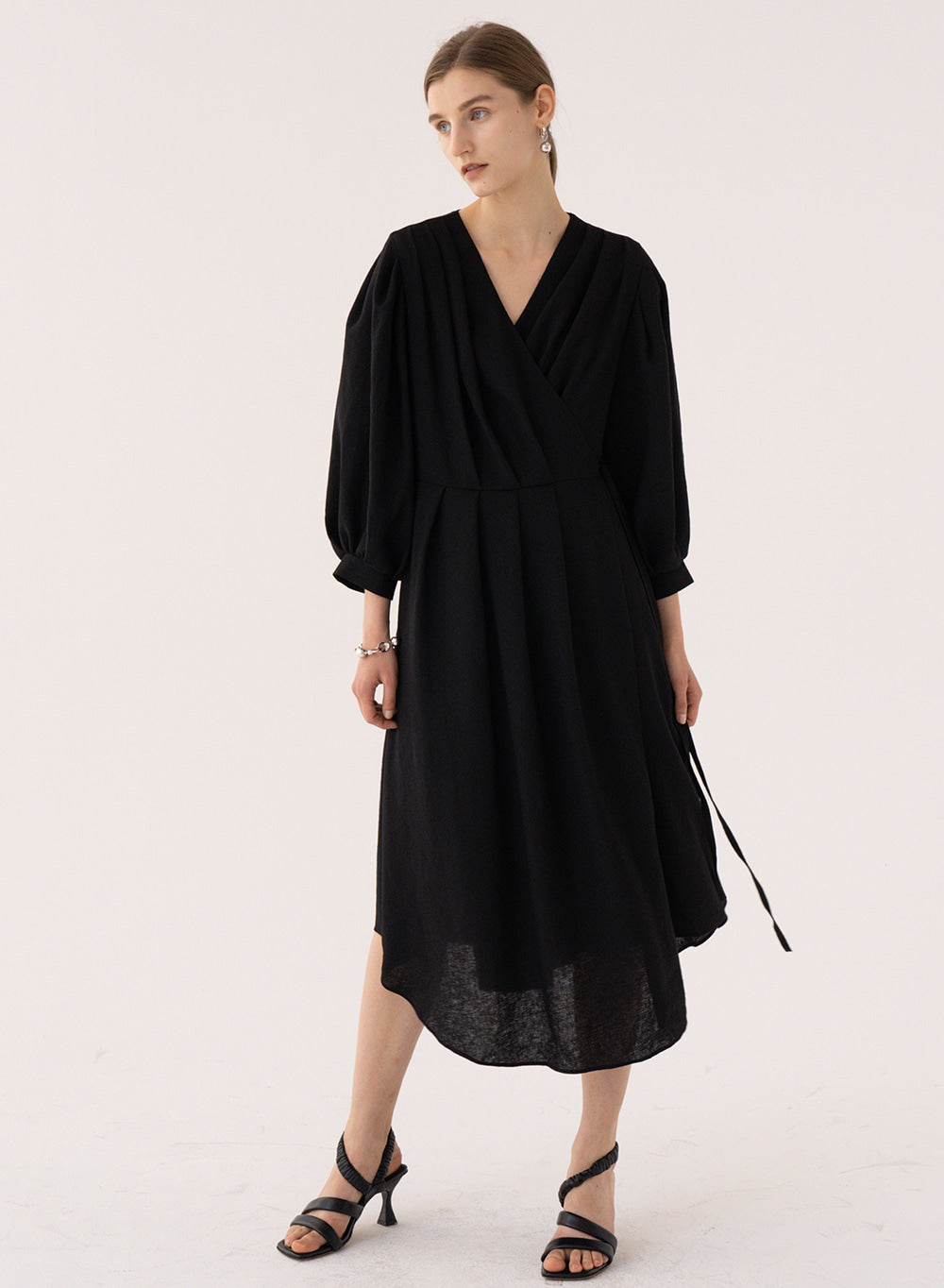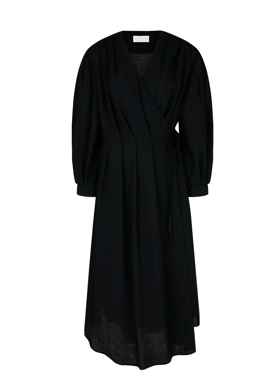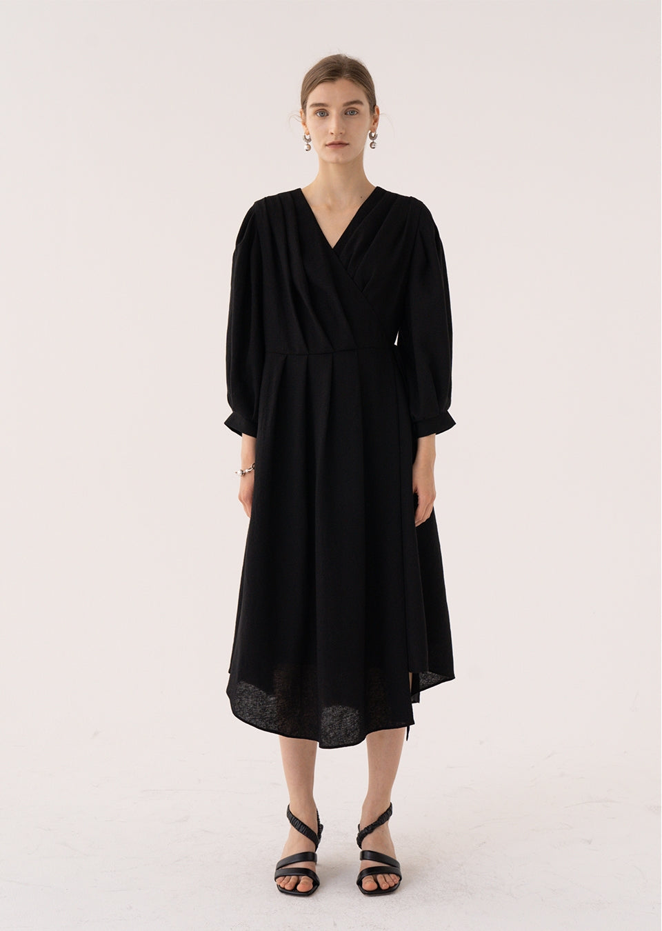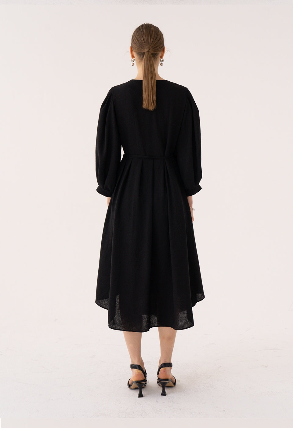 Crafted from breathable premium linen, this wrap midi dress from Laura Ren merges timeless sophistication with modern ease. The softly structured silhouette features a graceful V-neckline and artfully gathered 3/4 length puff sleeves. A gently flared skirt adds movement and femininity, making this piece perfect for warm-weather dressing or transitional layering. The high-quality linen ensures all-day comfort and effortless elegance for any occasion. Whether worn casually or dressed up, this versatile midi dress highlights Laura Ren's signature attention to detail and refined aesthetic.
