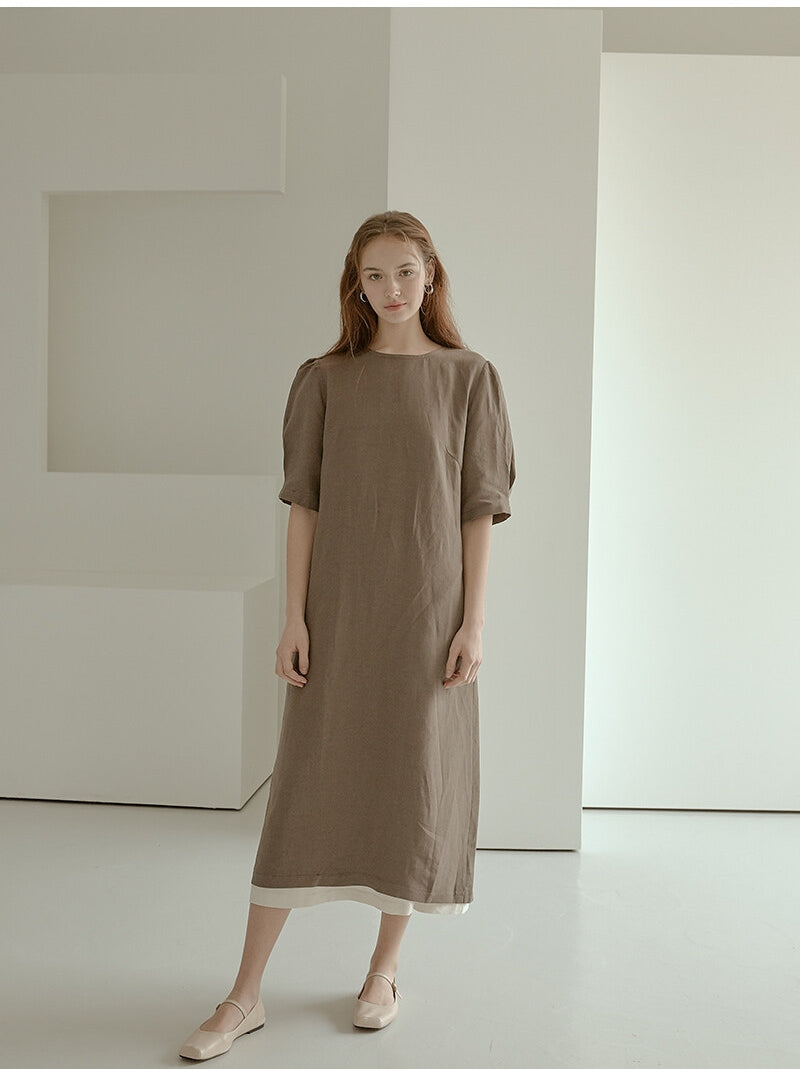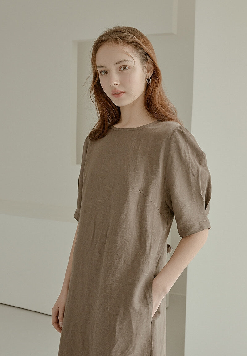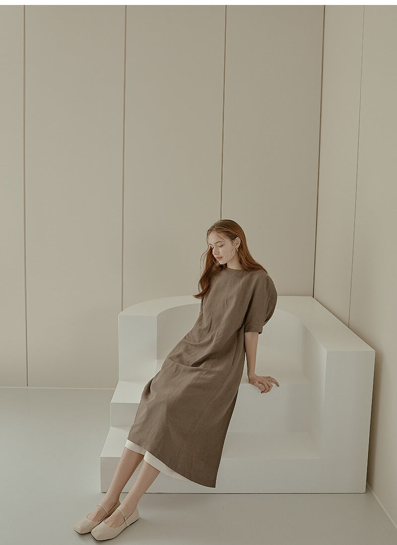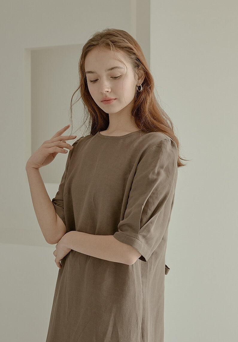 Elevate your wardrobe with this elegant puff sleeve midi dress crafted from breathable premium linen. The timeless silhouette is softened by gentle pleats and a back tie detail, offering both comfort and understated sophistication. Designed by Laura Ren, this dress features half sleeves and a relaxed fit that skims the body effortlessly, making it perfect for both casual days and refined occasions. The natural drape of the linen fabric enhances movement, while the minimalist structure brings out the purity of its design. A must-have staple for lovers of classic, contemporary fashion.