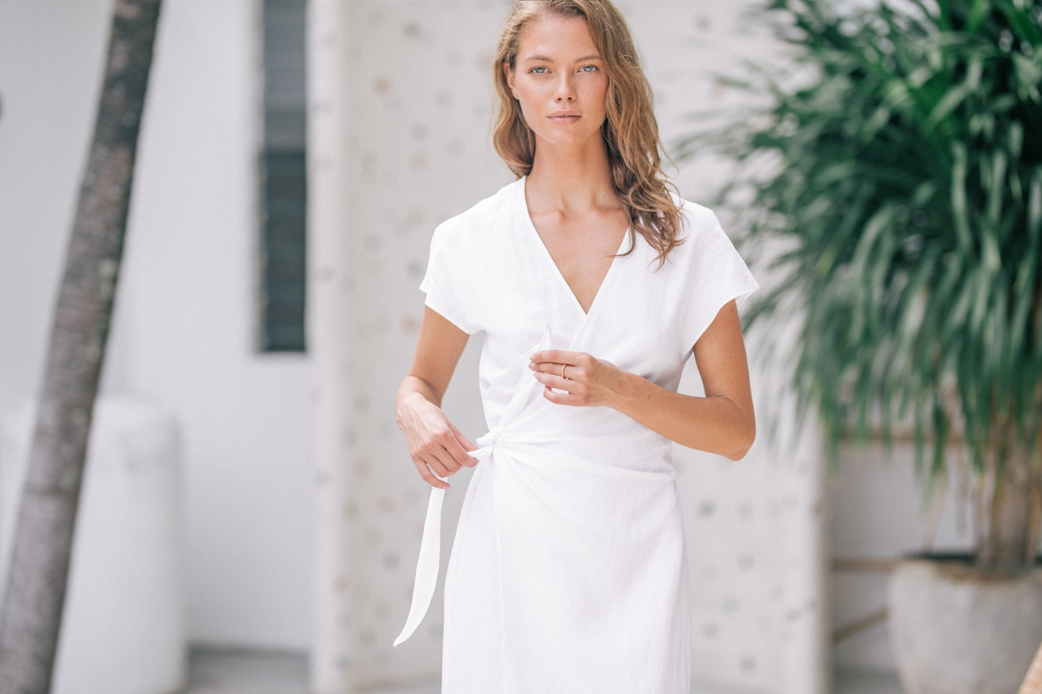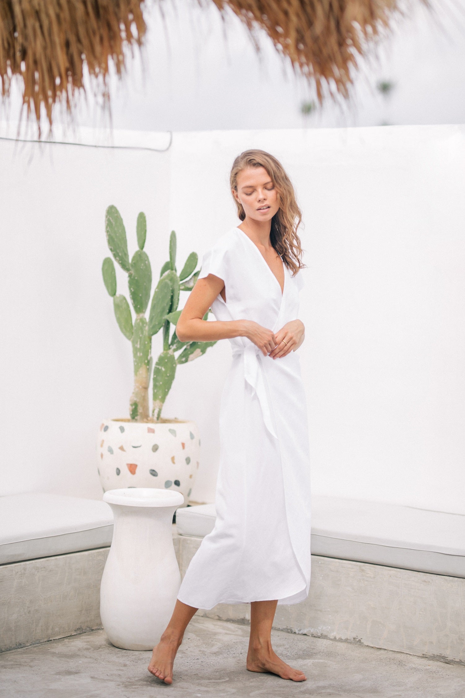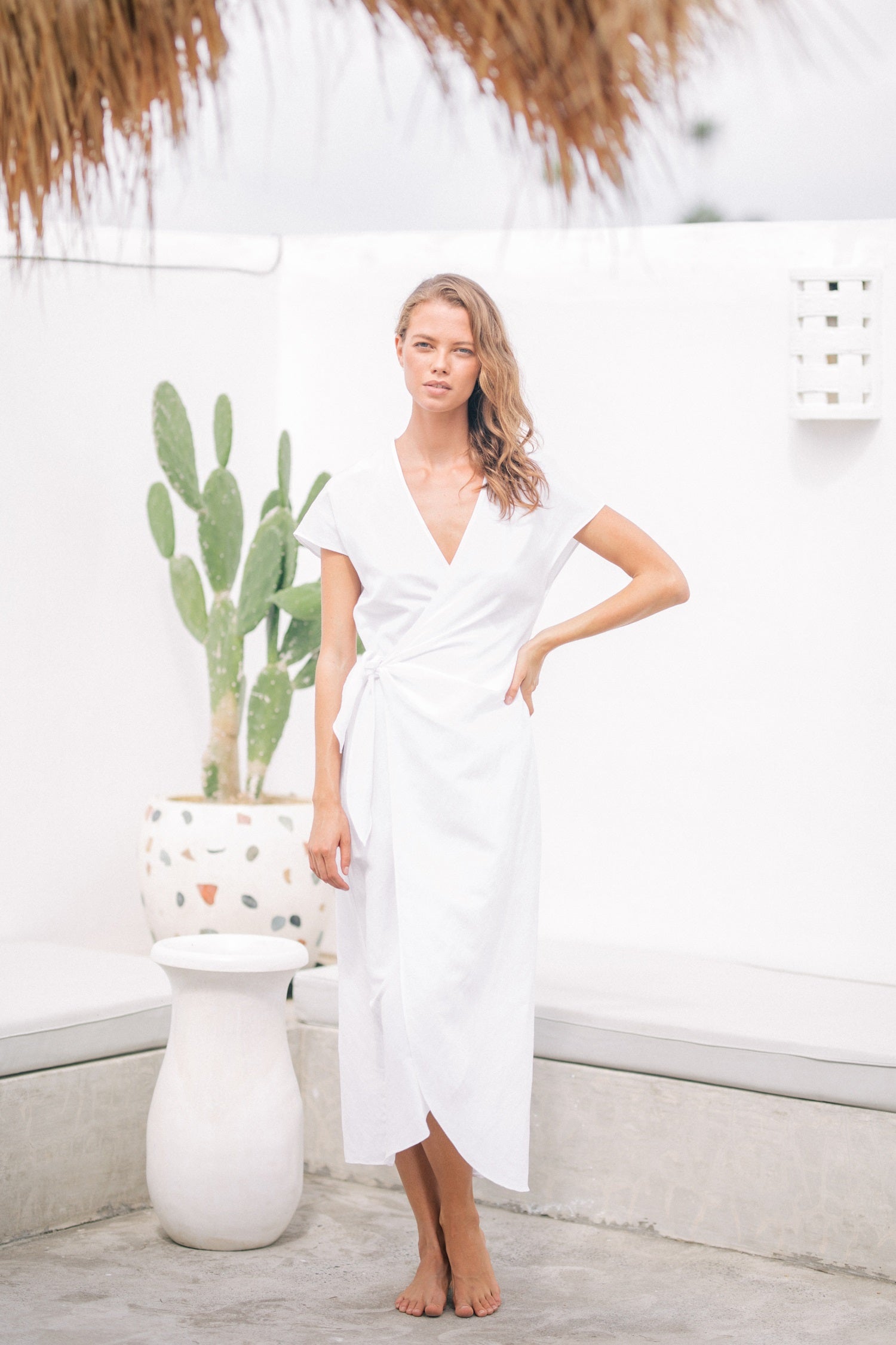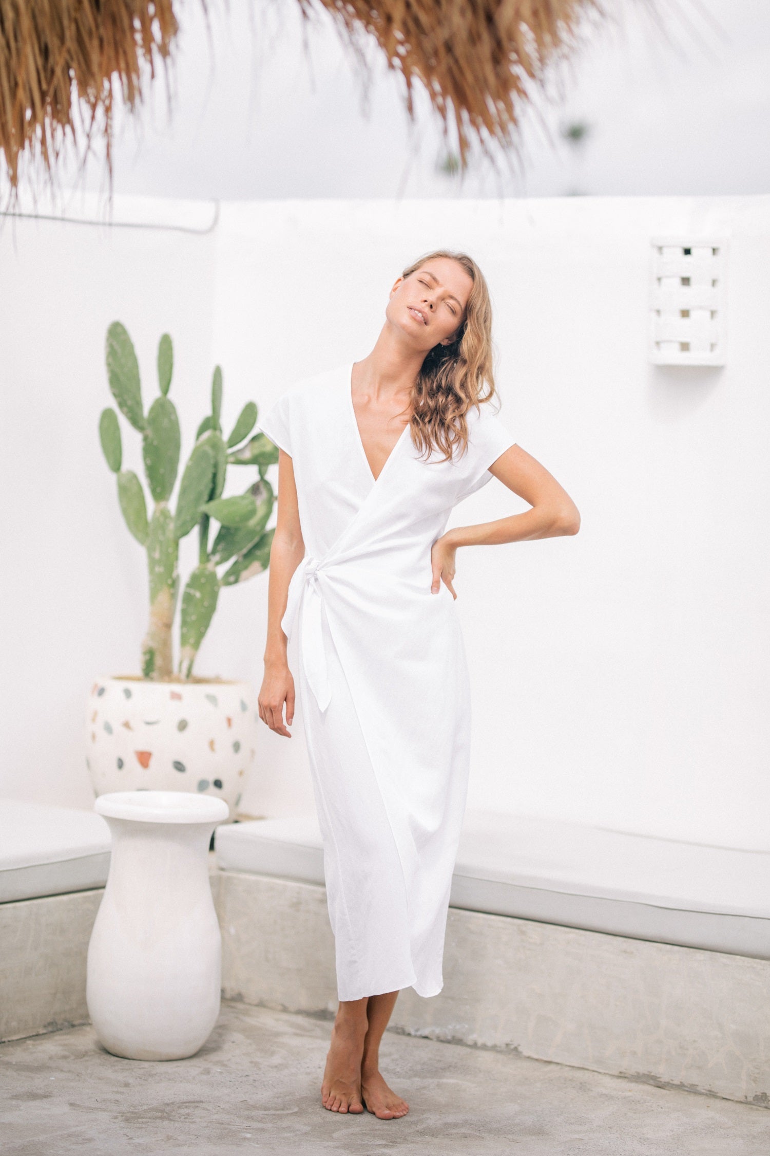 Laura Ren presents a refined midi dress crafted from 100% pure linen, designed to elevate your warm-weather wardrobe with effortless elegance. This wrap-style silhouette features soft cap sleeves, a flattering V-neckline, and a self-tie waist for a customizable fit. The breathable linen fabric ensures all-day comfort, while the timeless design transitions seamlessly from day to evening. Ideal for resort escapes, summer soirées, or simply embracing understated luxury at home. A piece that embodies grace, comfort, and contemporary minimalism.