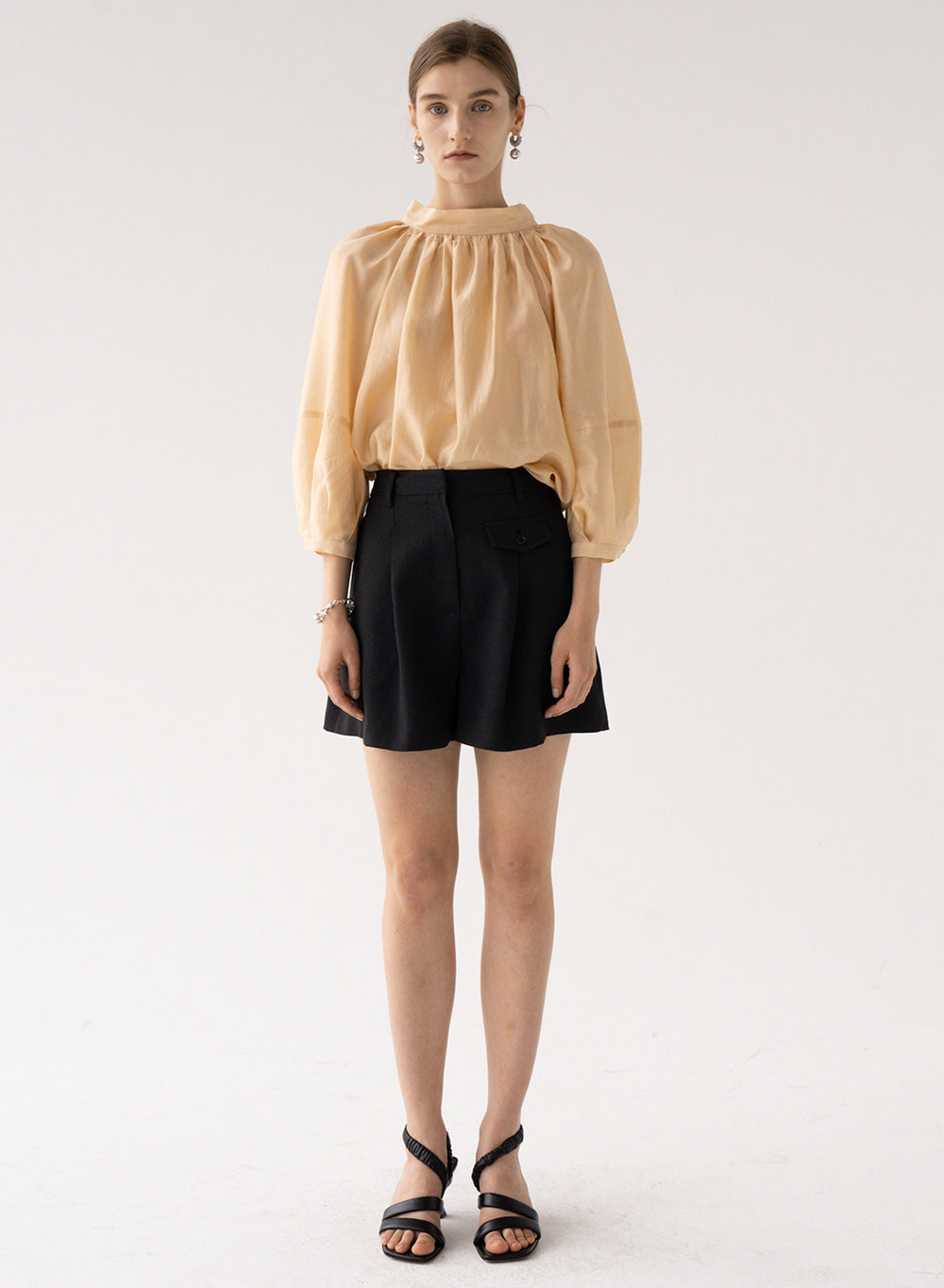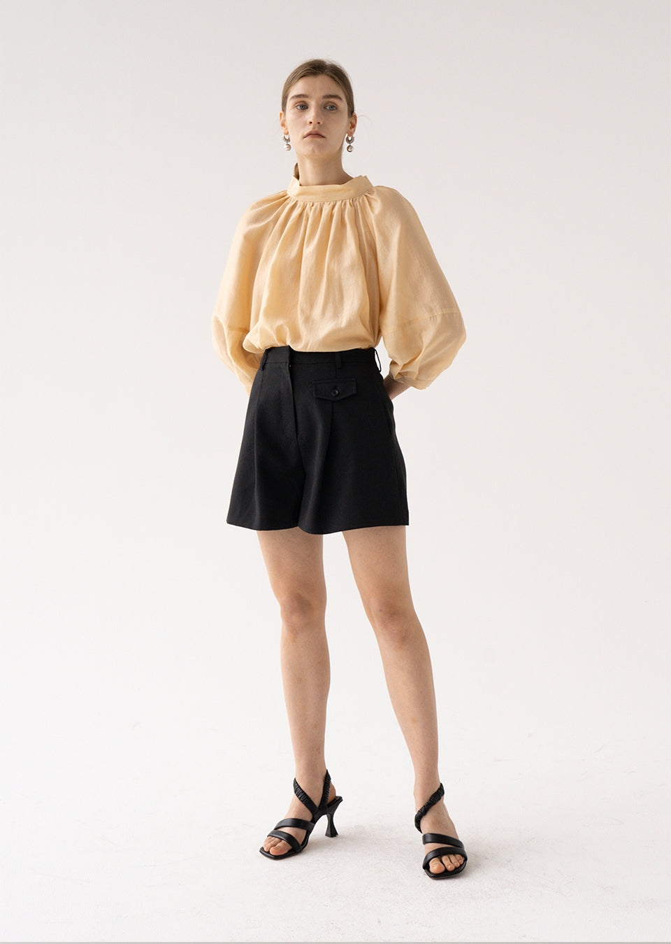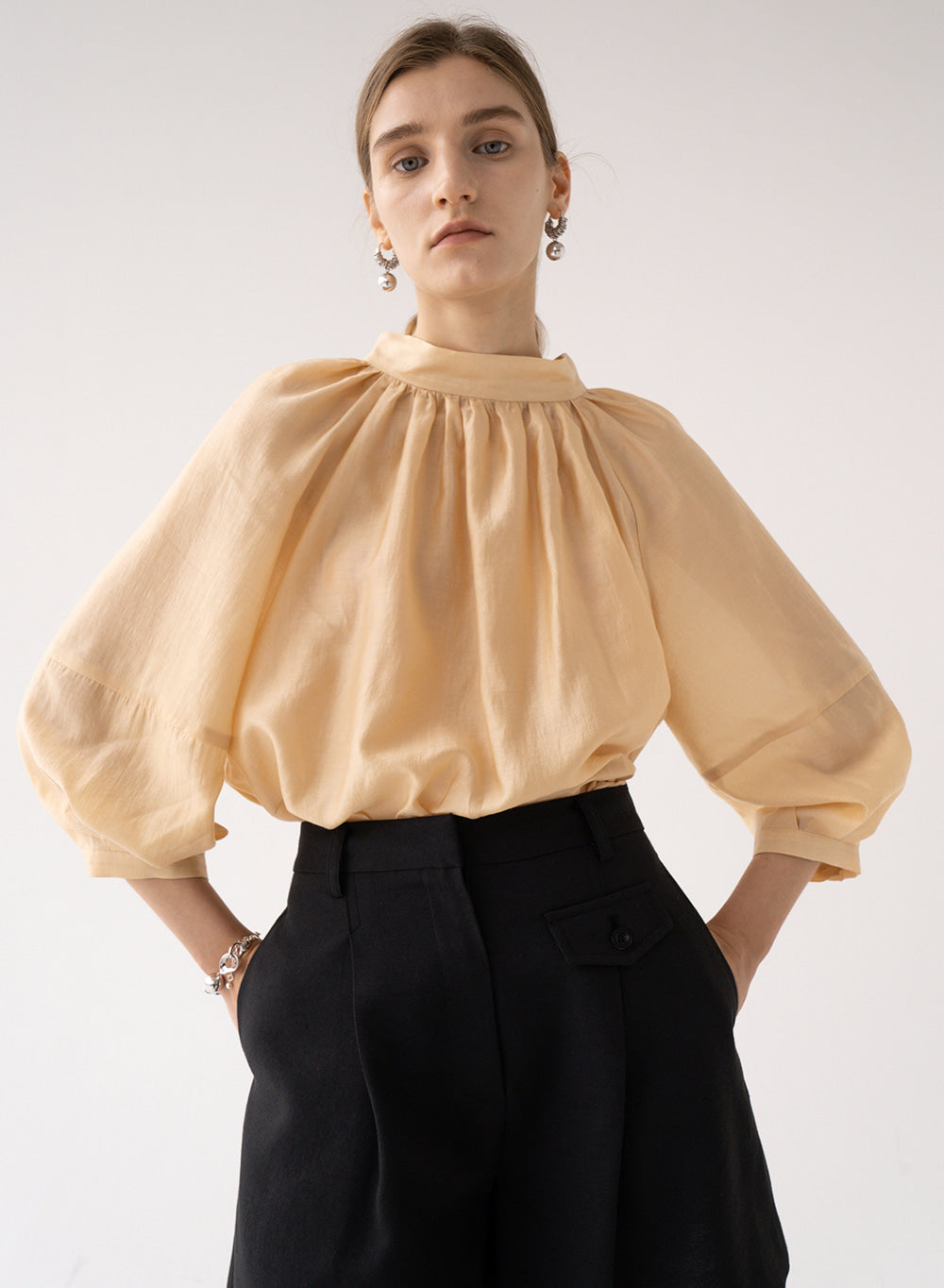 This gathered high-neck linen blouse by Laura Ren channels modern femininity through graceful volume and minimal structure. Made from breathable, natural linen, the design features a softly gathered neckline, voluminous 3/4 sleeves, and a relaxed drape that flatters without compromising comfort. The fluid silhouette is ideal for effortless daytime elegance, yet can be tucked into tailored pieces for elevated styling. Laura Ren’s expert construction and timeless sensibility make this blouse a wardrobe essential, perfect for transitional seasons and versatile outfitting.
