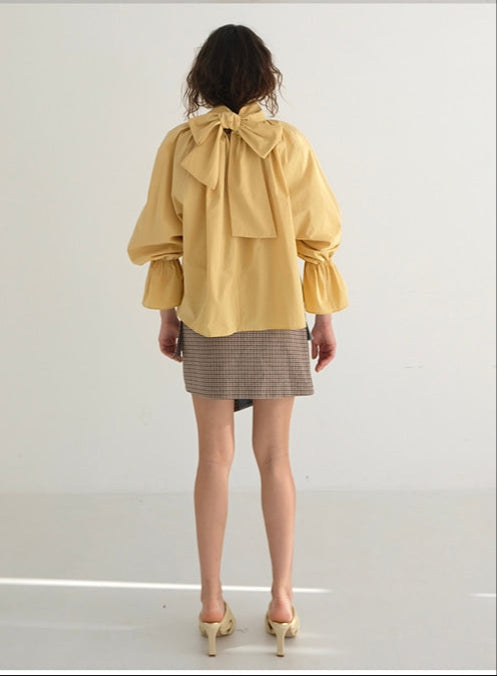 Laura Ren presents a voluminous statement blouse crafted from breathable linen, tailored for effortless elegance. This gathered-sleeve design features a wide ruffle neckline and a sculptural silhouette that moves gracefully with the body. A dramatic oversized bow at the back lends romantic flair, while elasticated cuffs create a soft balloon effect. Whether paired with a structured mini skirt or relaxed trousers, this linen blouse is a versatile staple for modern feminine dressing. The Laura Ren design ethos blends ease with architectural refinement, making it perfect for warm-weather elegance or transitional layering.