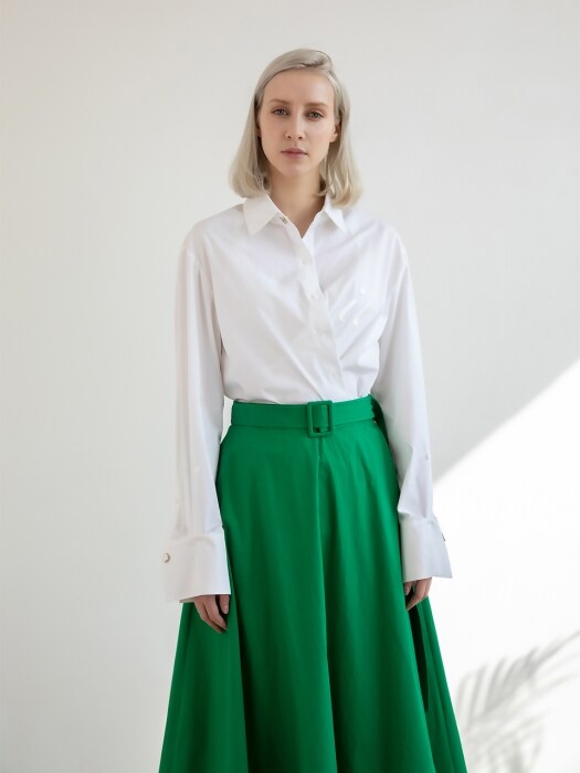 Laura Ren presents a statement linen skirt designed for effortless elegance and everyday comfort. Crafted from breathable linen, this high-waisted A-line silhouette features a wide, flared hem and a matching fabric belt that cinches the waist for a flattering fit. The crisp structure is softened with pleated detailing and practical side pockets, making it as functional as it is graceful. Perfect for pairing with tucked-in shirts or fitted knits, this skirt brings movement and modernity to your wardrobe. Elevate your seasonal style with the timeless appeal of Laura Ren’s linen collection.