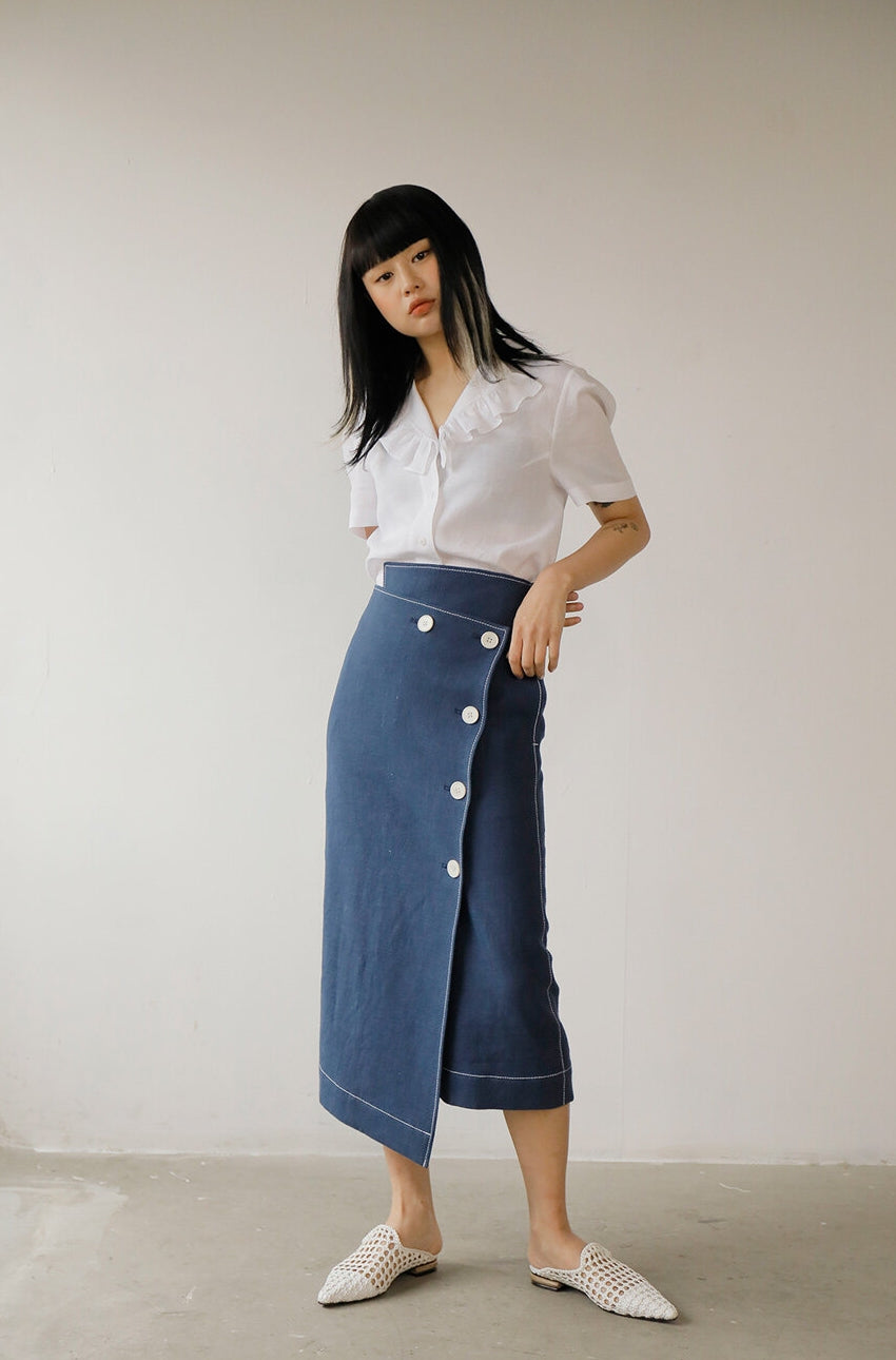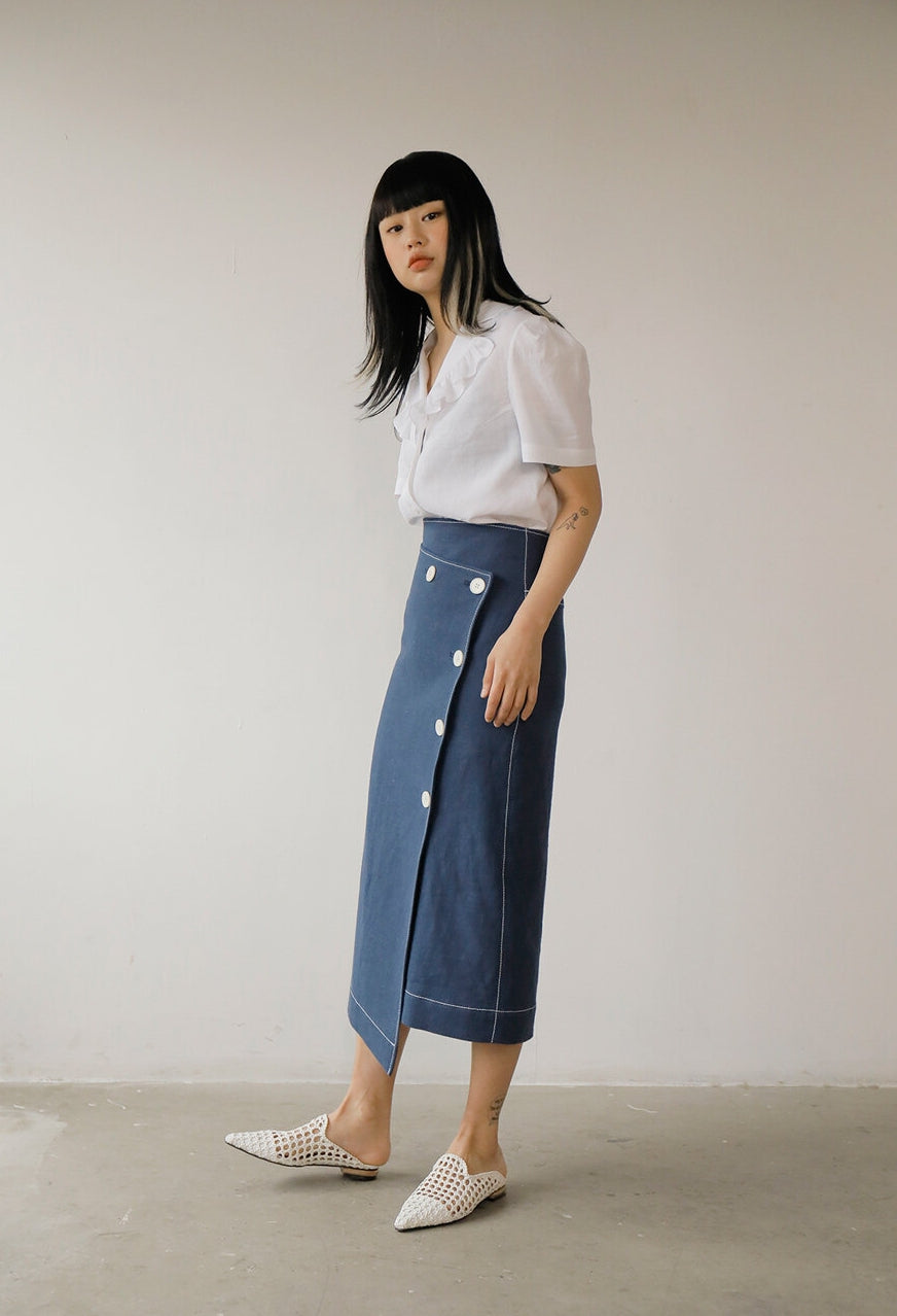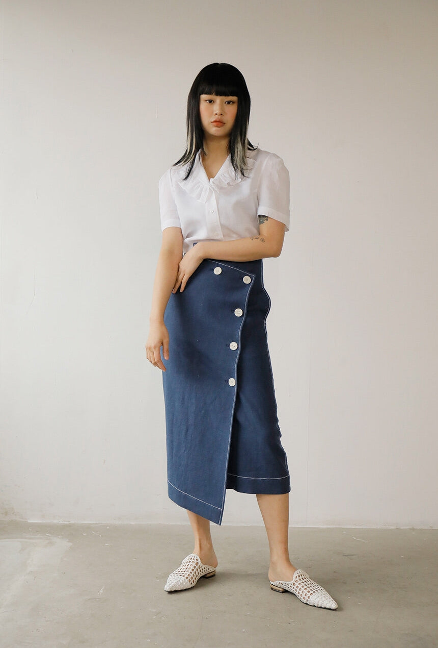 This tailored midi skirt from Laura Ren is crafted from premium cotton denim, offering both structure and breathability. Featuring a high-rise waist and an elegant asymmetric front button closure, this skirt flatters the silhouette while adding contemporary flair. The structured cut and contrast stitching elevate the timeless denim aesthetic, making it a perfect choice for refined daytime looks or understated evenings out. Designed with functional side pockets and a modest hemline, it effortlessly combines utility and style. Pair it with minimalist blouses or crisp shirts for a versatile wardrobe essential.
