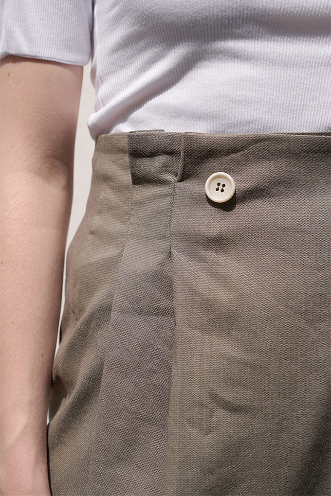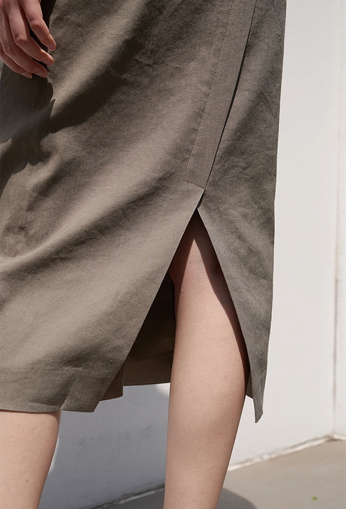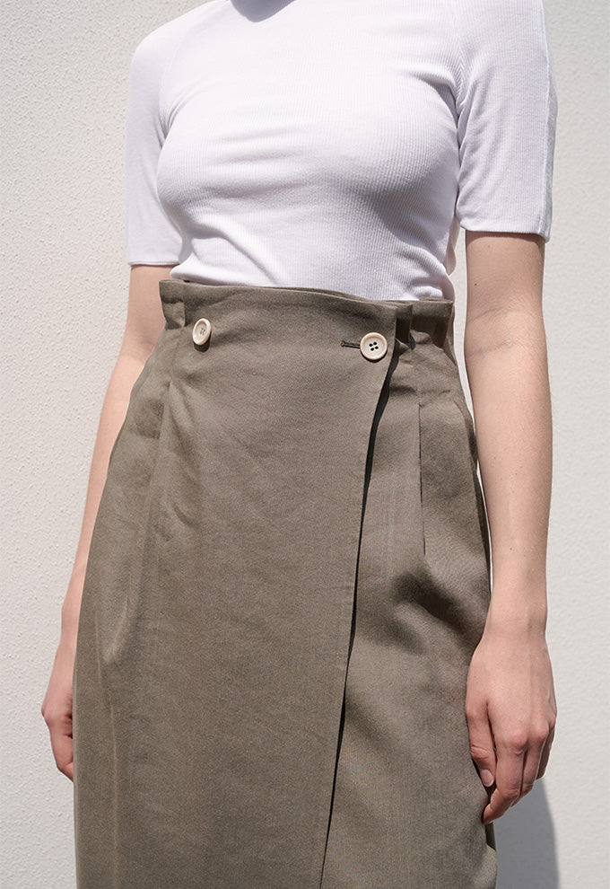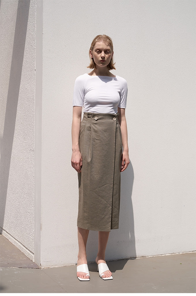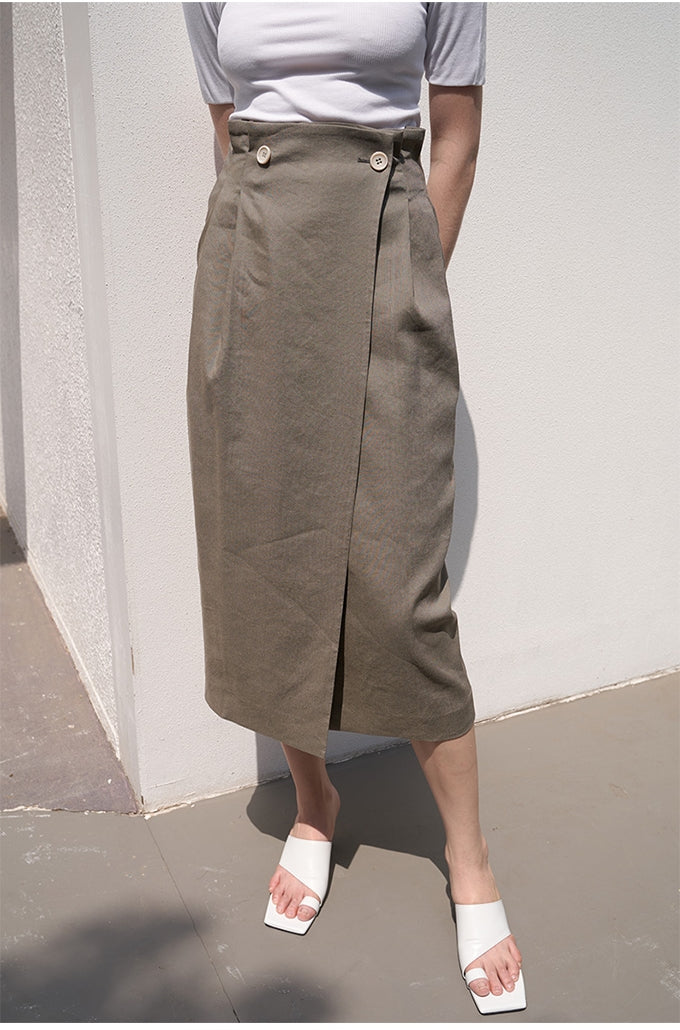 Crafted from breathable, premium linen, this elegant midi skirt by Laura Ren is designed for timeless sophistication and versatile styling. Featuring a high-waisted silhouette with a flattering wrap front secured by button detailing, it combines structure and ease. The back vent ensures comfort and graceful movement, while the clean lines and tailored fit make it ideal for both casual elegance and refined office wear. Pair it effortlessly with minimalist tops or structured blouses for a polished, seasonless look. Elevate your wardrobe with this essential linen skirt that captures understated luxury and effortless chic.