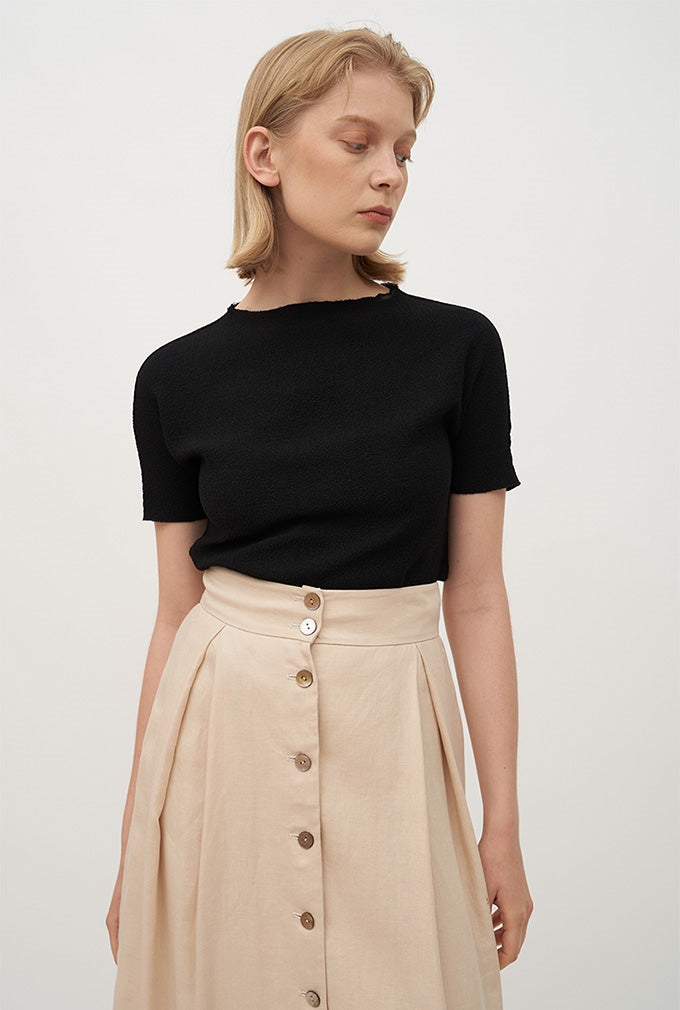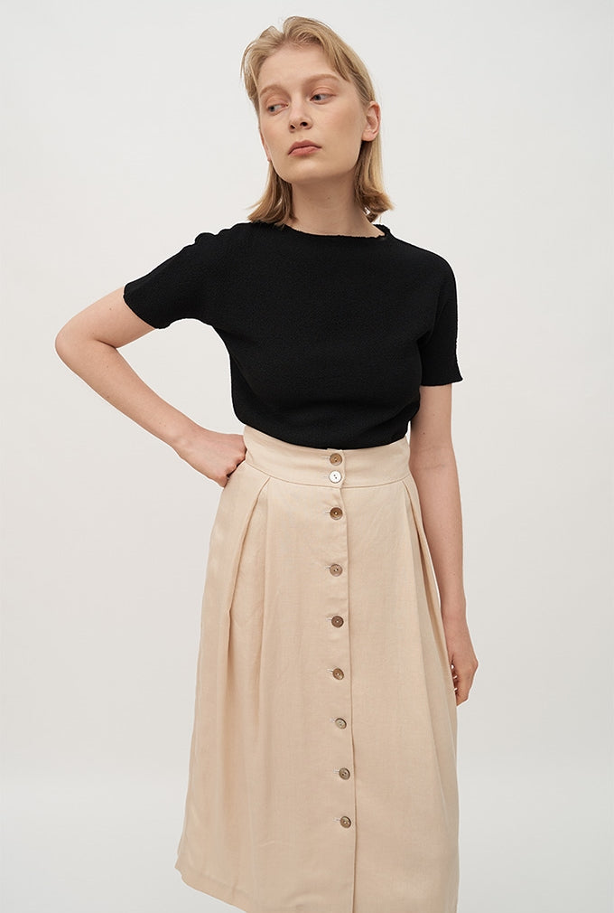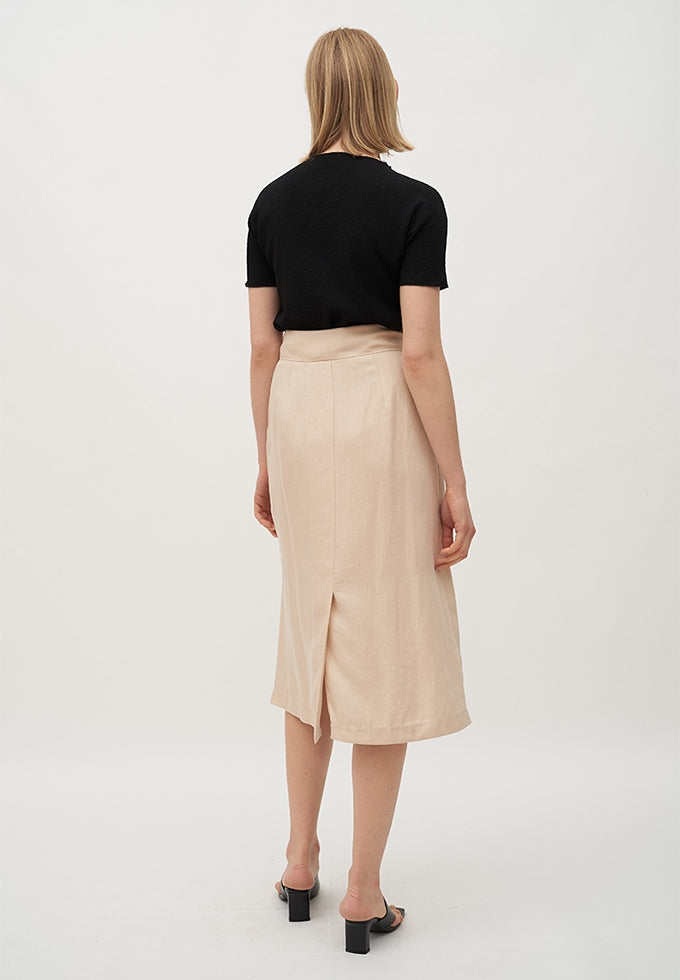 This high-waisted linen midi skirt by Laura Ren offers a polished silhouette with effortless everyday elegance. Crafted from a lightweight, breathable linen blend, it features a full button-down front, neatly tailored waistband, and gentle pleating for soft structure. A back slit adds comfort and fluidity to the slim A-line shape. Versatile and minimal, this skirt transitions from warm-weather office looks to relaxed weekend dressing with ease—perfect when paired with fine knits or crisp shirting.