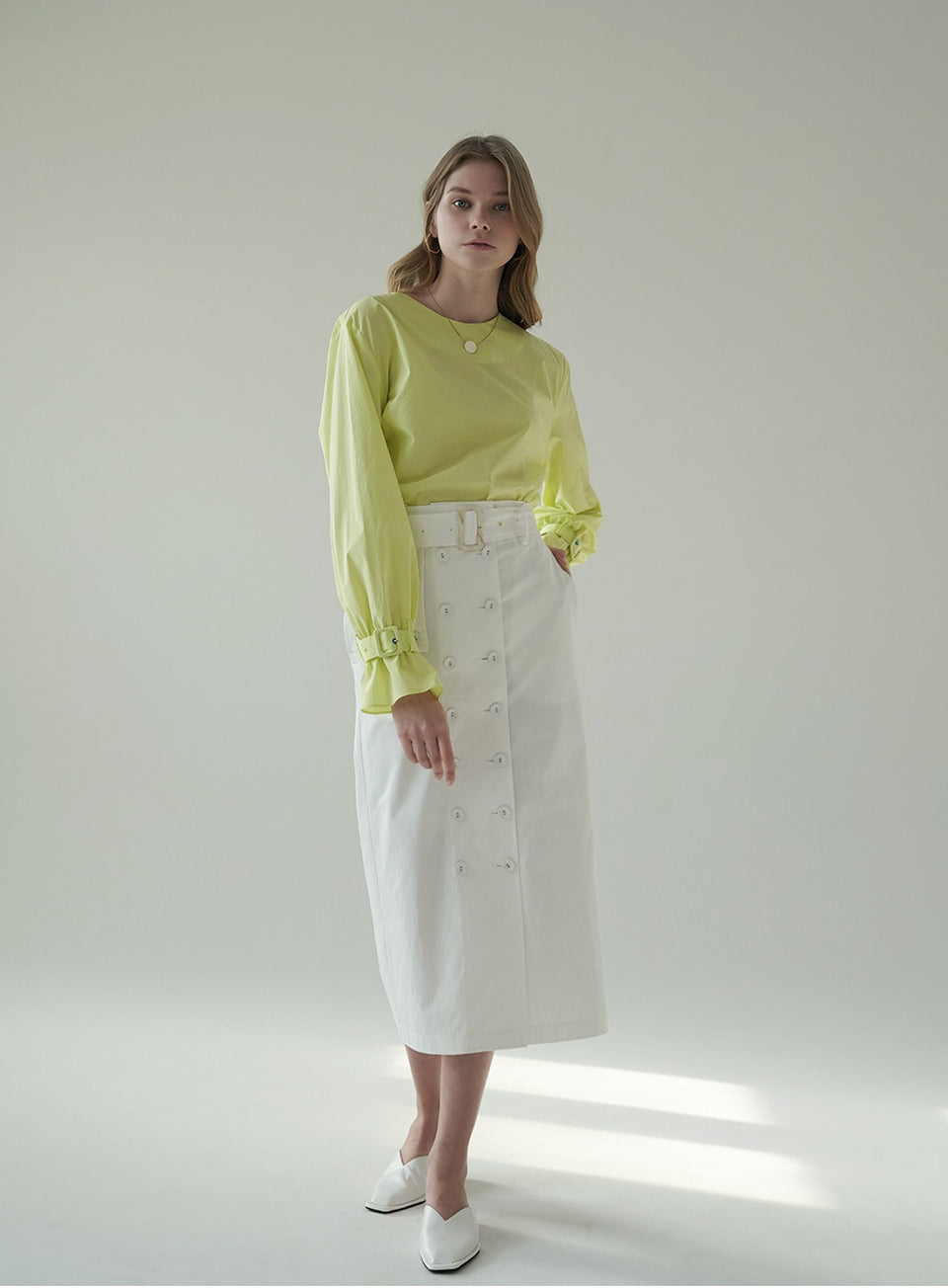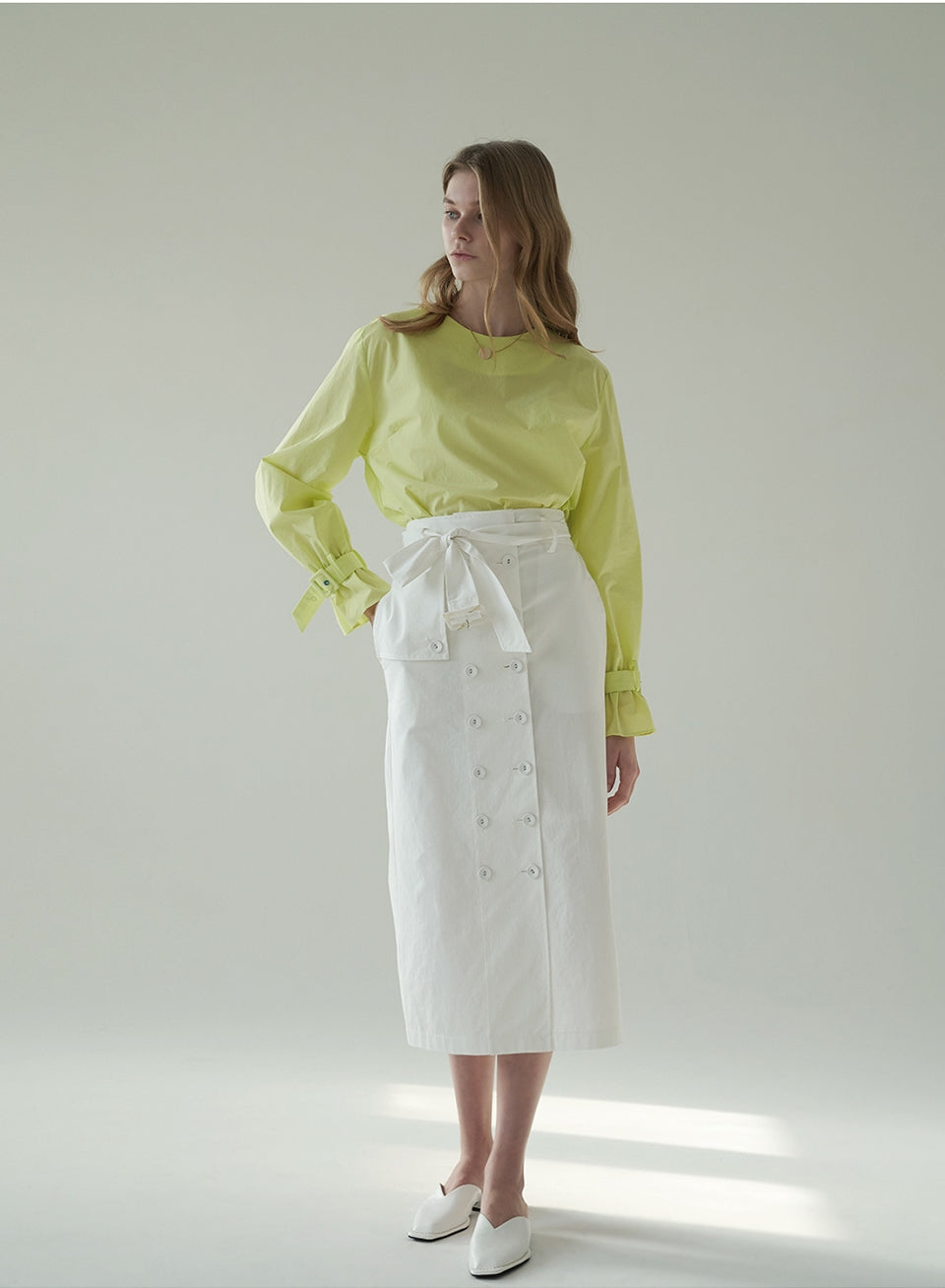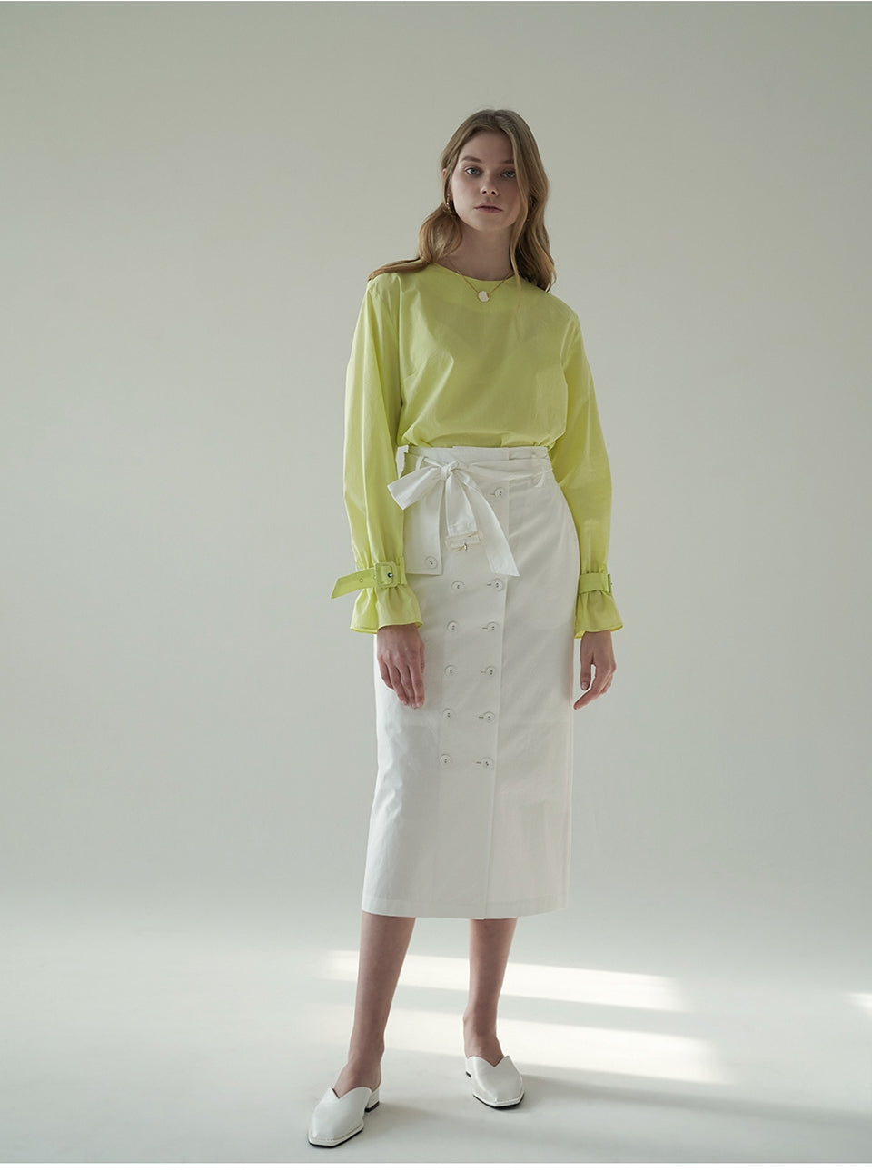 Crafted in crisp, breathable linen, this high-waisted midi skirt by Laura Ren offers a sophisticated update to warm-weather essentials. Featuring a statement wrap-style front with button detailing, a self-tie waist belt, and subtle side slits, this skirt blends structure with fluid femininity. Its tailored silhouette creates a polished yet relaxed look, ideal for both daytime elegance and evening refinement. The natural texture of linen ensures cool comfort, while the design reflects Laura Ren’s signature balance of modern minimalism and timeless chic. A refined staple for the contemporary wardrobe.