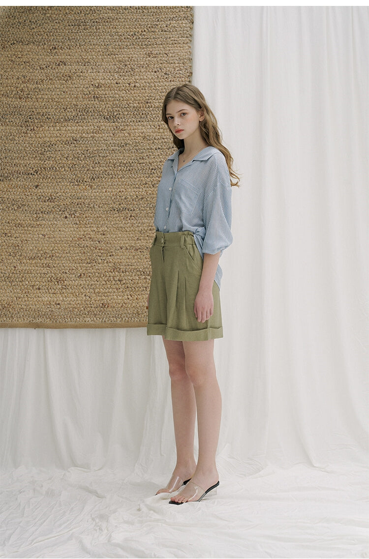 The high-waisted linen shorts by Laura Ren offer an easy blend of structure and softness for your warm-weather wardrobe. Crafted from breathable linen, these tailored shorts feature front pleats, a wide waistband with belt loops, and a clean button closure for a refined silhouette. Finished with rolled hems and side pockets, they strike the perfect balance between relaxed and polished. Ideal for casual outings or resort escapes, these shorts bring versatility and timeless elegance to any outfit. Pair them effortlessly with linen shirts or blouses for a coordinated summer look.