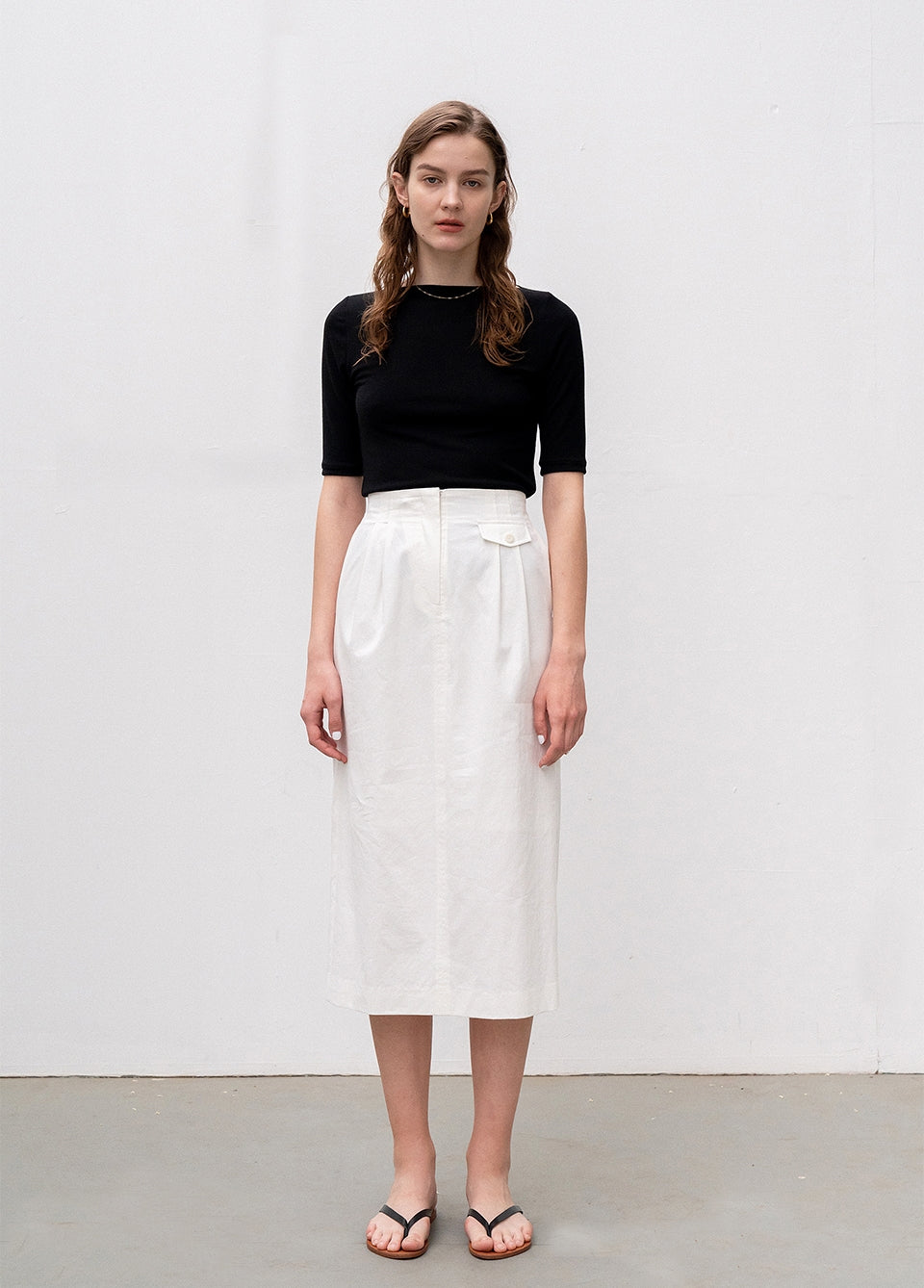 Experience refined everyday elegance with this high-waisted midi linen skirt by Laura Ren. Crafted from breathable, high-quality linen, this skirt offers a tailored silhouette with front pleats and a subtle back vent for graceful movement. The flattering waistband and soft structure enhance both comfort and sophistication, making it ideal for both casual and semi-formal styling. Versatile and timeless, this piece effortlessly transitions from workwear to weekend attire. Add this Laura Ren linen skirt to your collection for a blend of craftsmanship, minimalism, and modern femininity.
