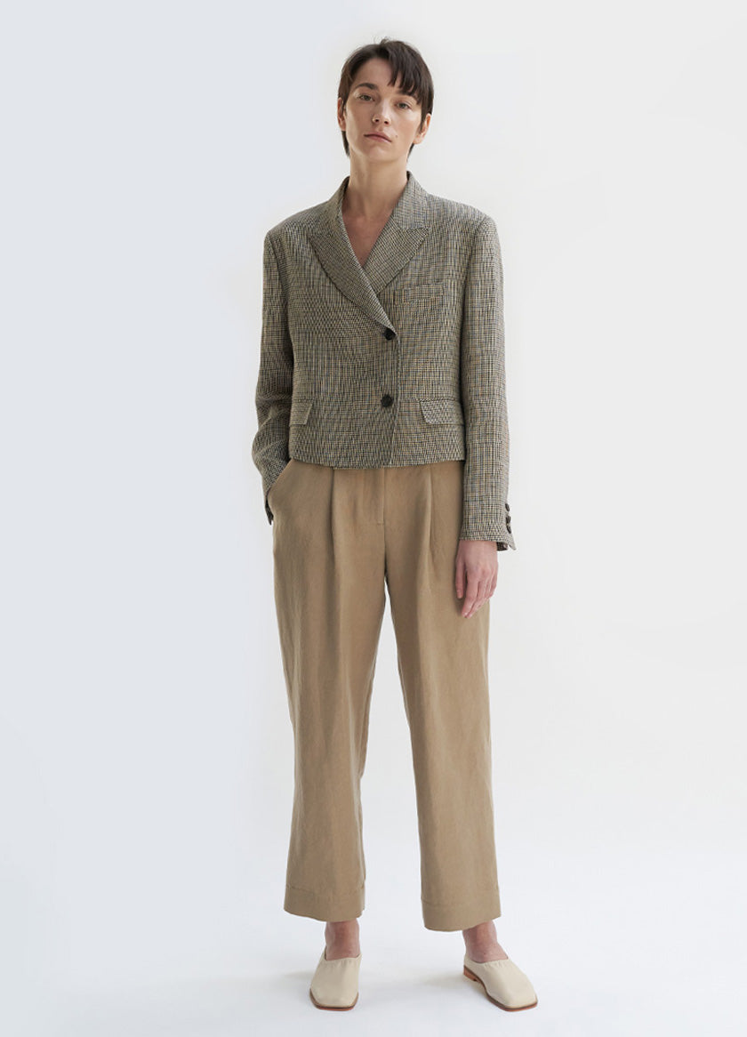The high-waisted linen pants from Laura Ren bring effortless tailoring to everyday dressing. Crafted from breathable linen with a soft structure, this silhouette is defined by front pleats, side slip pockets, and a tapered leg with neatly cuffed hems for a modern finish. The wide waistband and concealed front closure offer a flattering, minimalist line, while the ankle-grazing length makes these trousers ideal for both summer layering and refined workwear. Styled with heels or flats, they strike a perfect balance between structure and ease. Pair with the matching linen blazer or a tucked-in tank for a clean, contemporary outfit. Laura Ren ensures timeless appeal through elevated fabric and sharp construction.