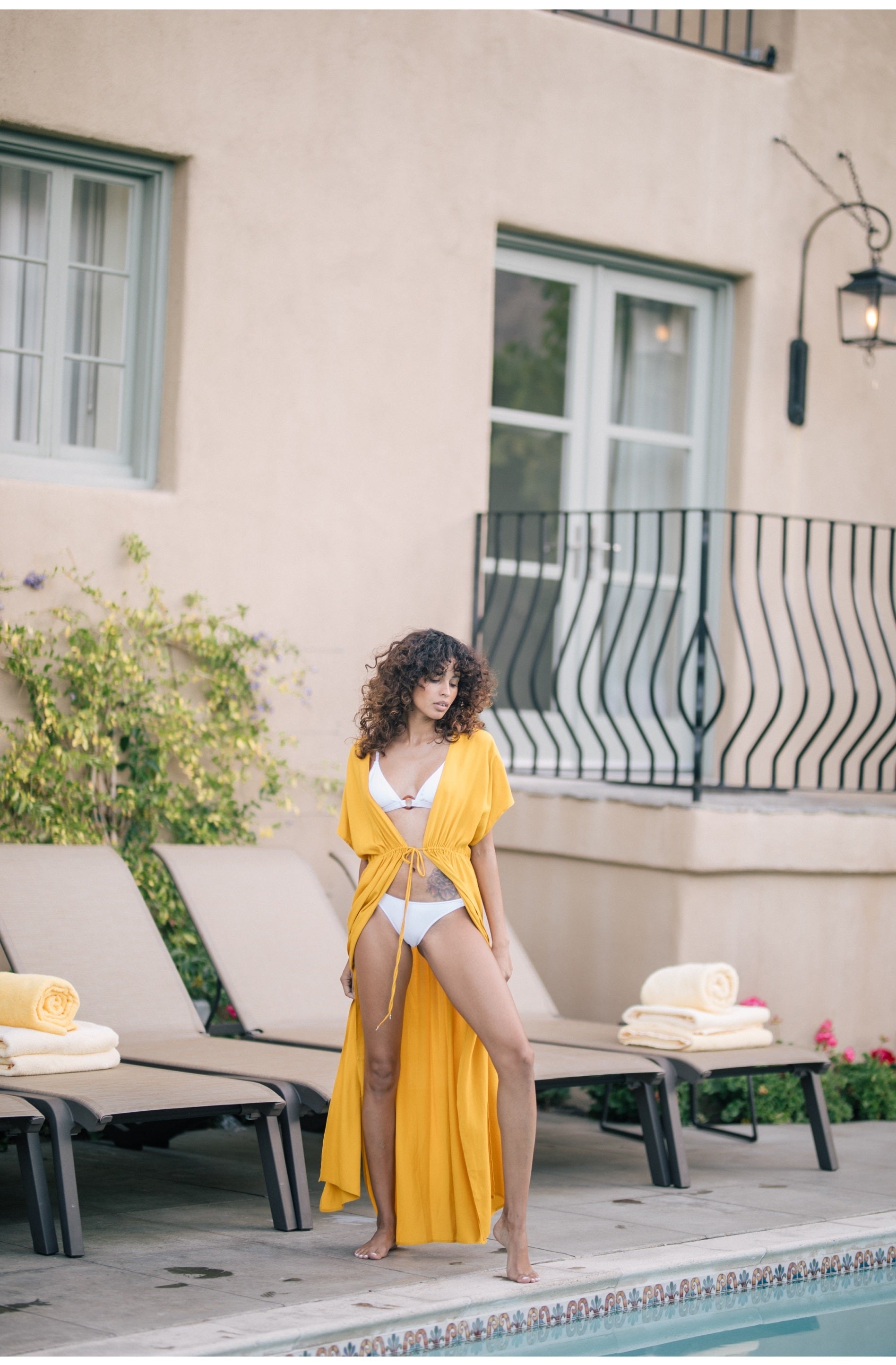 Laura Ren unveils the ultimate resort essential with this airy linen beach cover-up. Designed with a relaxed drape and breathable natural linen, it features a flattering V-neckline, adjustable front-tie closure, and soft cap sleeves. High side slits offer ease of movement and a glimpse of swimwear beneath, making it a perfect layering piece from poolside lounging to sunset walks. Lightweight and elegant, this cover-up brings refined simplicity to your beach wardrobe.