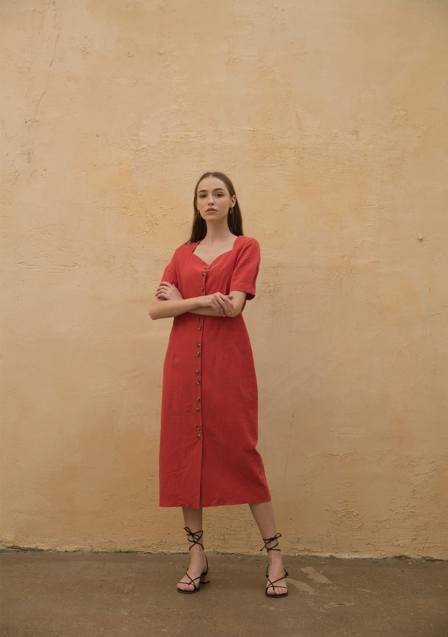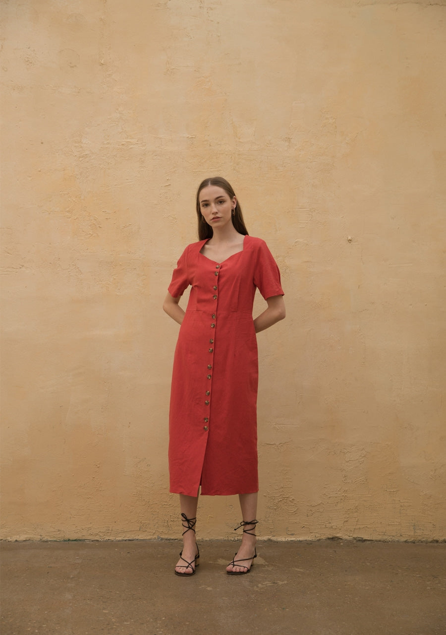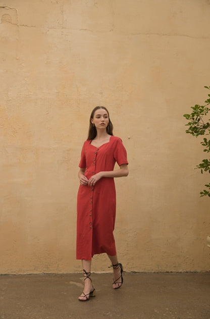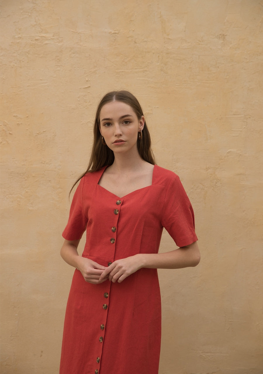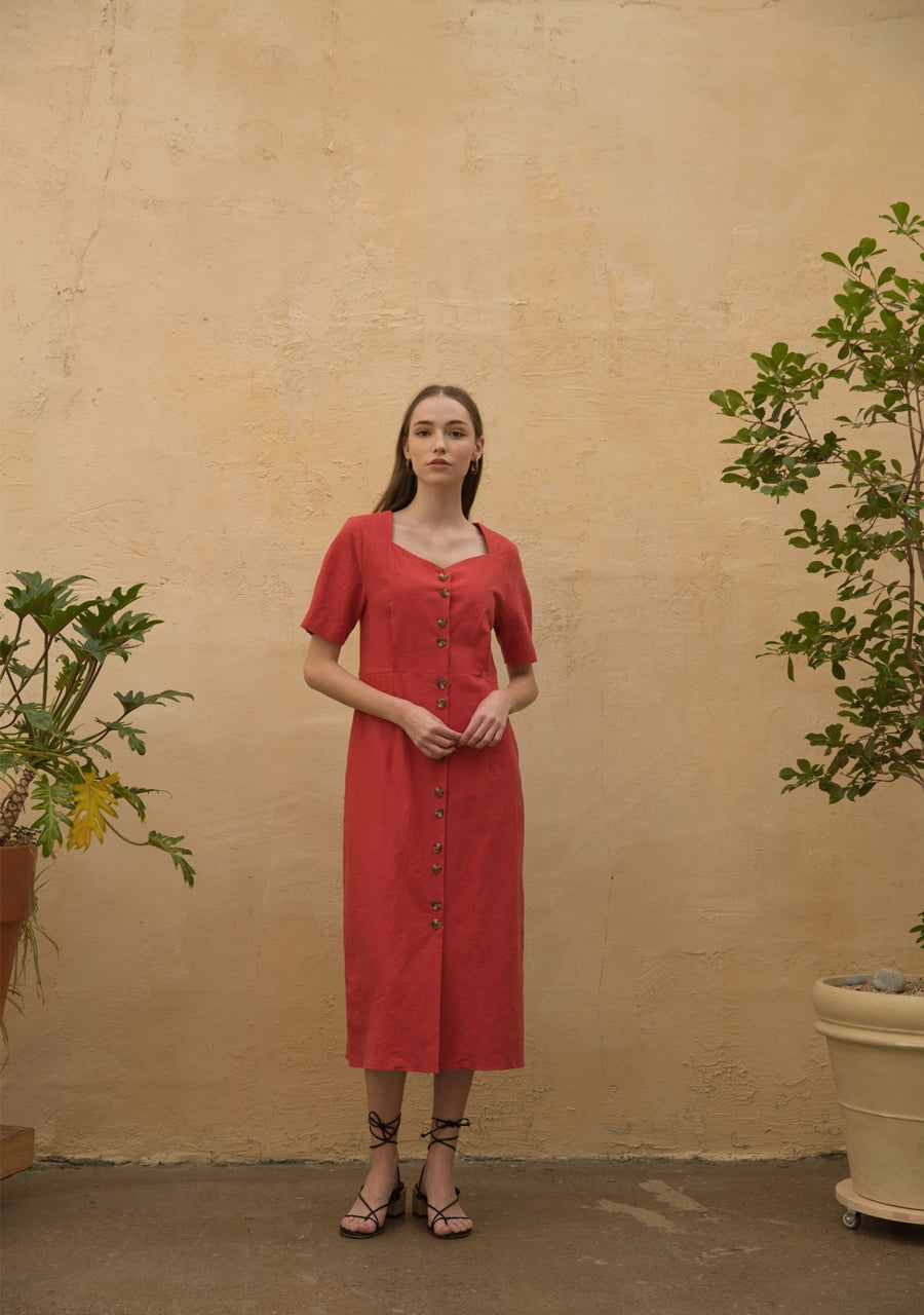 This Laura Ren linen midi dress exudes effortless elegance with its structured silhouette and clean lines. Crafted from breathable, natural linen, the design features a flattering square neckline, short sleeves, and a full-length button-front closure that adds a modern vintage charm. The fitted waist enhances the feminine form, while the midi length lends graceful movement. Whether styled for daytime outings or evening soirees, this dress delivers sophistication and versatility. Laura Ren brings refined tailoring and premium fabric together for timeless appeal in everyday luxury fashion.
