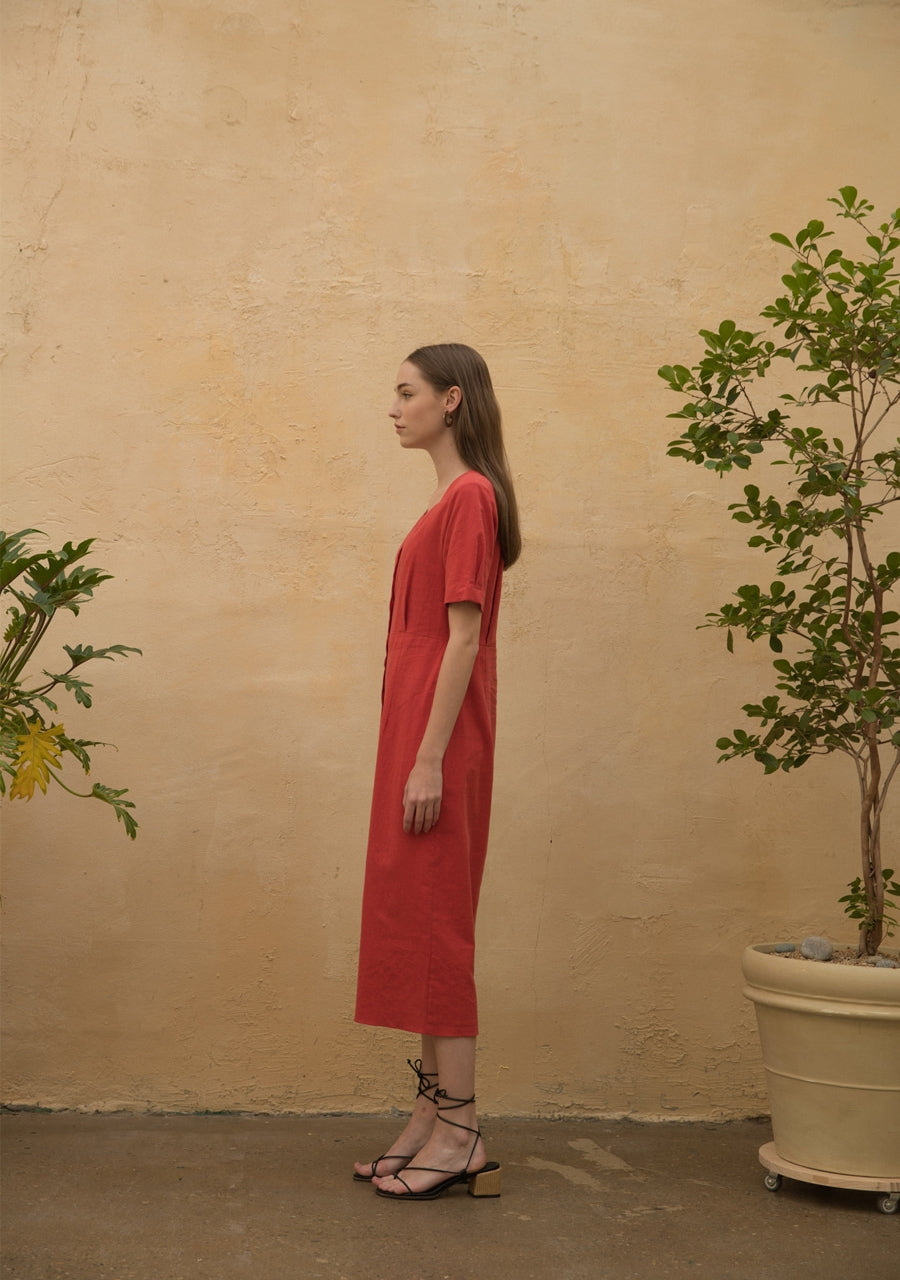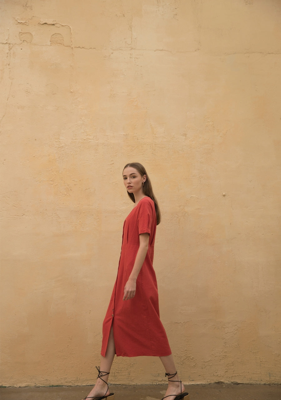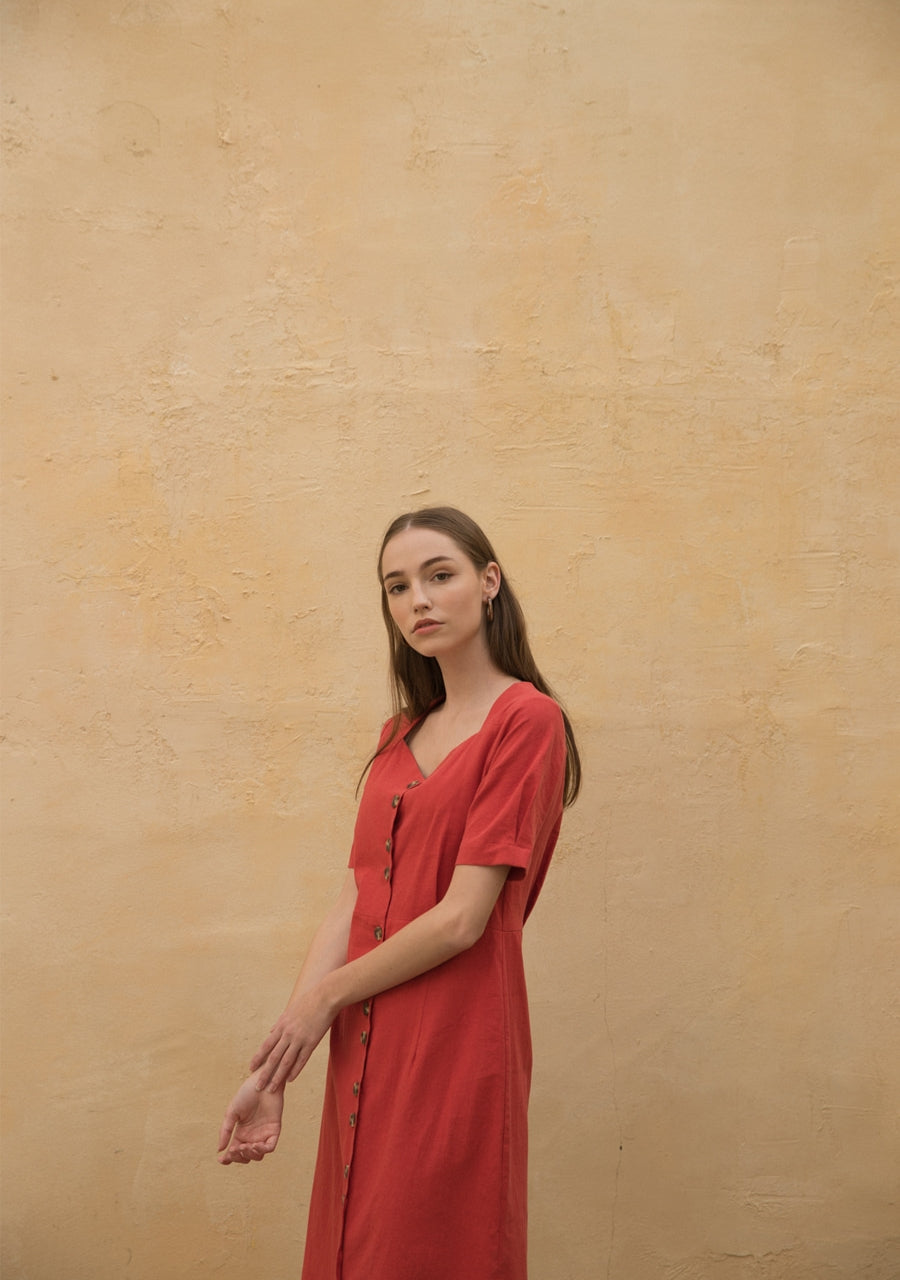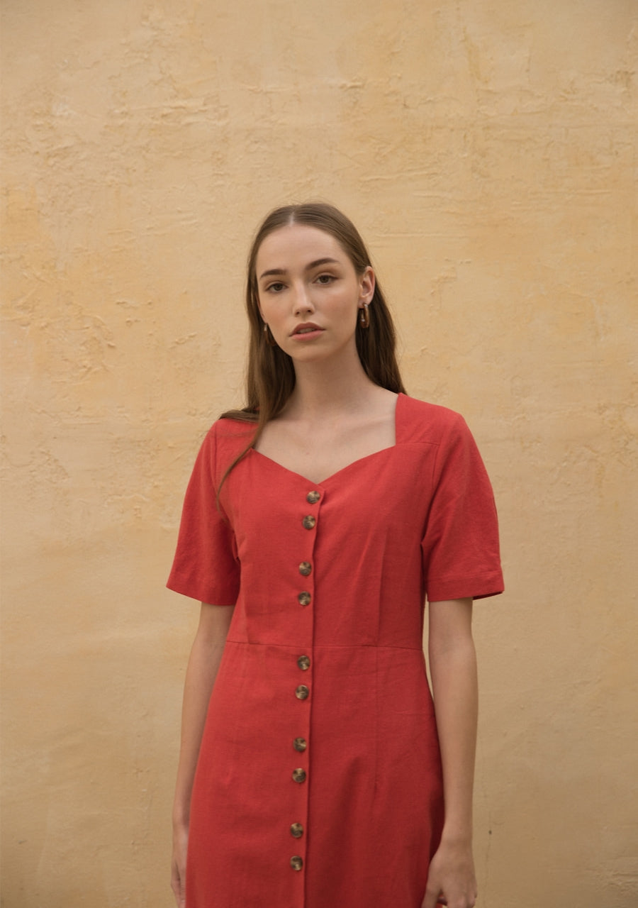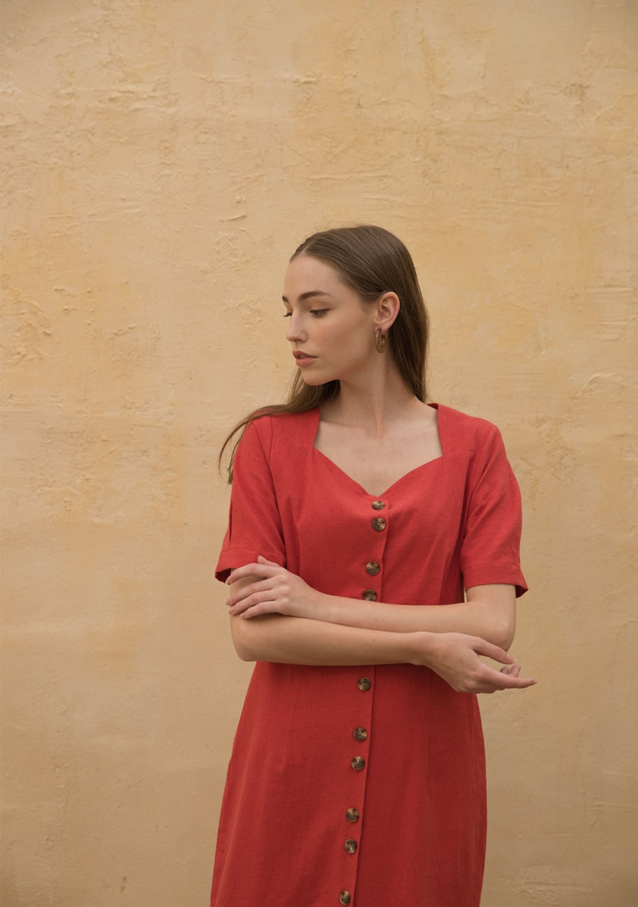 This Laura Ren linen midi dress exudes effortless elegance with its structured silhouette and clean lines. Crafted from breathable, natural linen, the design features a flattering square neckline, short sleeves, and a full-length button-front closure that adds a modern vintage charm. The fitted waist enhances the feminine form, while the midi length lends graceful movement. Whether styled for daytime outings or evening soirees, this dress delivers sophistication and versatility. Laura Ren brings refined tailoring and premium fabric together for timeless appeal in everyday luxury fashion.