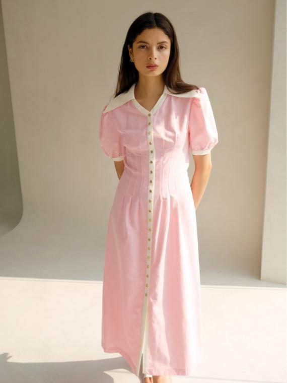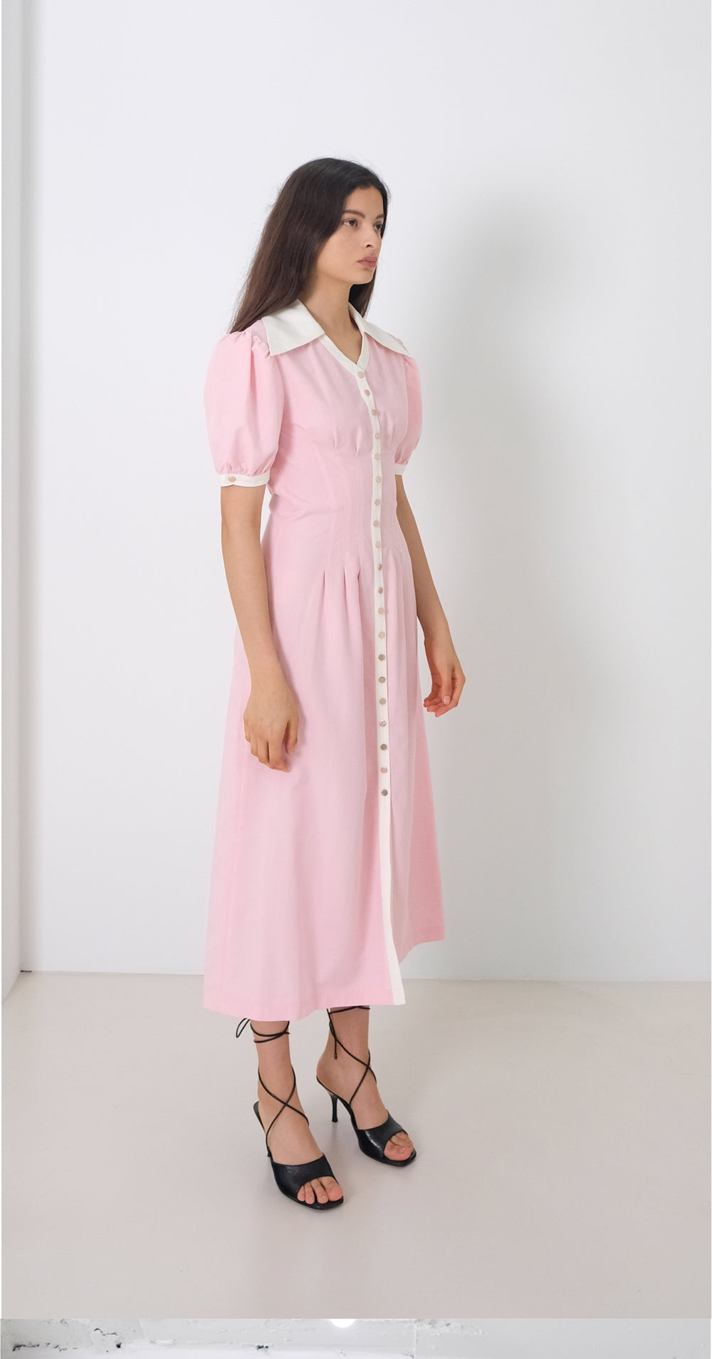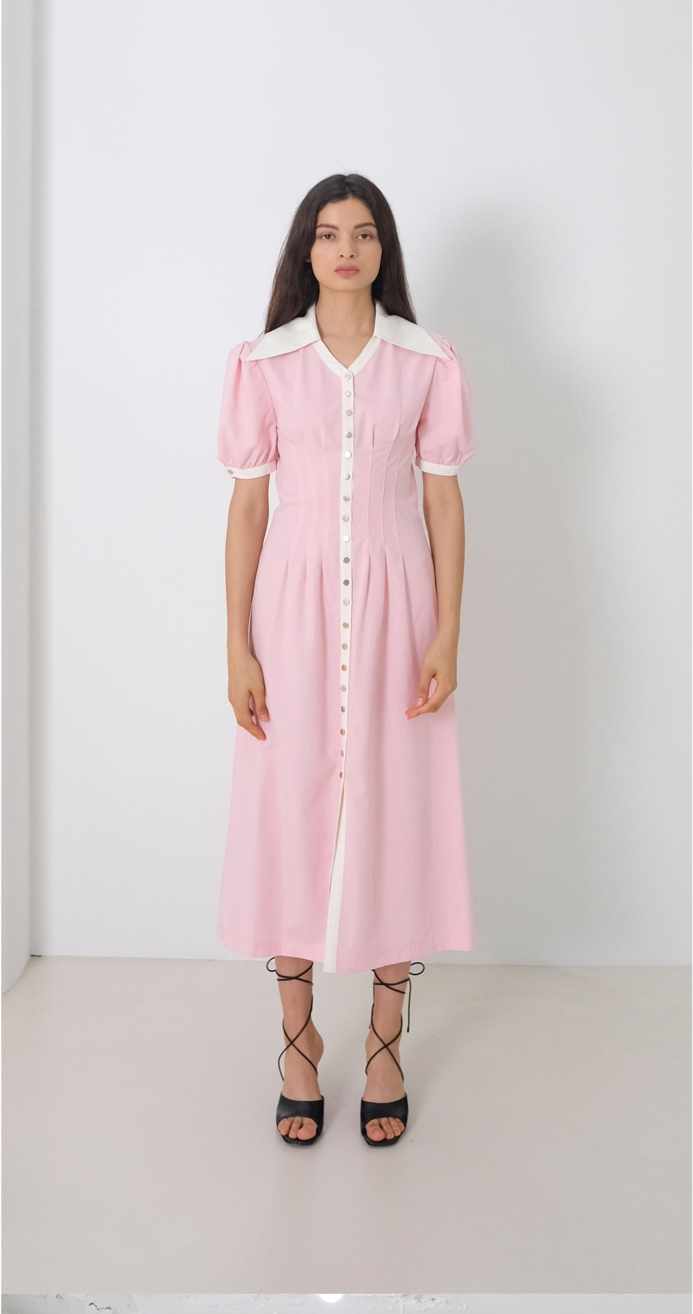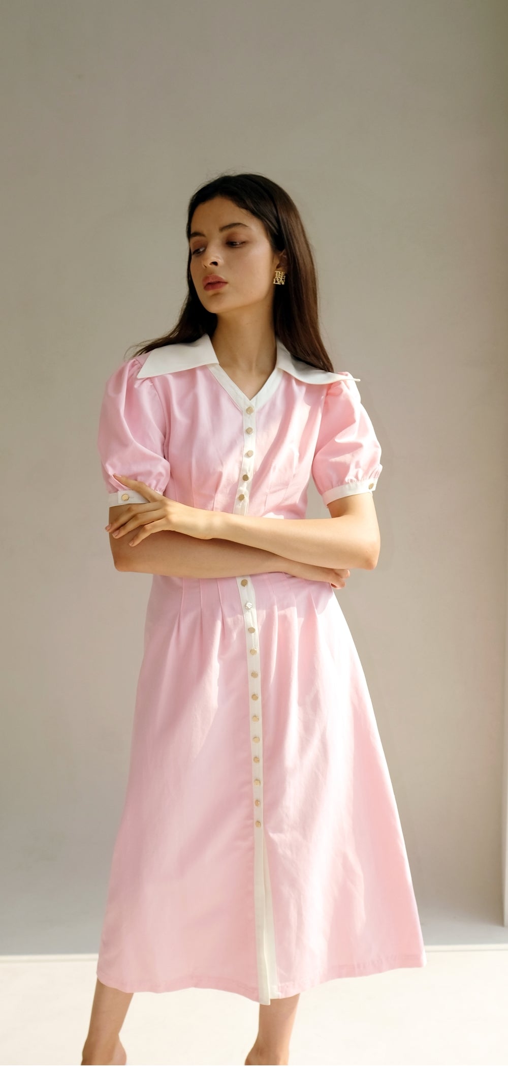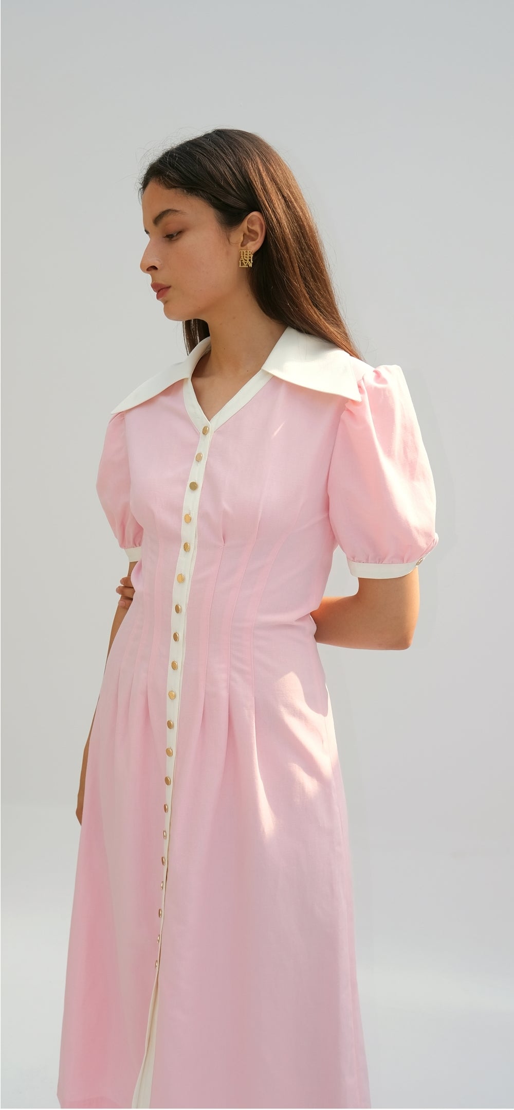 The Laura Ren linen midi dress is a refined silhouette designed with vintage inspiration and modern tailoring. Featuring a contrasting oversized collar and a full front button closure, this piece is crafted from breathable linen for effortless warm-weather elegance. Delicate puff sleeves and a softly flared midi hem enhance its feminine charm, while the structured seams provide a figure-enhancing fit. Ideal for garden parties, afternoon teas, or everyday sophistication, this linen dress blends classic tailoring with contemporary details for a polished look.