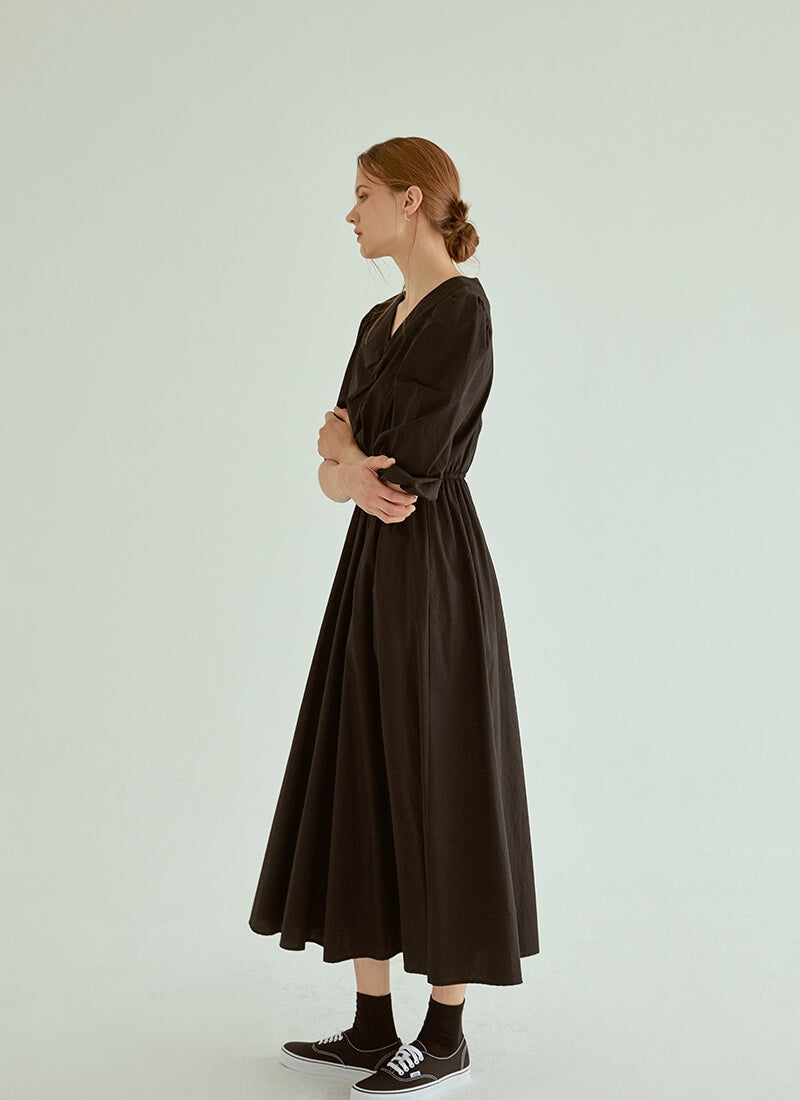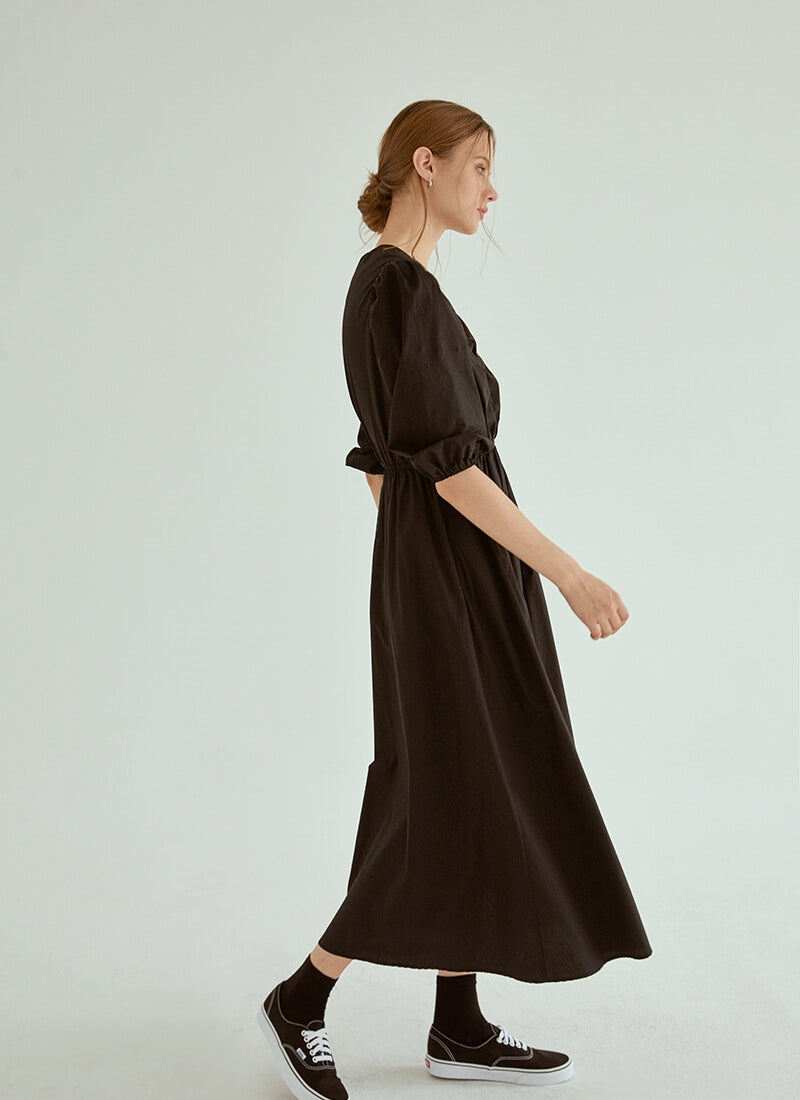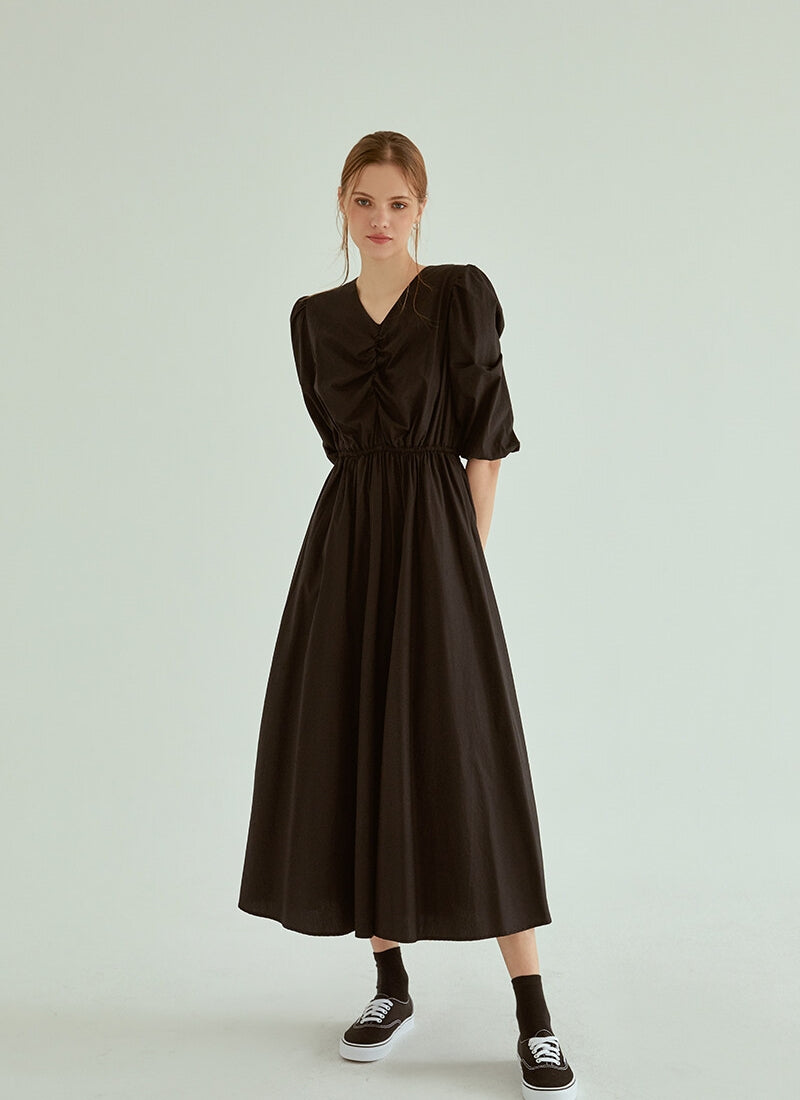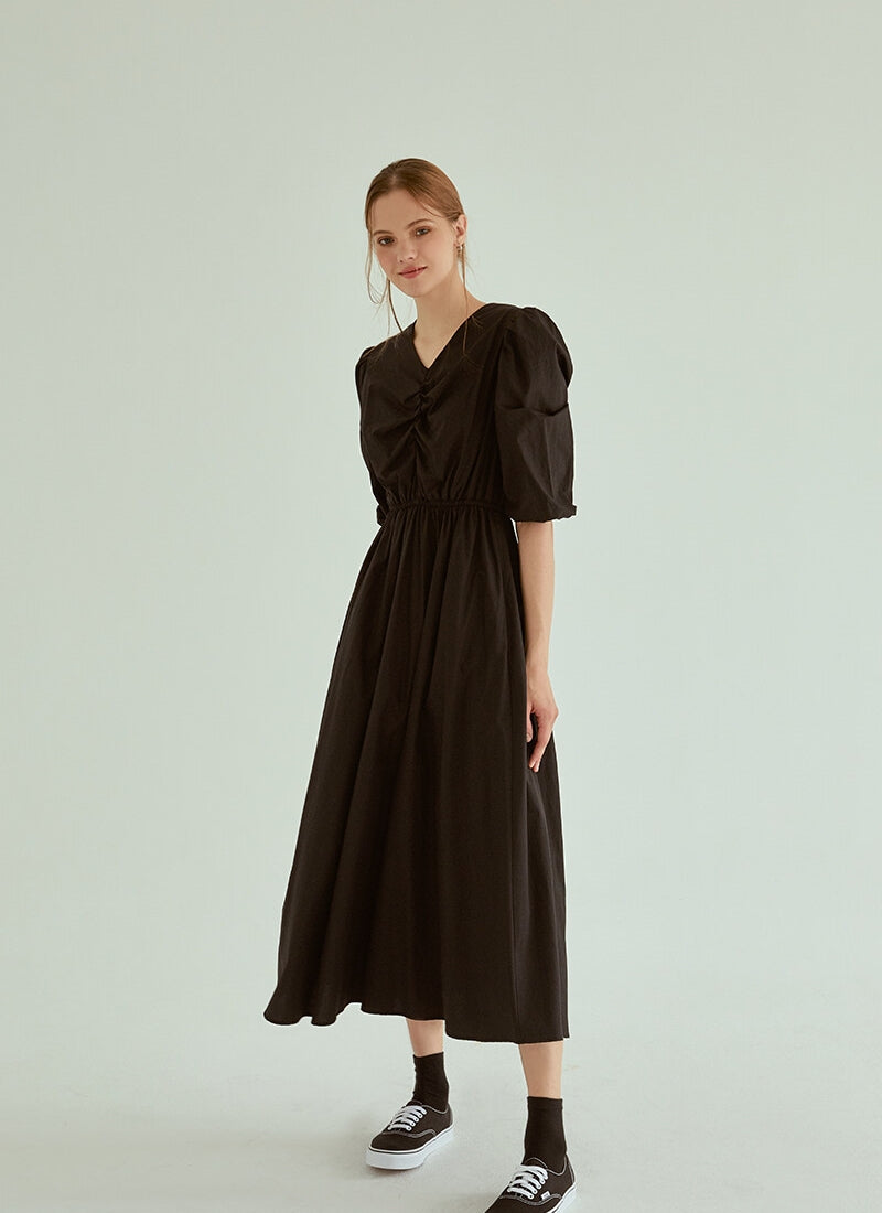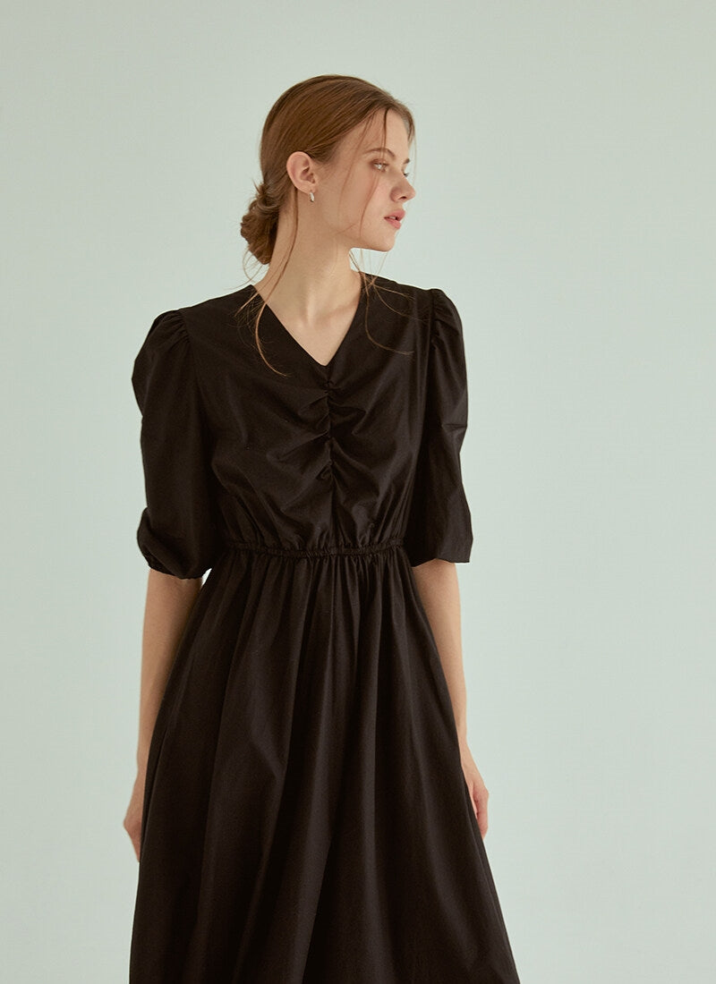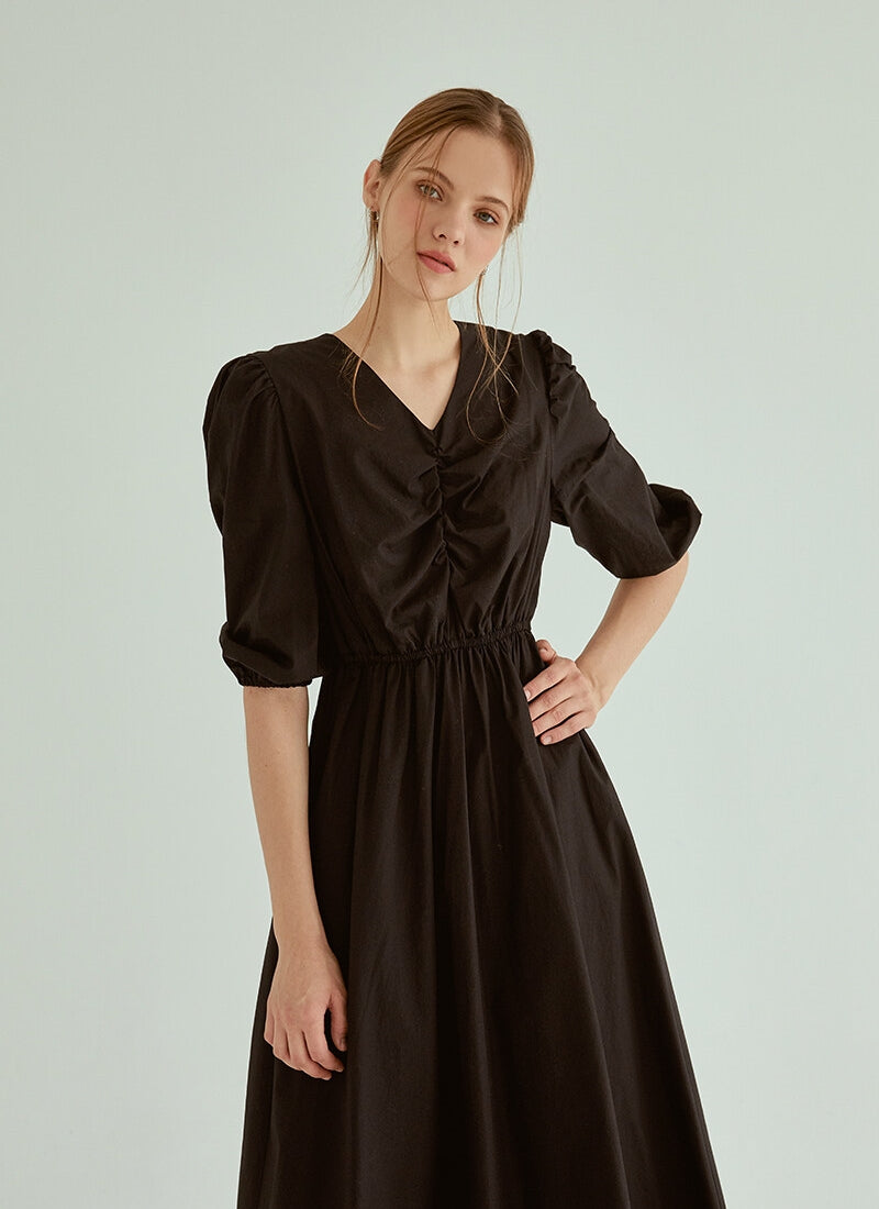 The perfect balance of modern structure and romantic detail, this cotton poplin midi dress by Laura Ren is a standout staple for refined everyday wear. Crafted from breathable cotton poplin, it features a flattering V-neckline, ruched bodice, and gently puffed sleeves for a touch of volume. The elasticated waist cinches the silhouette, while the flowing skirt adds graceful movement. Comfortable yet polished, this Laura Ren design transitions effortlessly from casual daytime outings to more elevated occasions with simple styling changes. A wardrobe essential for minimalist sophistication.