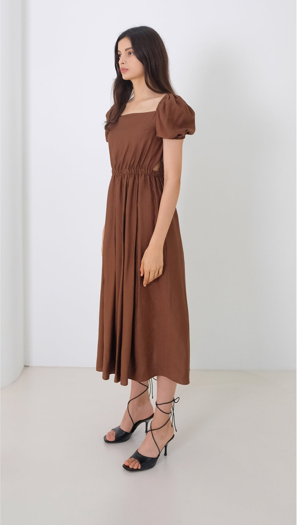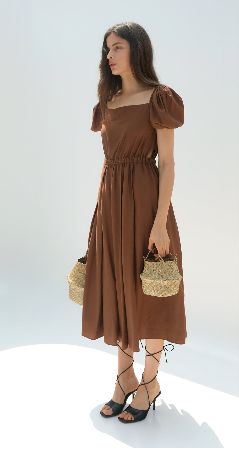 The Laura Ren linen midi dress reimagines classic tailoring with a fresh summer update. Crafted from breathable linen, this dress features a bold off-shoulder collar, V-neckline, and a row of sculptural buttons for a striking front detail. The elasticated back adds subtle shaping at the waist, while the mid-length silhouette balances structure and femininity. A versatile piece for city strolls or summer getaways, it blends timeless charm with effortless polish.