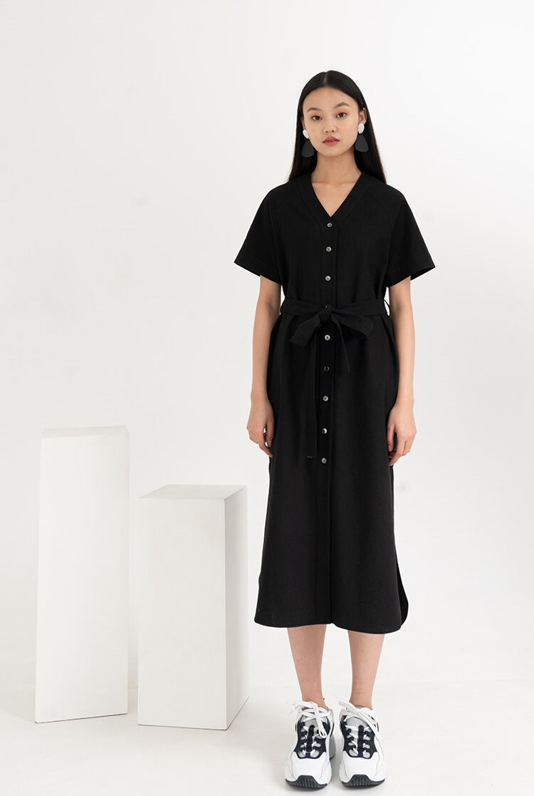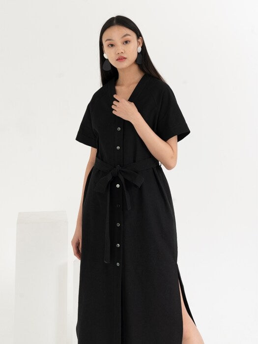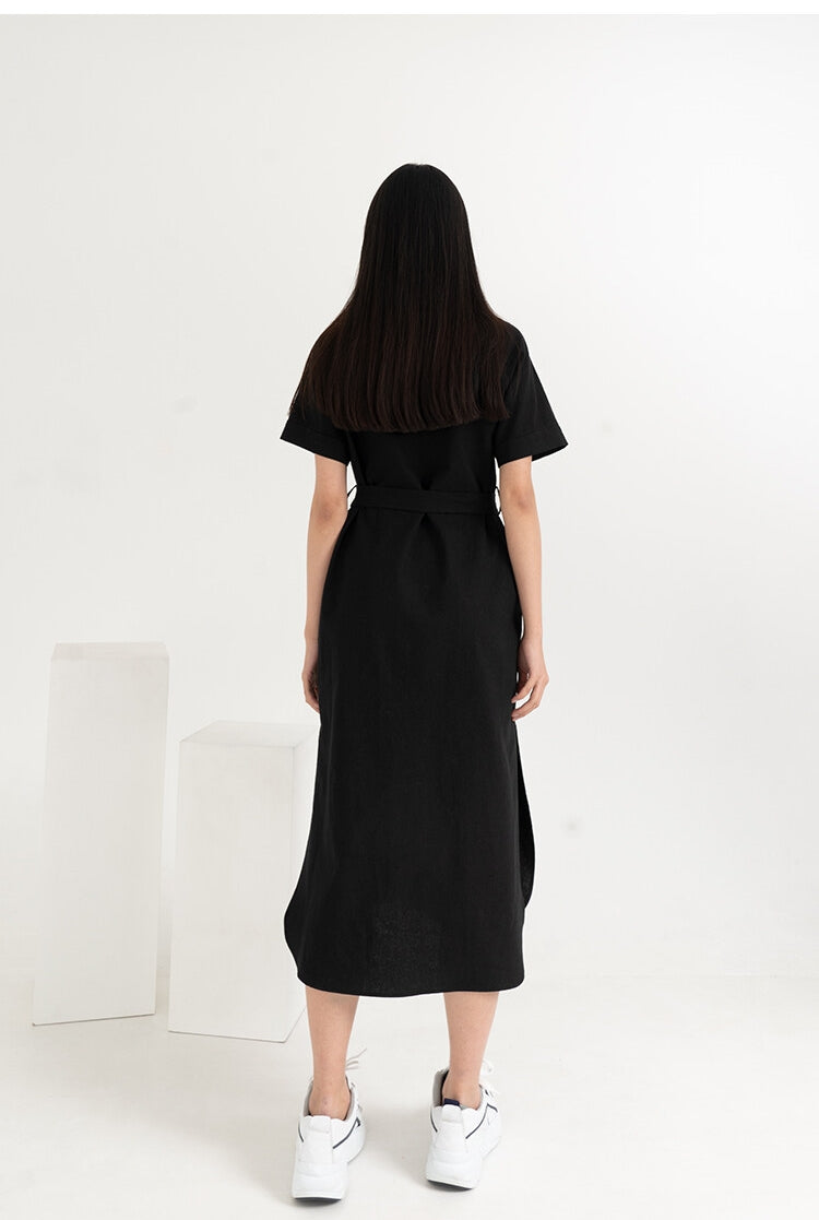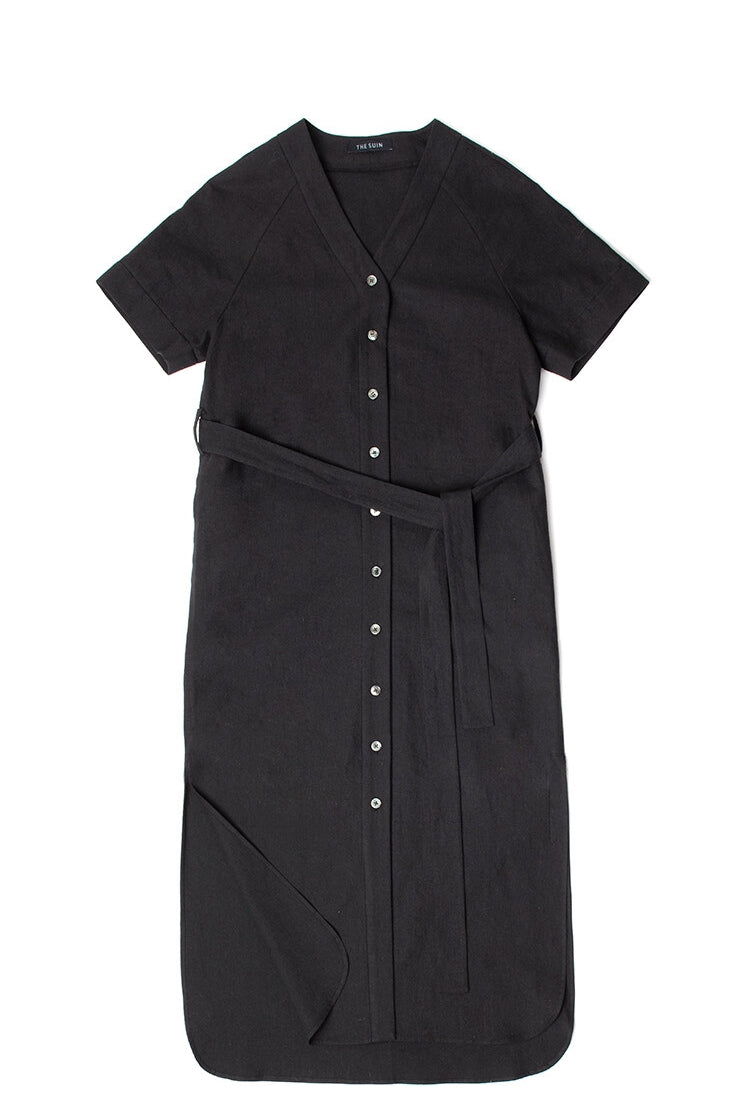 The Laura Ren linen shirt dress is a refined essential for the modern summer wardrobe. Crafted from breathable linen, this midi-length design features a flattering V-neckline, short cuffed sleeves, and a full front button closure. A self-tie belt defines the waist, while subtle side slits ensure ease of movement and relaxed elegance. Whether styled with statement flats or platform sneakers, this dress blends comfort with minimalist sophistication. Designed for effortless daytime looks or casual evenings, the Laura Ren piece delivers timeless appeal with everyday versatility.