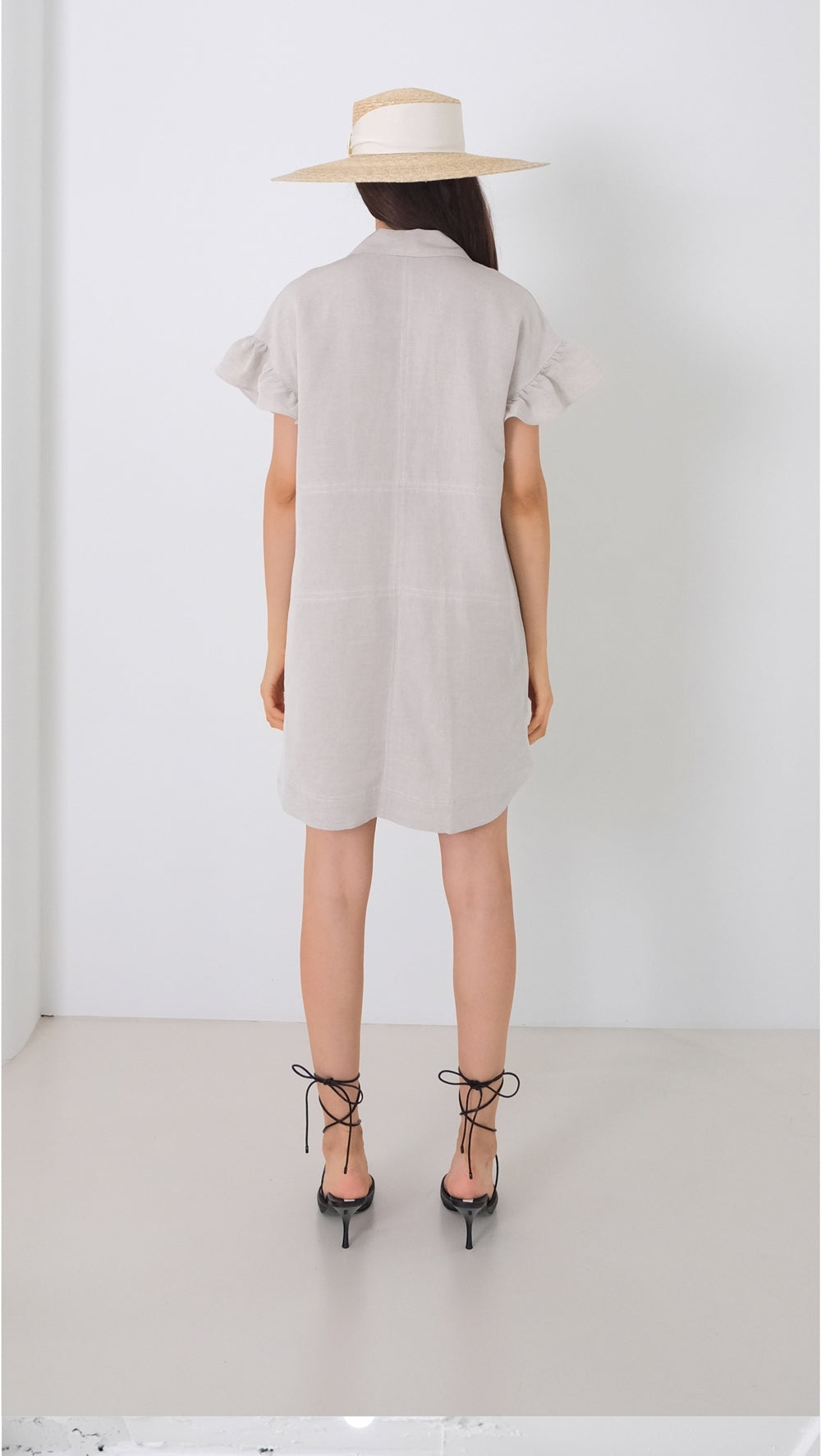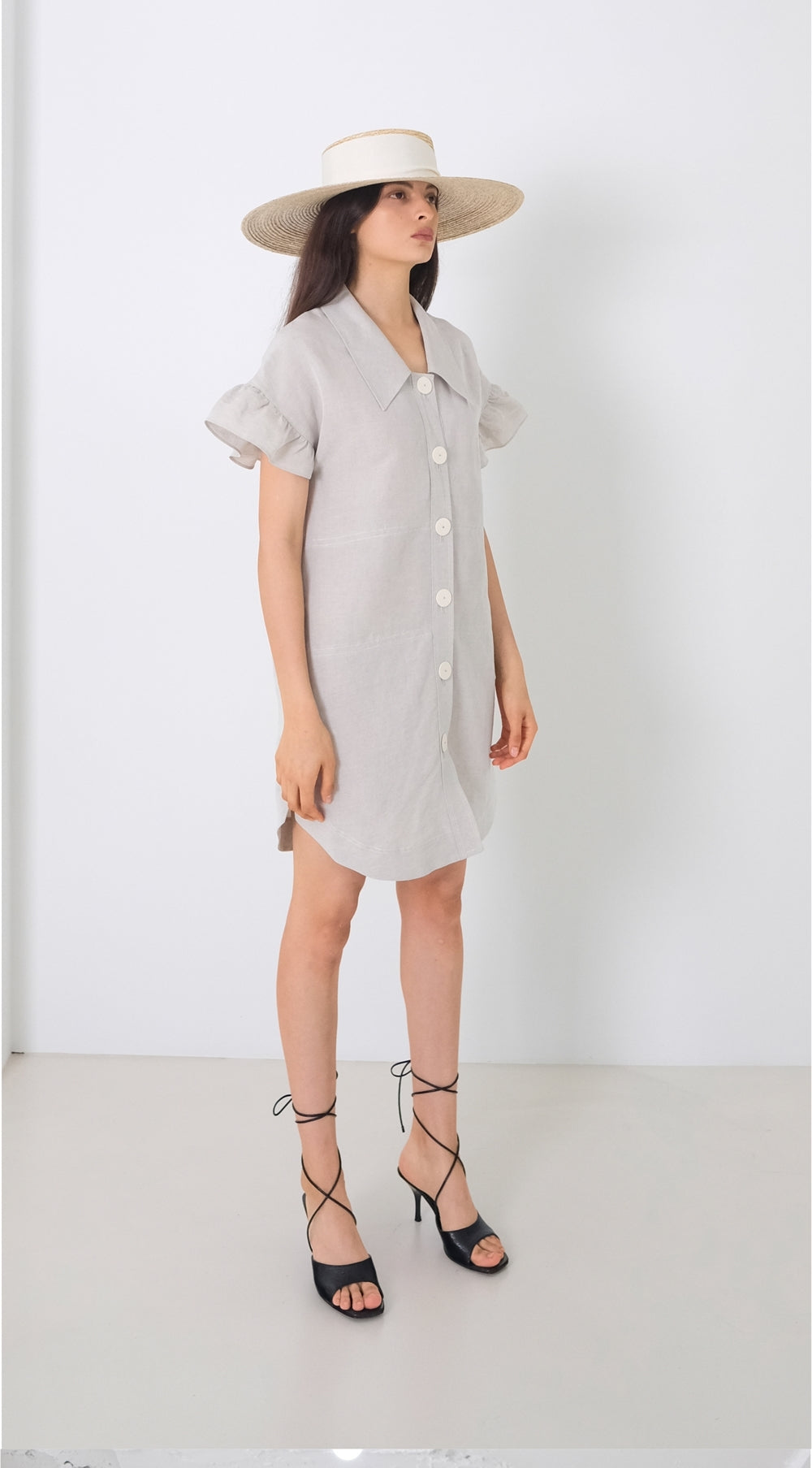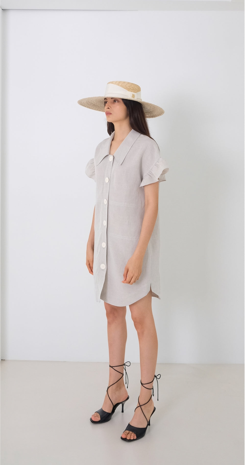 The Laura Ren linen mini dress blends youthful charm with tailored elegance, crafted from breathable linen for warm-weather comfort. Featuring short puff sleeves and a flared skirt, this silhouette is refined with a high round neckline and eye-catching gold-tone embossed buttons down the front. Finished with a subtle back zipper closure, it’s an effortlessly versatile piece for daytime city strolls or summer gatherings. Pair with lace-up sandals or ballet flats for a romantic yet modern aesthetic.