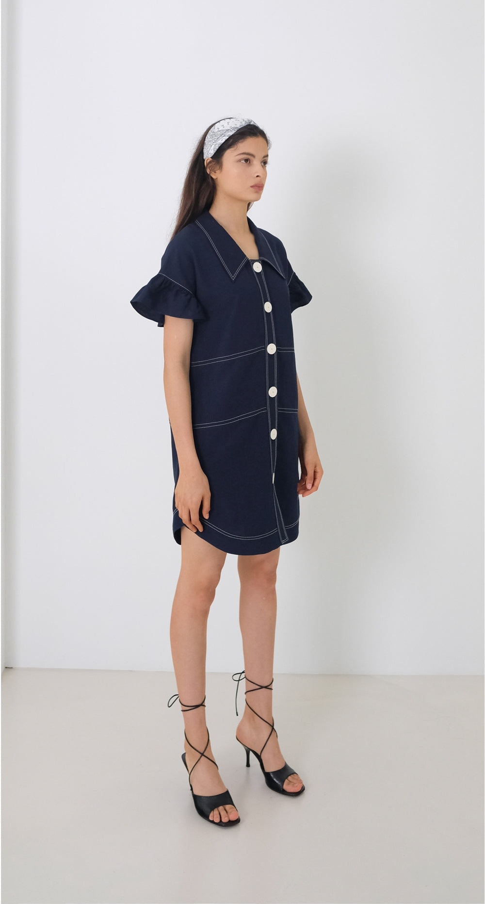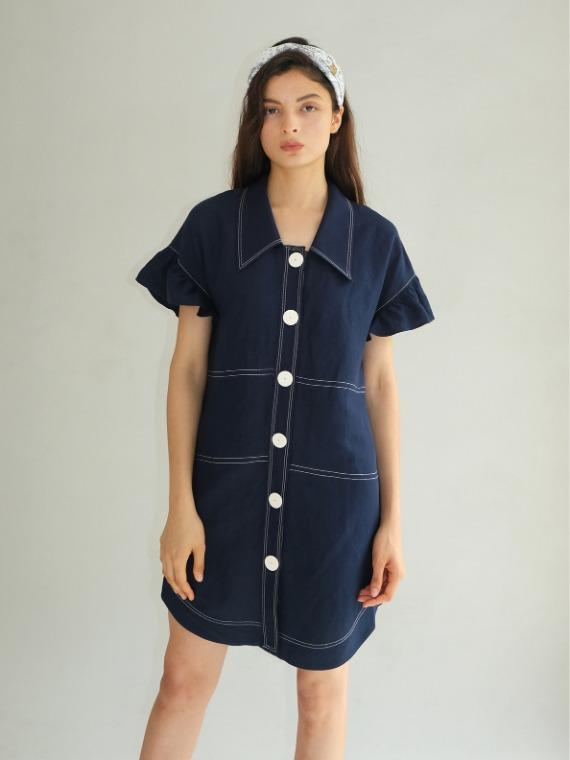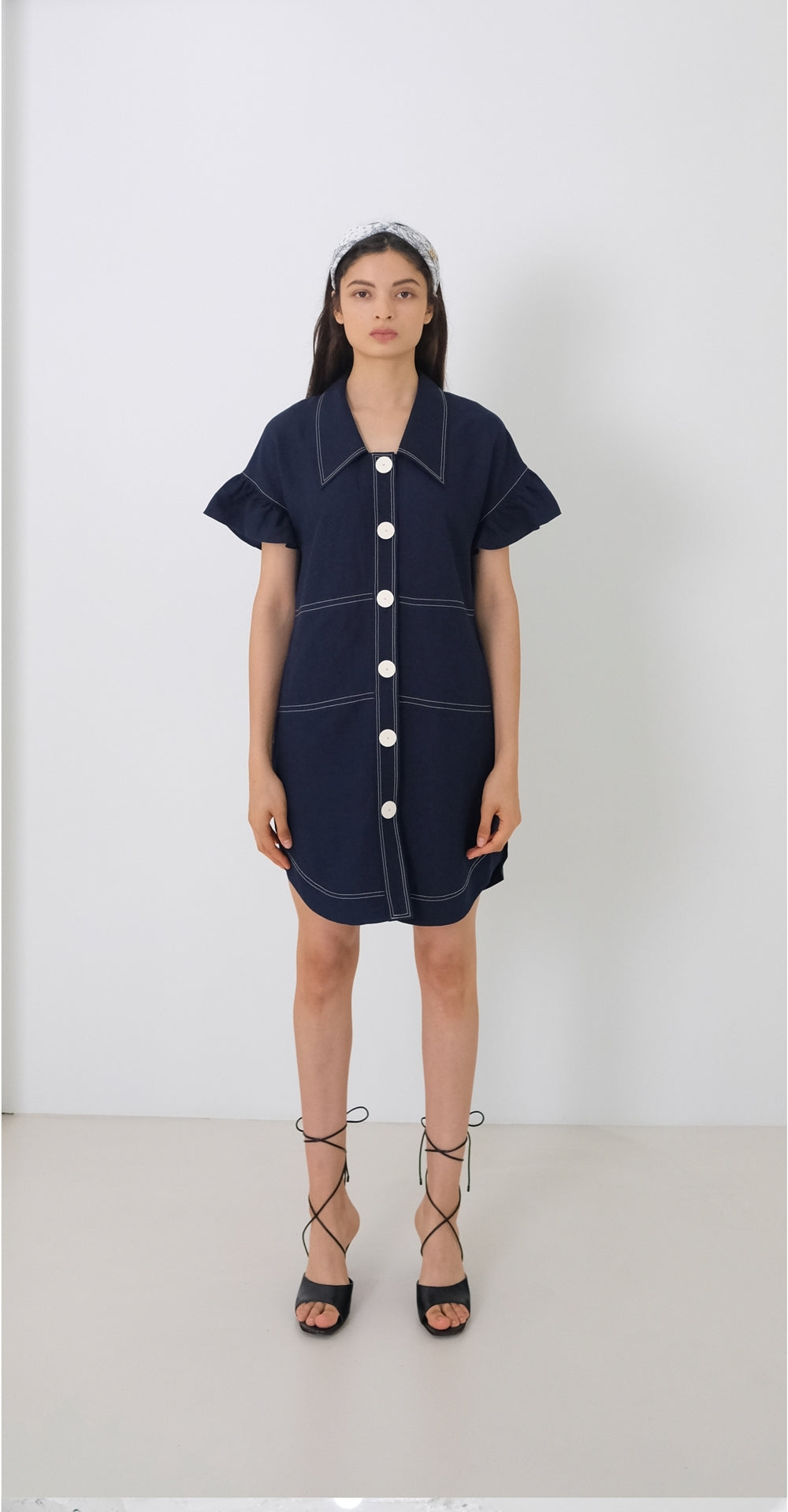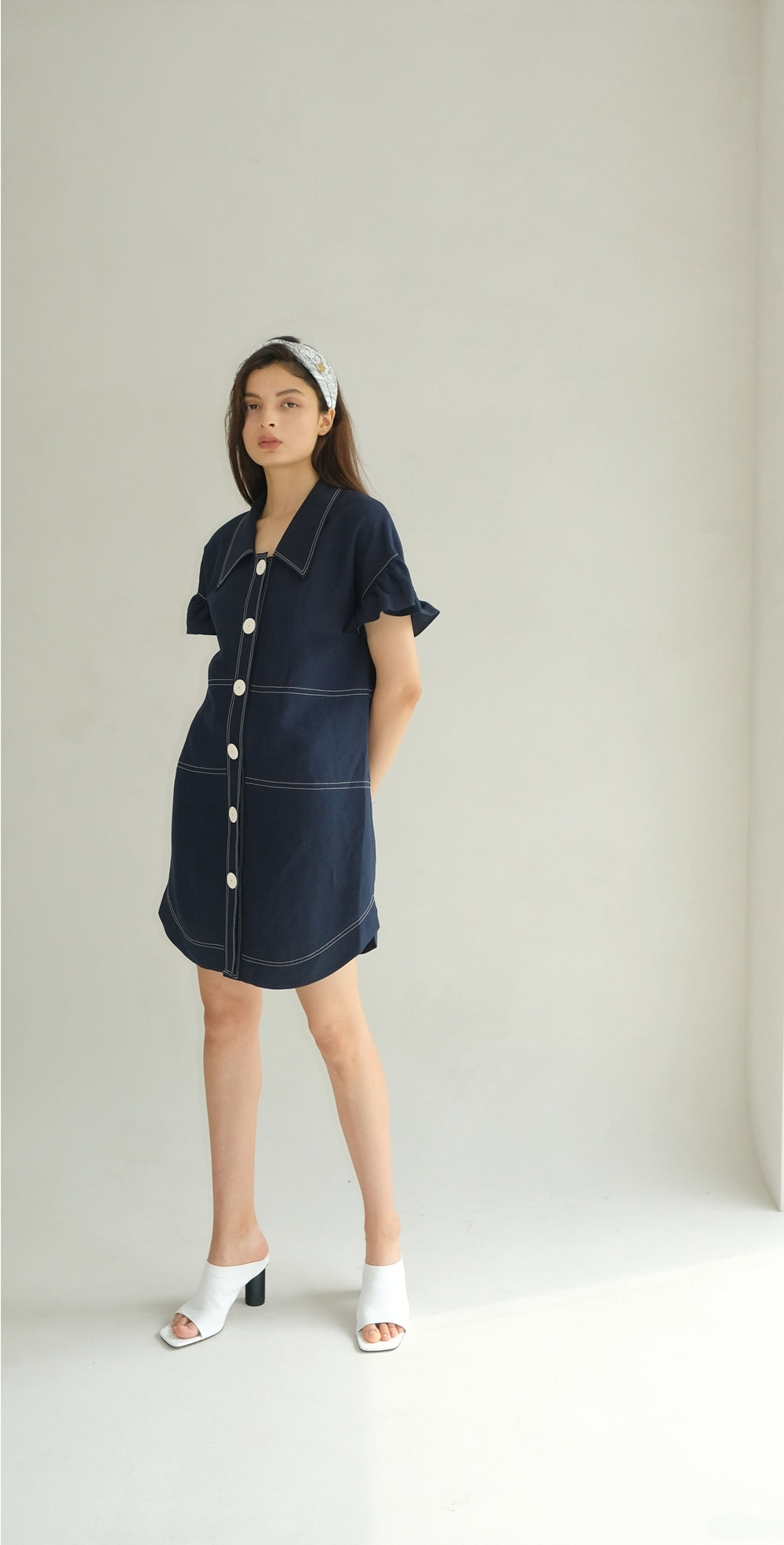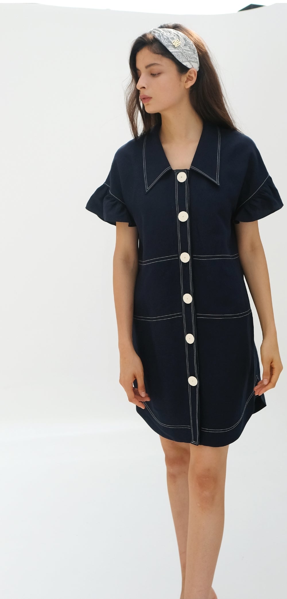 Laura Ren presents a charming take on the classic summer silhouette with this linen mini dress, tailored for modern ease and feminine charm. Designed with gently puffed ruffle sleeves, an oversized pointed collar, and bold contrast buttons running down the front, this dress captures a playful yet polished aesthetic. The breathable linen fabric ensures all-day comfort, while the structured mini cut flatters the figure with minimal effort. Whether styled with strappy heels or sandals, this versatile piece adds a refined touch to warm-weather dressing.