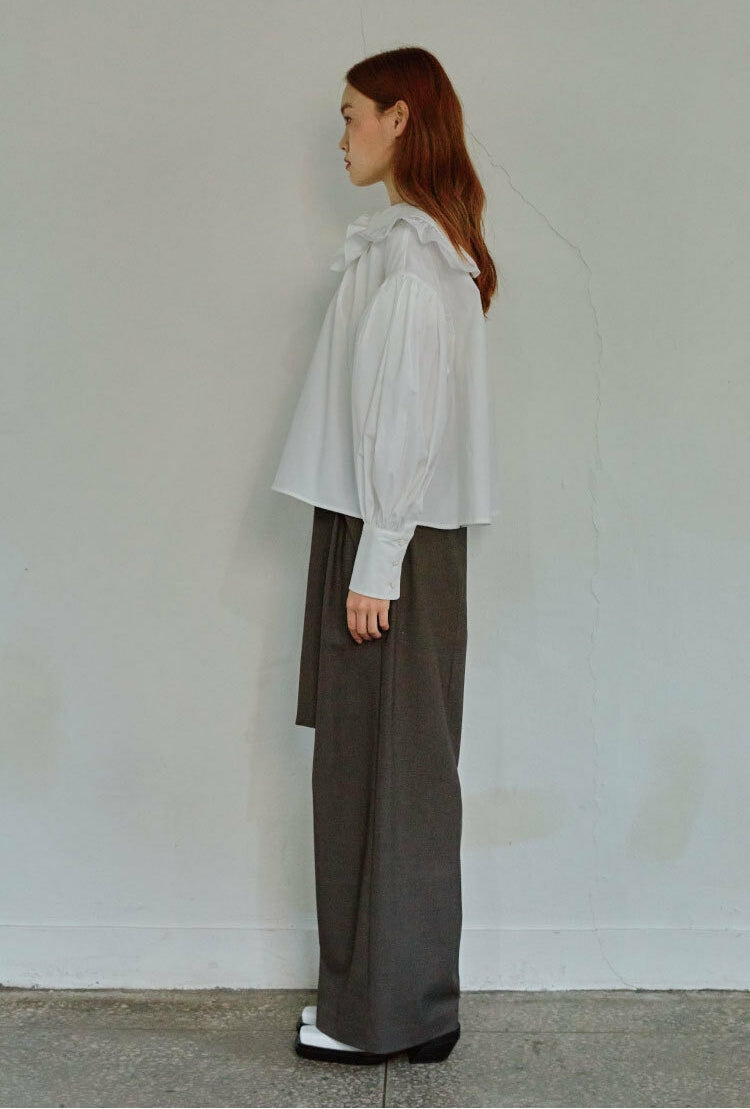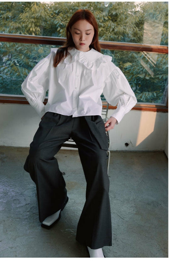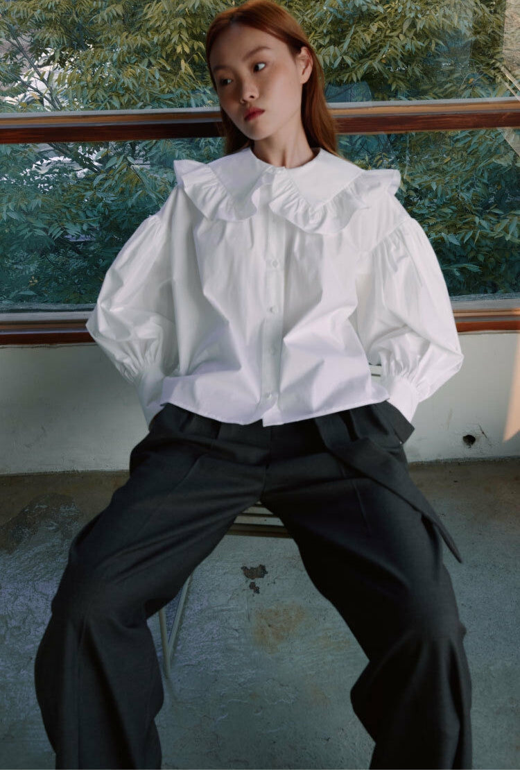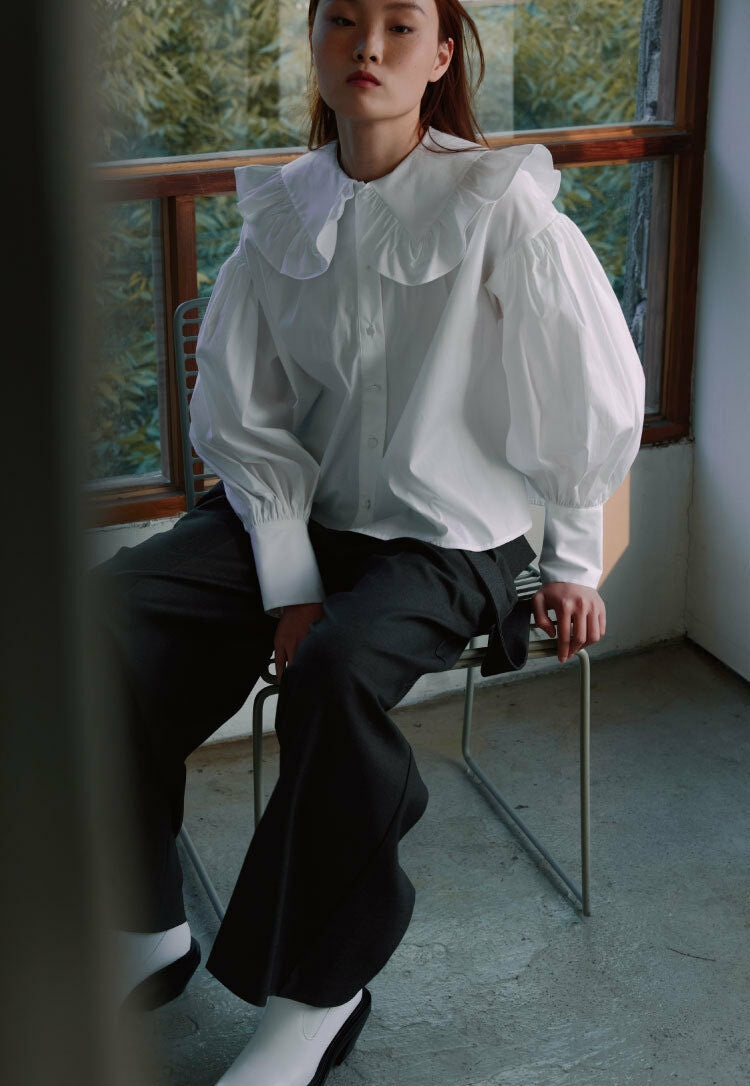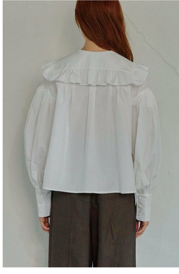 Laura Ren presents an elevated take on the classic shirt with this refined cotton poplin design. Crafted from crisp, breathable cotton poplin, the shirt features a dramatic oversized ruffled collar, voluminous puff sleeves, and a tailored button-down front. The structured silhouette brings timeless elegance with a bold contemporary twist, perfect for pairing with tailored trousers or statement skirts for a standout yet polished look.