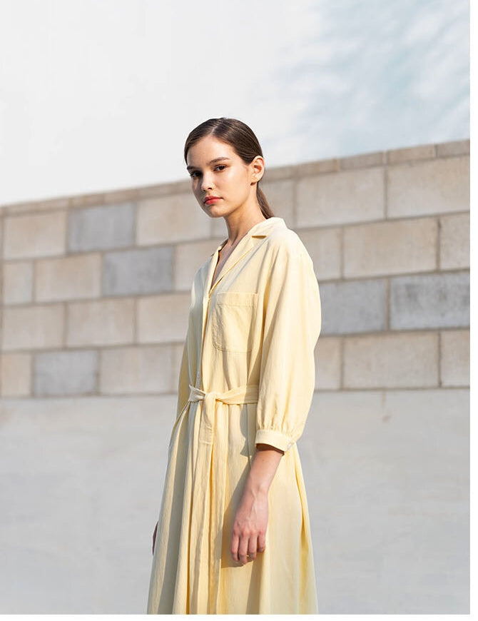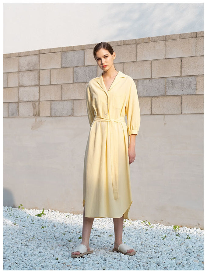 Linen Shirt Dress with Belted Waist, 3/4 Sleeves and Asymmetric Hem for Everyday Chic Style