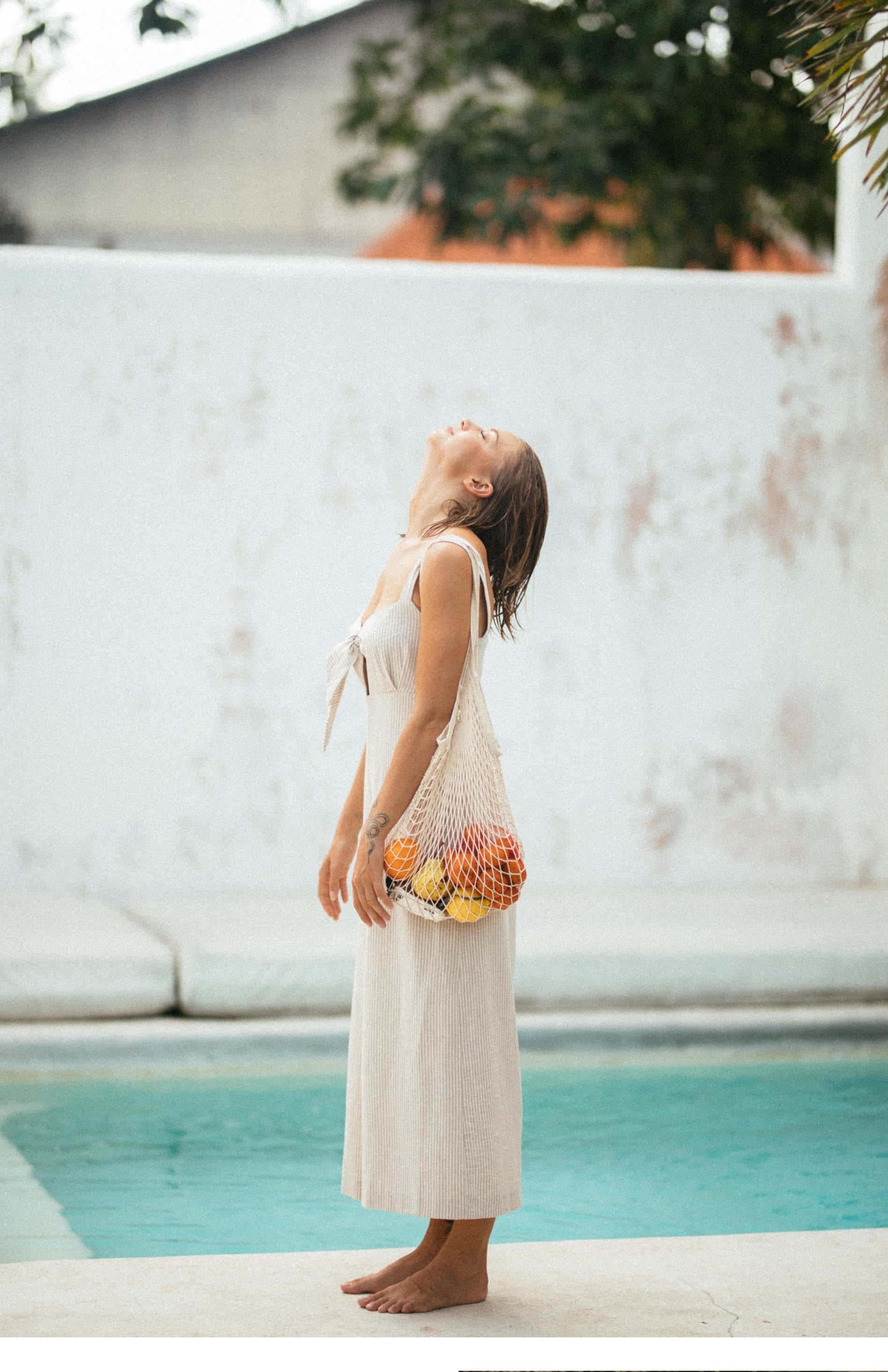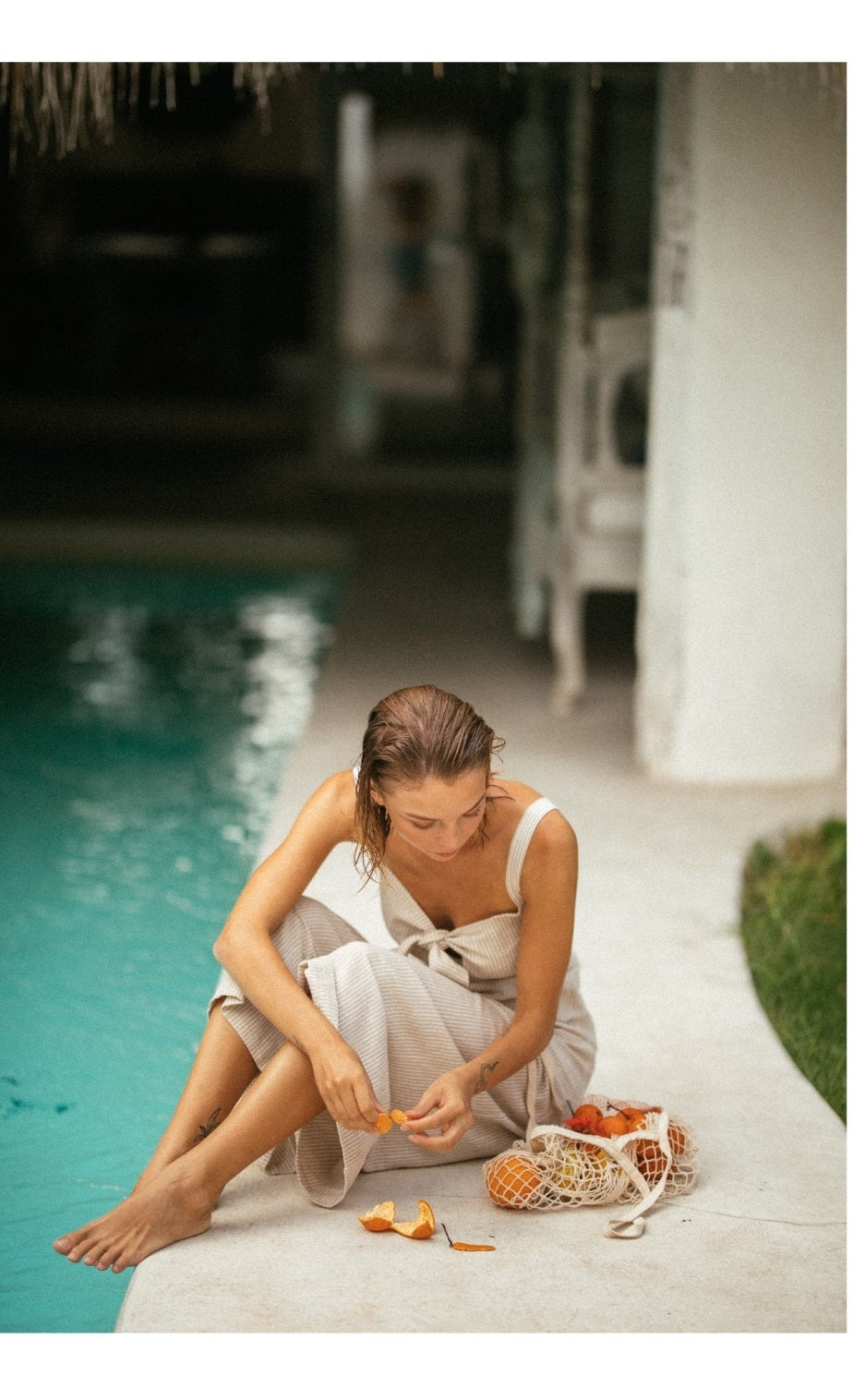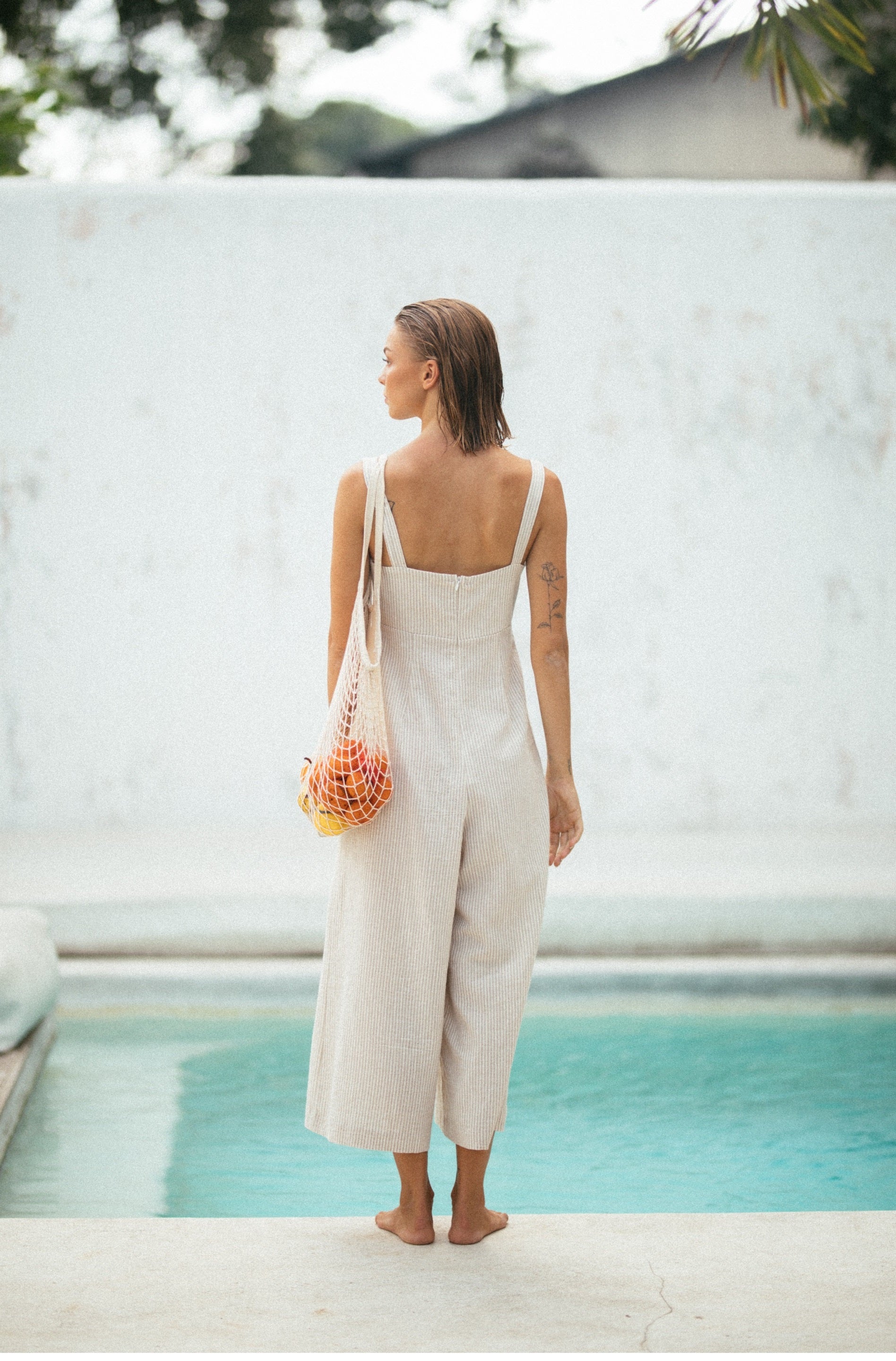 Laura Ren captures breezy sophistication in this tie-front linen jumpsuit—perfect for effortless summer styling. Made from breathable natural linen, this design features a feminine knotted bust with a peekaboo cutout, wide-leg silhouette, and wide shoulder straps for added comfort and structure. An invisible back zip closure ensures a seamless fit, while subtle pinstripes add visual interest. Ideal for travel, poolside lounging, or casual city strolls in warm weather.