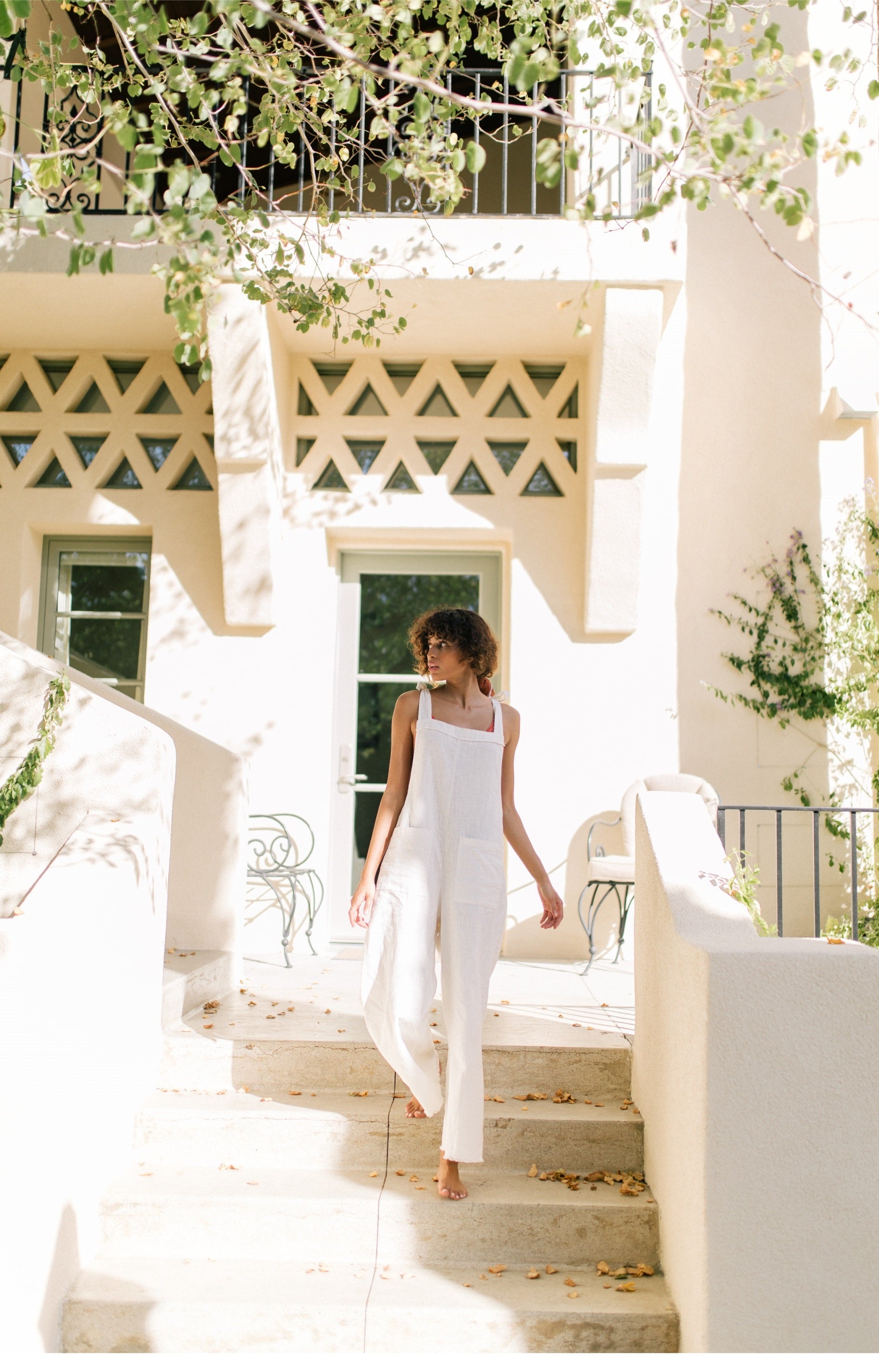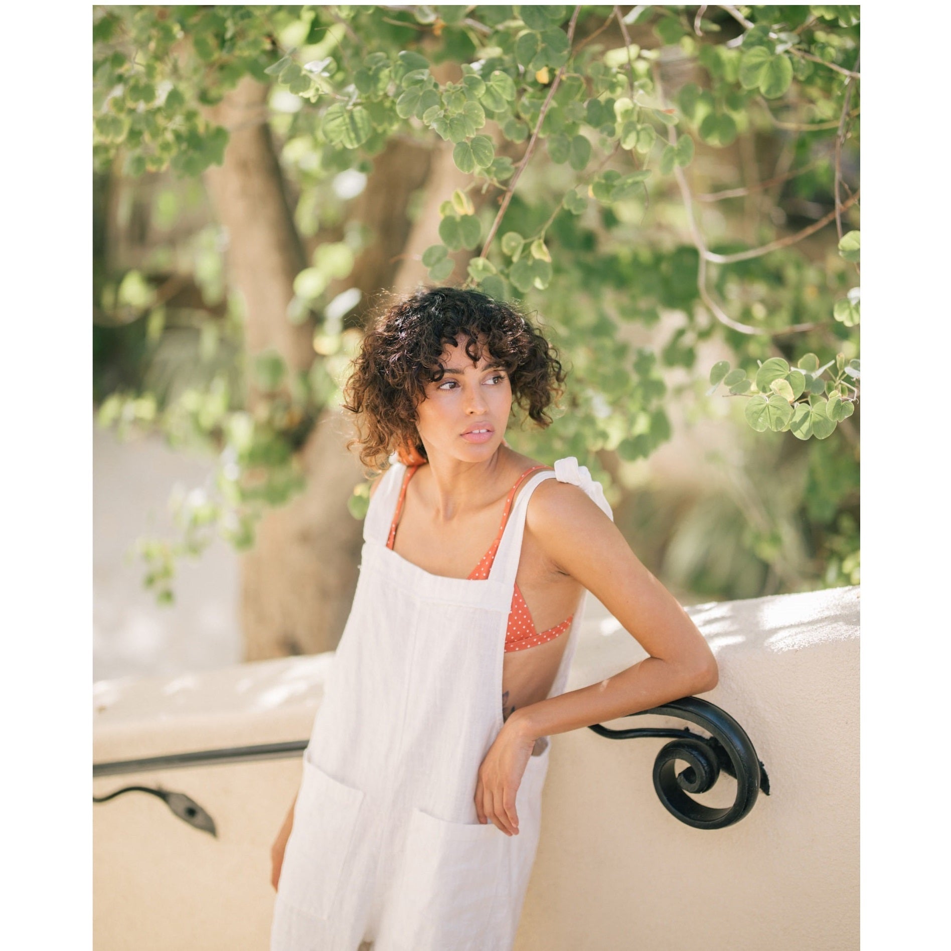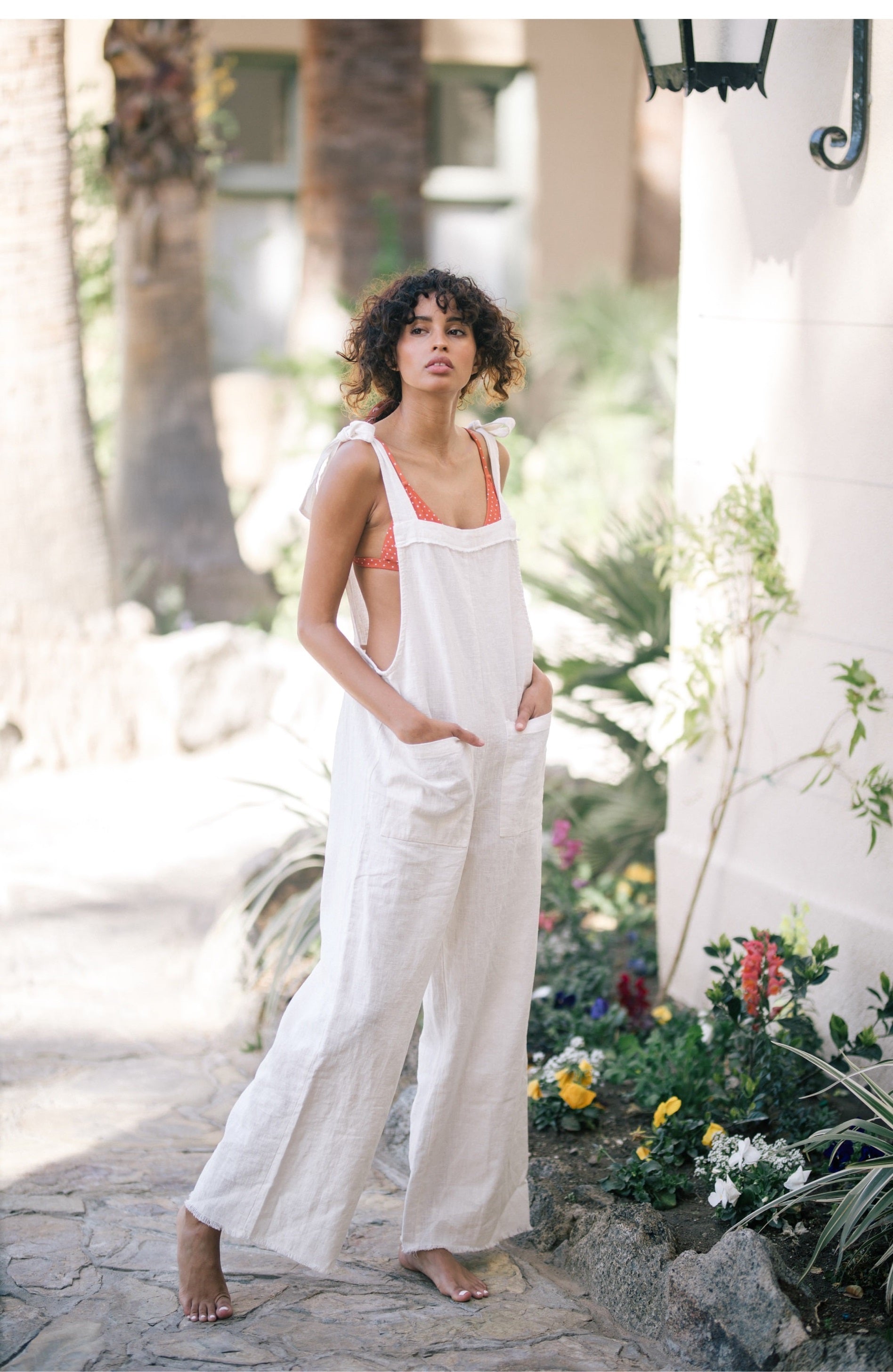 Laura Ren presents this effortlessly chic linen jumpsuit, designed for sun-drenched days and slow living. Crafted from soft, breathable linen, this piece features relaxed wide-leg pants, oversized front patch pockets, and adjustable tie straps at the shoulders for a touch of casual femininity. The open sides offer breezy comfort while subtly showcasing layered swimwear or bralettes. Perfect for vacations, weekend lounging, or barefoot garden strolls, this jumpsuit is a true ode to relaxed summer style.