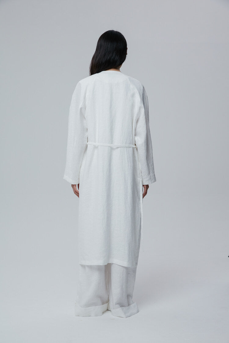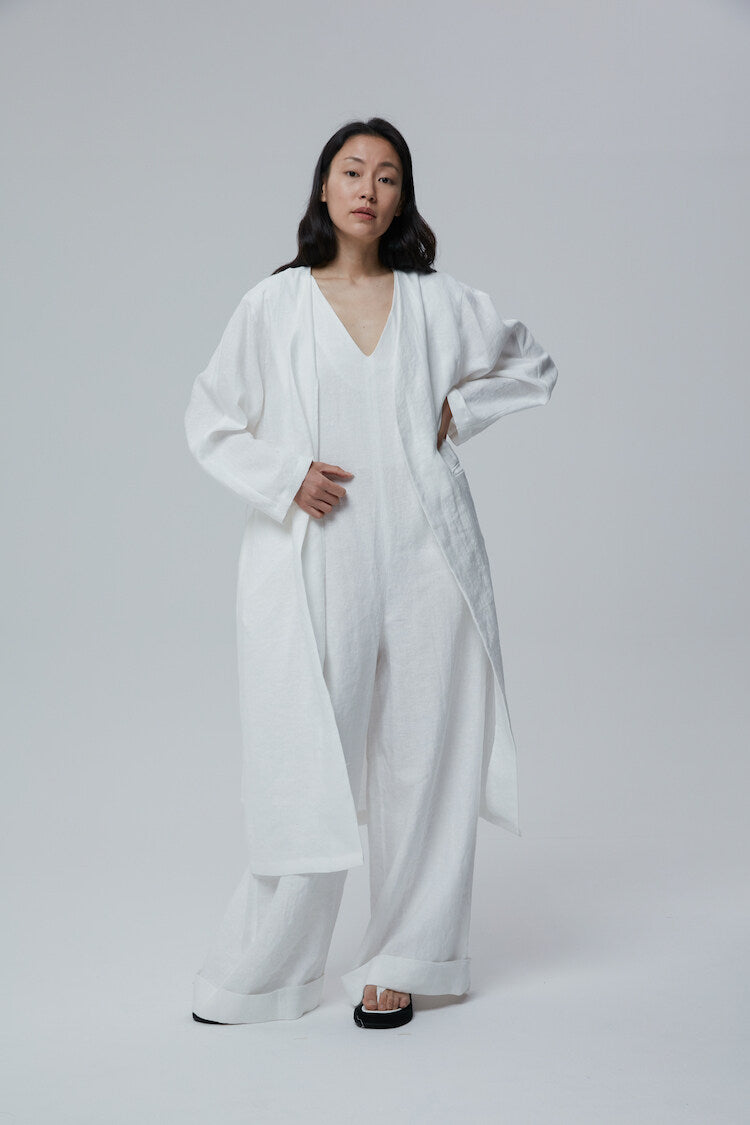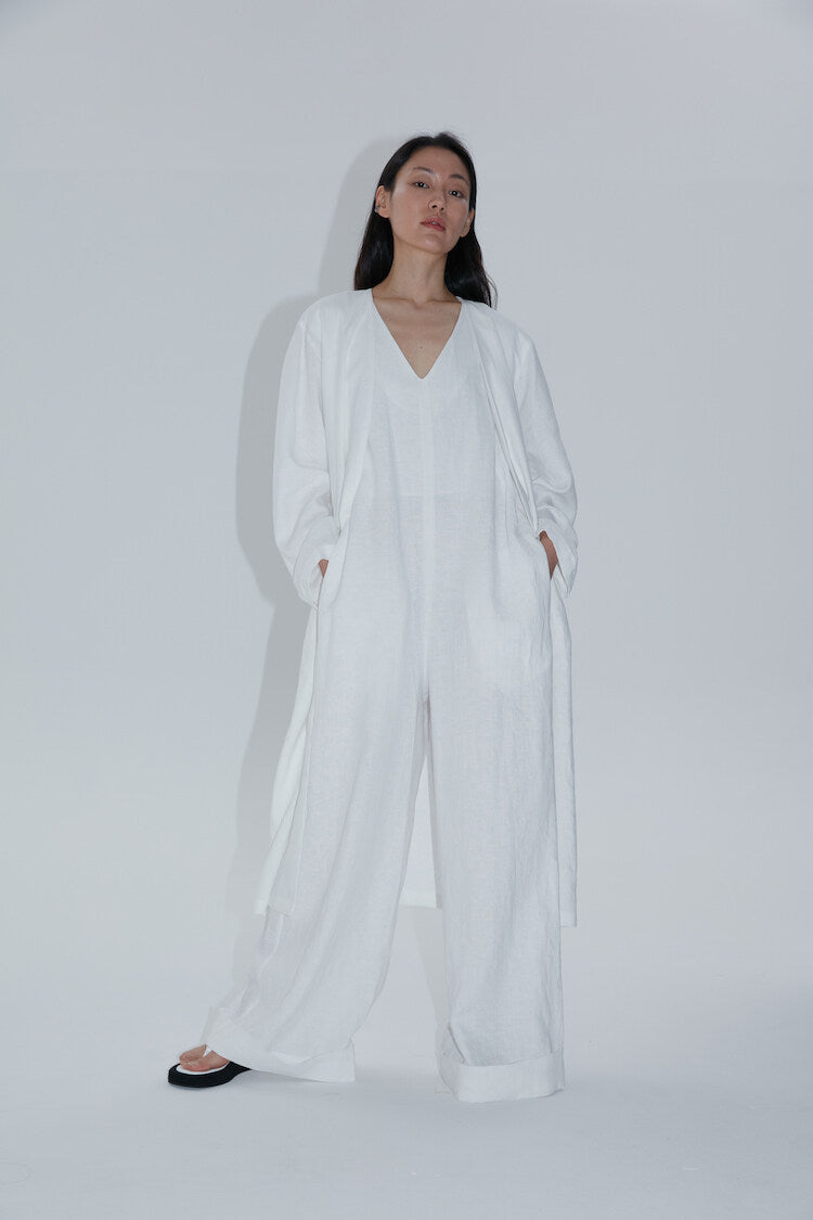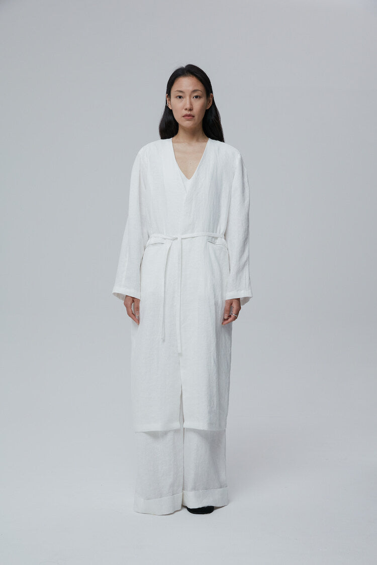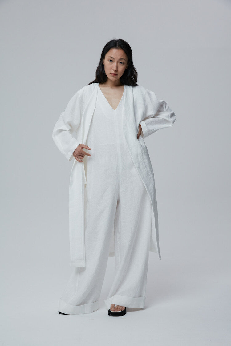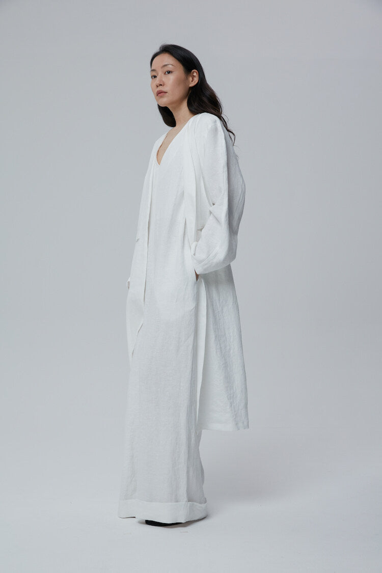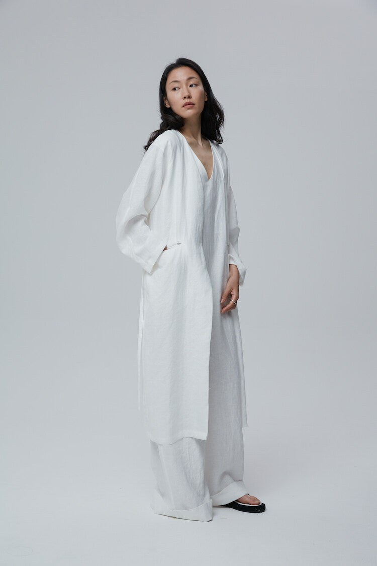 Laura Ren’s longline linen coat delivers the perfect balance of layering ease and sculptural tailoring. Made from breathable, structured linen, it features a clean open front, long sleeves, and a removable waist belt for adjustable shape. The coat’s minimalist silhouette flows effortlessly over wide-leg pants or jumpsuits, bringing softness and structure to any ensemble. A must-have for lightweight layering.