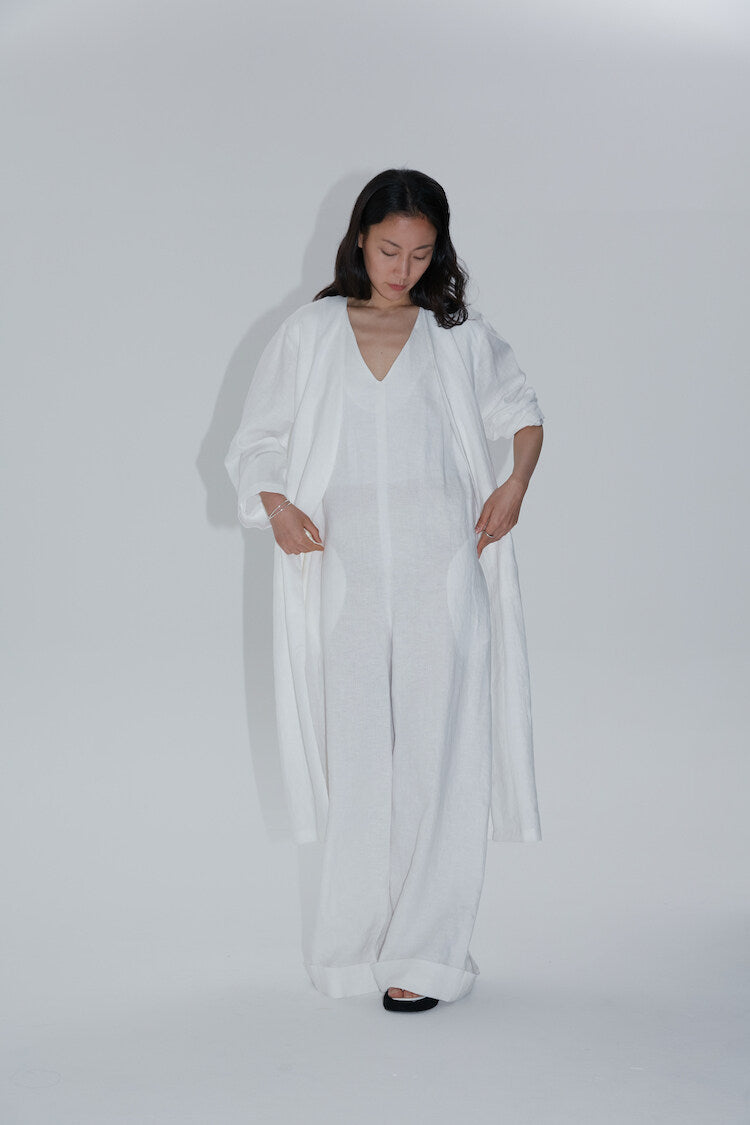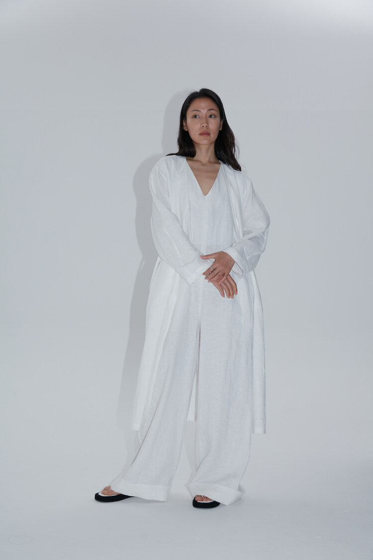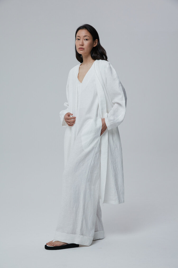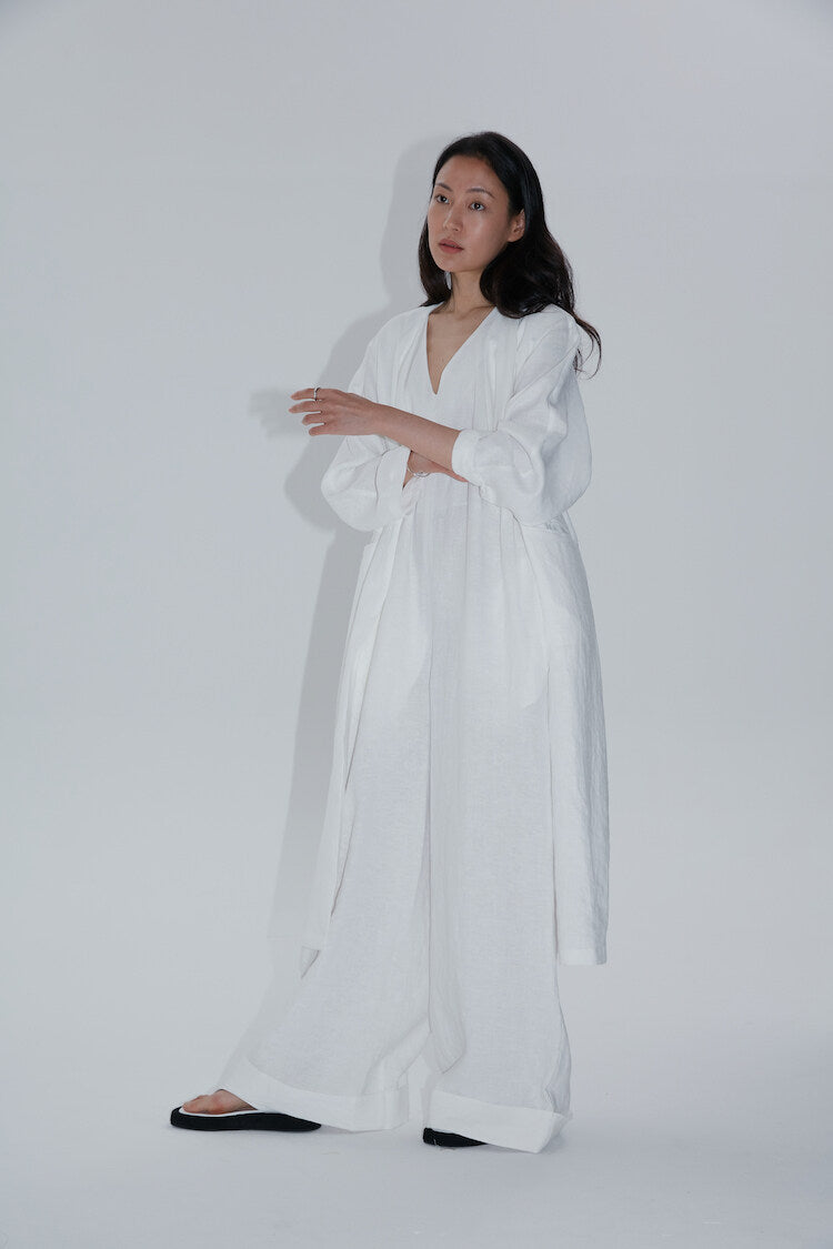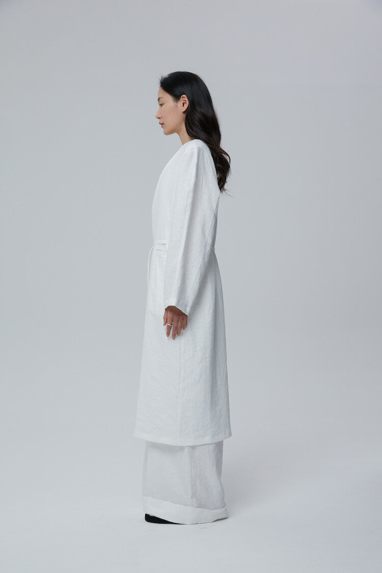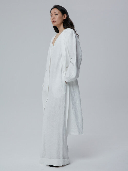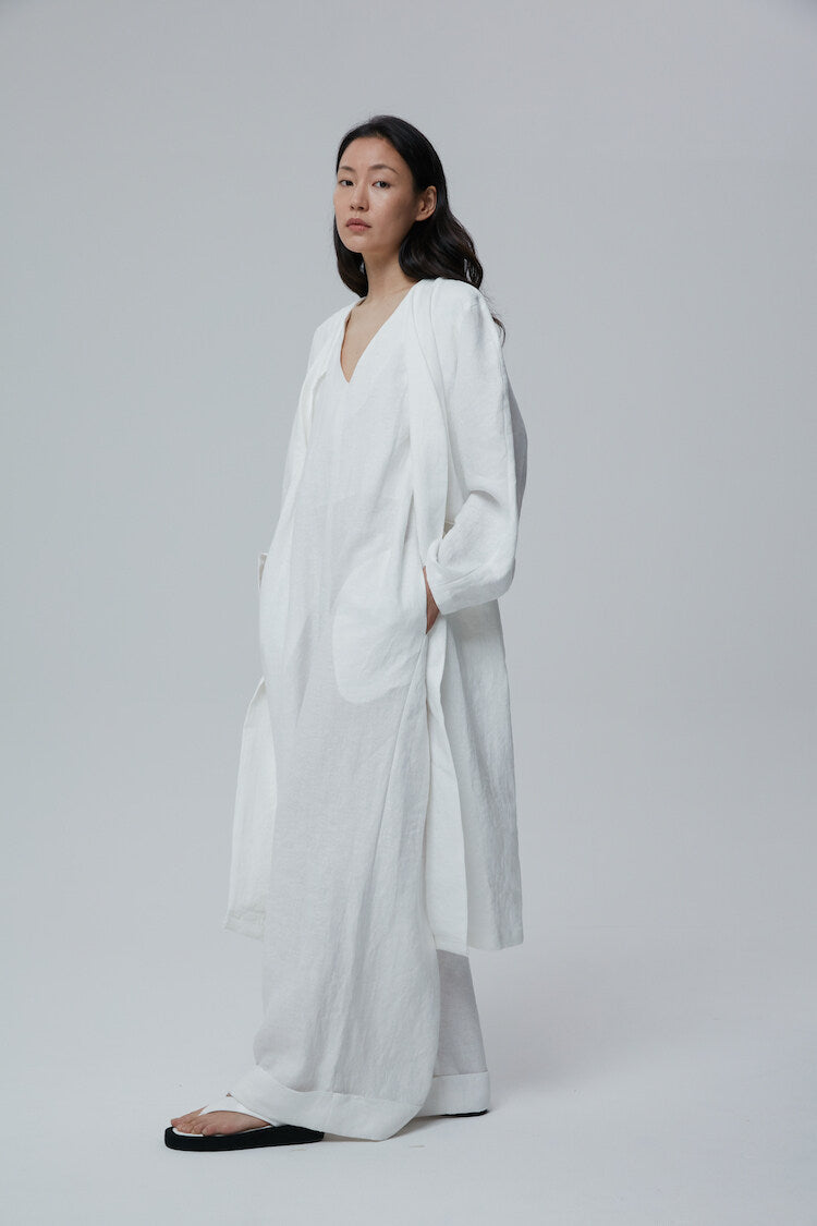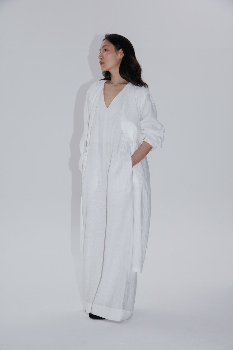 Laura Ren’s longline linen coat delivers the perfect balance of layering ease and sculptural tailoring. Made from breathable, structured linen, it features a clean open front, long sleeves, and a removable waist belt for adjustable shape. The coat’s minimalist silhouette flows effortlessly over wide-leg pants or jumpsuits, bringing softness and structure to any ensemble. A must-have for lightweight layering.