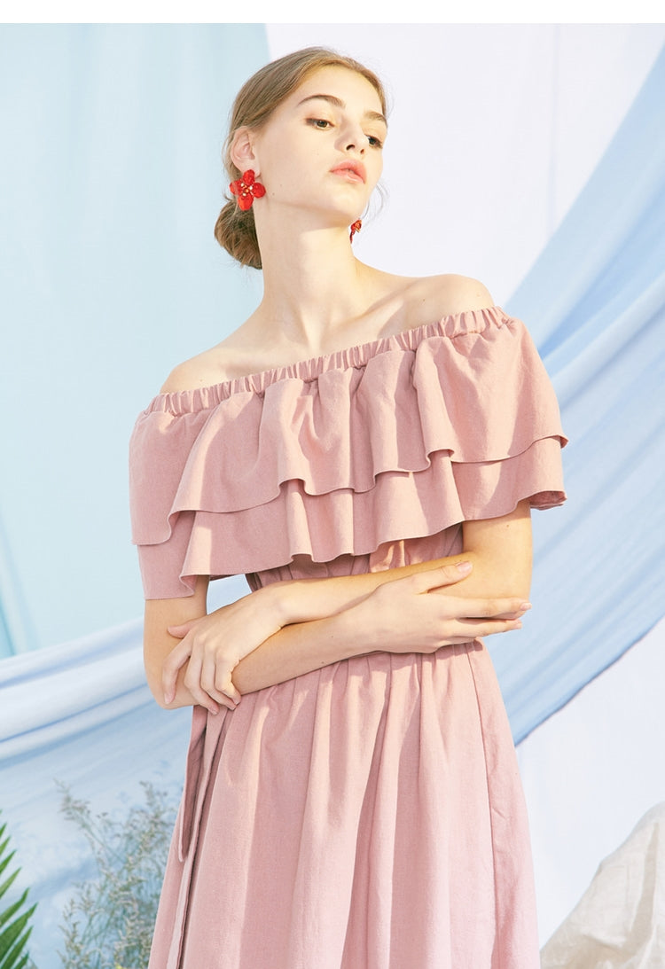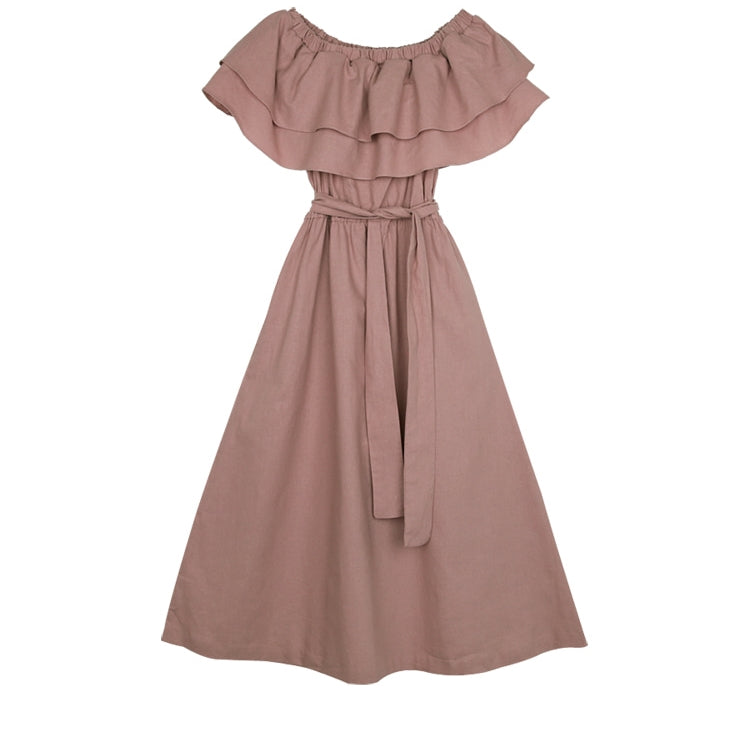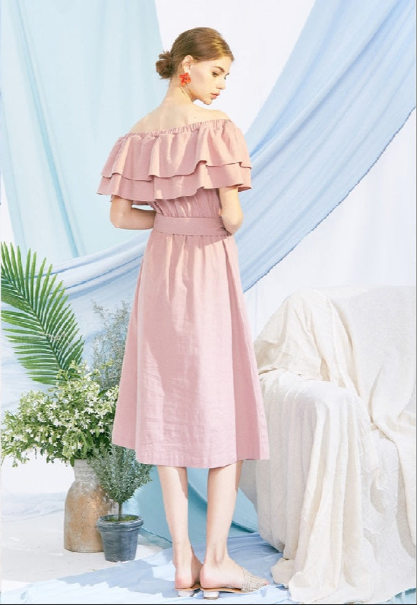 Crafted from breathable linen, this off-shoulder midi dress by Laura Ren is the epitome of effortless elegance. Designed with layered ruffle detailing at the neckline, it beautifully highlights the collarbones while adding a romantic flair. The dress cinches at the waist with a detachable belt for a flattering silhouette and flows into an A-line hem that grazes the calves for graceful movement. Ideal for warm-weather occasions, this linen dress is lightweight, airy, and perfect for a casual day out or a stylish summer evening. Whether worn with flats or heels, this dress offers timeless charm and feminine sophistication.