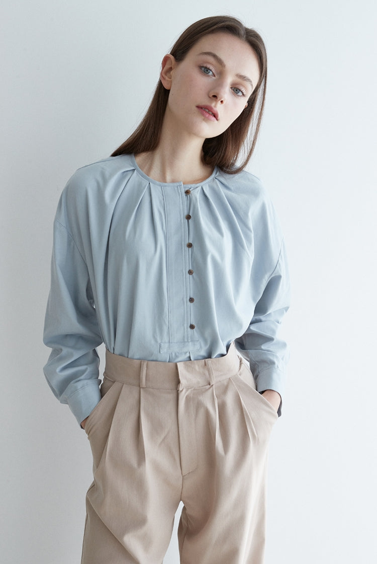 This pleated front linen blouse offers an elevated twist on timeless wardrobe staples. Designed with refined front-button detailing and crafted from breathable natural linen, it blends sophistication with relaxed elegance. The round neckline and gently gathered shoulders enhance its fluid silhouette, making it a perfect match for both tailored pants and casual separates. Laura Ren focuses on clean lines and natural textures, and this blouse exemplifies that modern minimalist ethos. Ideal for transitional weather or warm days at work, it redefines understated luxury in everyday fashion.