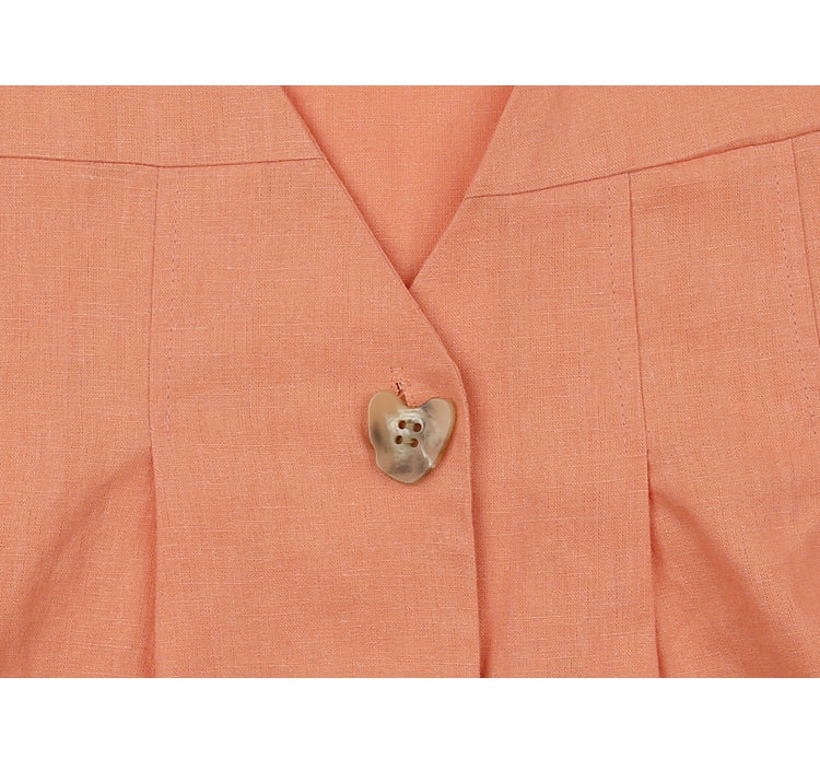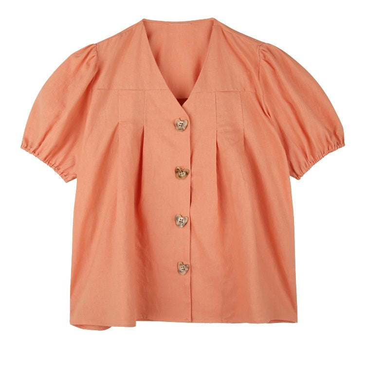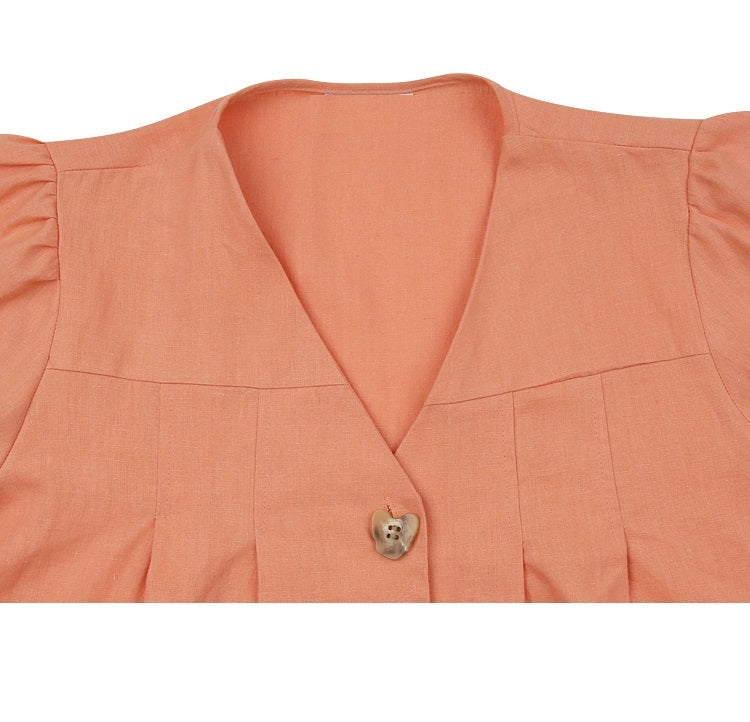 Simple yet elevated, this puff-sleeve linen blouse by Laura Ren is a versatile essential for warm-weather dressing. Crafted from lightweight and breathable linen, the design features gentle pleats down the front, a flattering V-neckline, and a relaxed silhouette that ensures comfort all day long. Finished with natural-look buttons and subtly gathered short sleeves, this blouse blends feminine charm with casual ease. Whether paired with jeans, trousers, or skirts, this Laura Ren piece brings understated elegance to your everyday wardrobe.