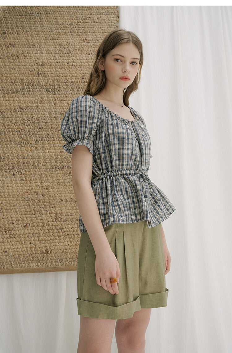 The Laura Ren linen blouse is a breezy staple crafted for warm weather styling with a romantic twist. Designed in a lightweight linen blend, it features a softly gathered square neckline, short puff sleeves with ruffled cuffs, and an adjustable waist tie that defines the silhouette. The structured pleating and button-down front give it a charming, tailored look, while the checked pattern adds a hint of countryside charm. Pair it with tailored linen shorts or wide-leg trousers for effortless summer appeal. Every element of this blouse speaks to Laura Ren's dedication to relaxed femininity and timeless craftsmanship.