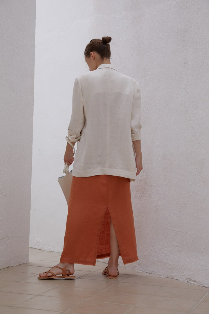 This relaxed-fit linen blazer by Laura Ren is a refined essential for transitional layering. Cut from breathable, natural linen, it features a soft-structured silhouette with notched lapels, rolled sleeves, and oversized patch pockets for a casual yet elevated aesthetic. The hip-length cut and unlined finish offer a laid-back drape, making it perfect for pairing with dresses, tailored trousers, or denim. Its timeless natural hue complements both vibrant and neutral palettes. Lightweight, easy to style, and thoughtfully designed, this Laura Ren blazer is a versatile must-have for effortless summer-to-fall dressing.