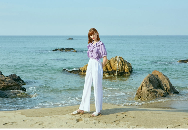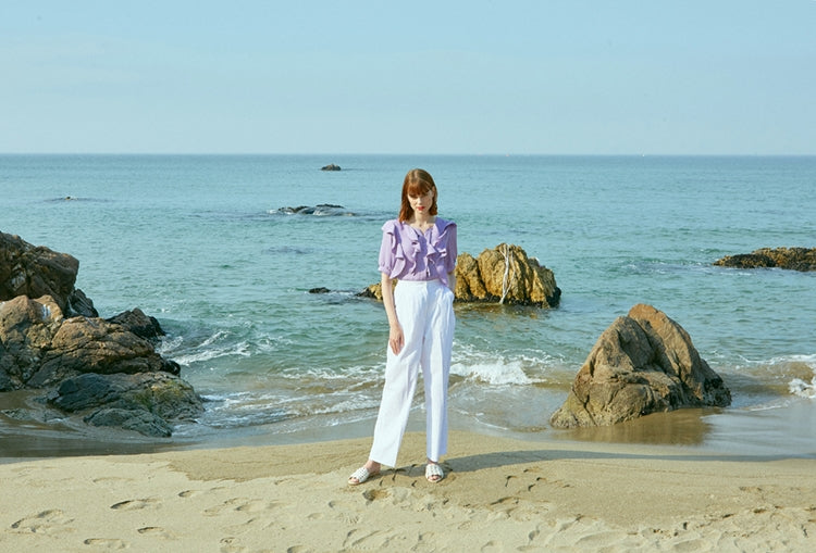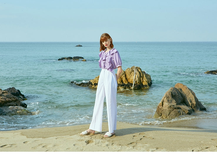 Laura Ren introduces this chic linen blouse crafted for effortless summer elegance. Designed with voluminous puff sleeves, soft ruffle accents, and a flattering V neckline, this blouse adds feminine charm to any outfit. Made from breathable linen, it ensures all-day comfort even under the sun. The delicate buttons and tailored fit create a refined silhouette, perfect for pairing with wide-leg trousers or skirts. Ideal for seaside strolls, brunches, or vacation getaways.