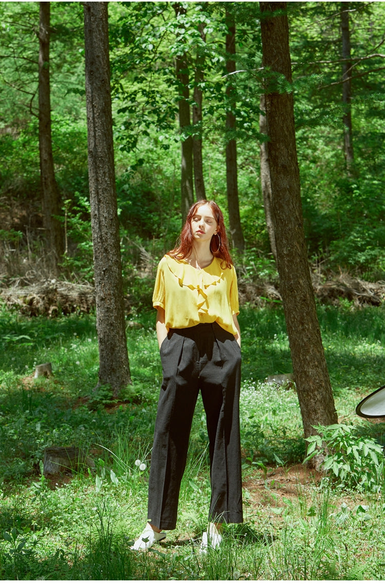 Laura Ren introduces a standout linen blouse that blends romance and refinement with ease. Made from premium linen, this top features soft ruffle detailing along the neckline and front, adding a feminine flourish to a relaxed silhouette. The short sleeves and breathable fabric make it ideal for warmer days, while the elegant drape allows effortless styling from casual brunches to elevated evenings. A versatile piece that brings charm and sophistication to your seasonal wardrobe.