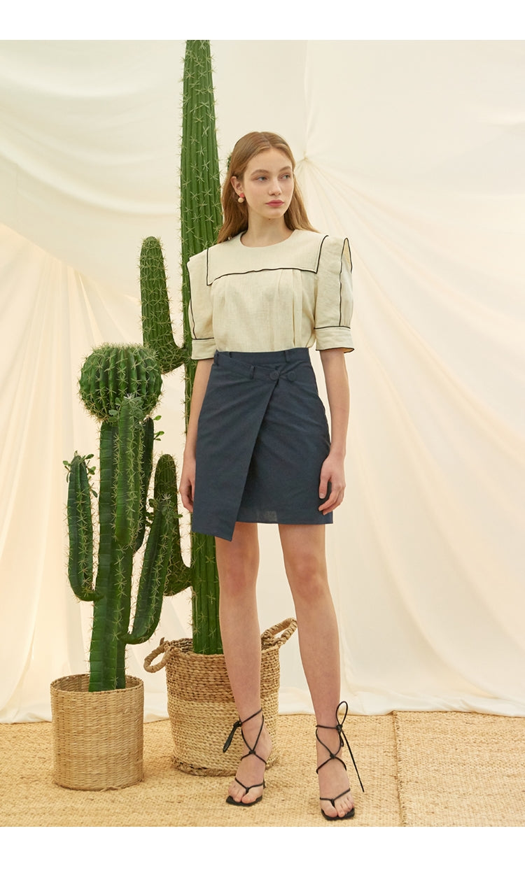 Laura Ren introduces this statement linen blouse that blends retro charm with modern tailoring. Crafted from breathable natural linen, it features a wide square sailor-style neckline with contrast piping, structured half sleeves, and soft pleating at the front. The bold silhouette adds character to any outfit, while the natural fabric ensures day-long comfort. Ideal for pairing with jeans or tailored pants, this top elevates your everyday wardrobe with confident femininity.