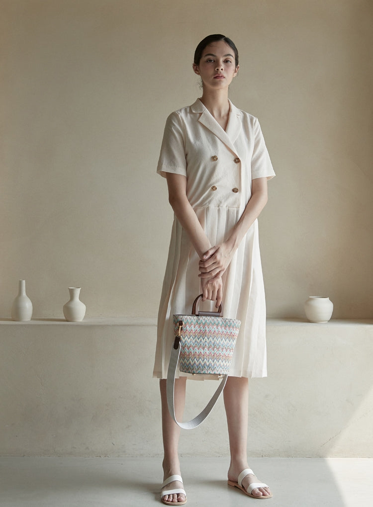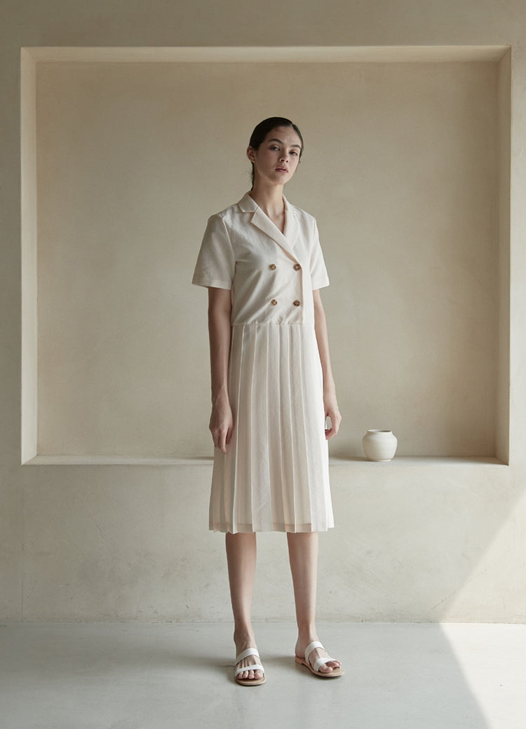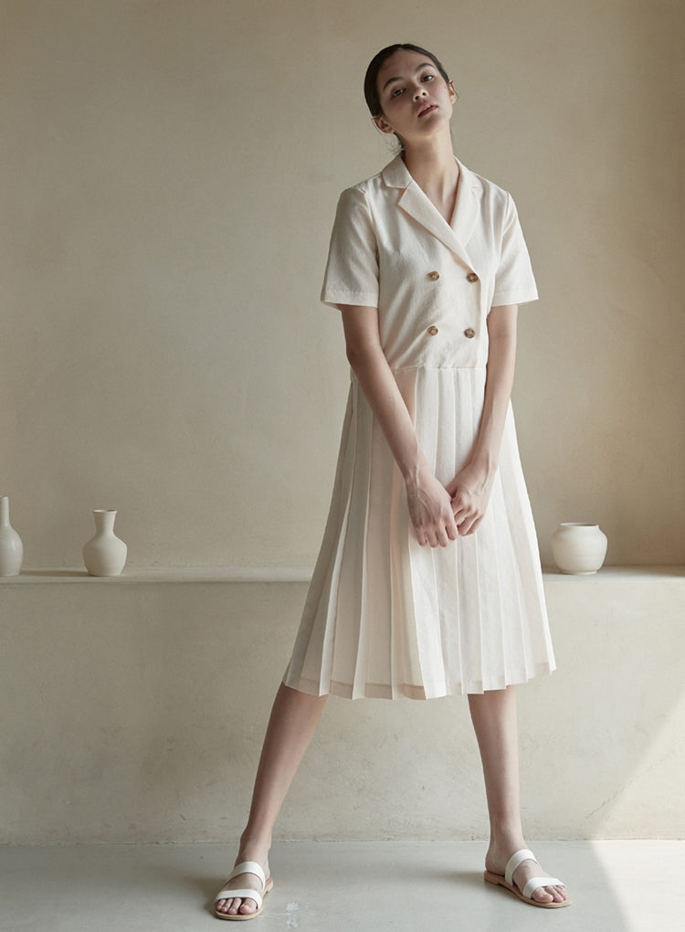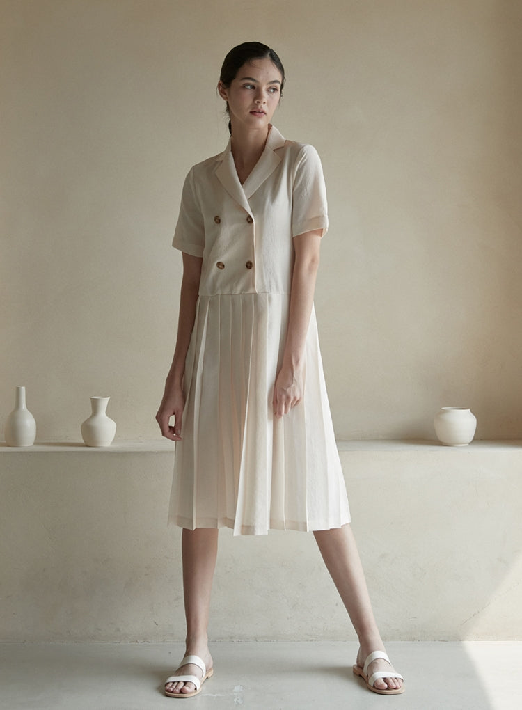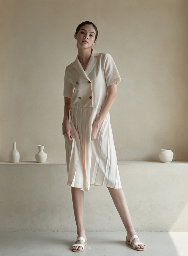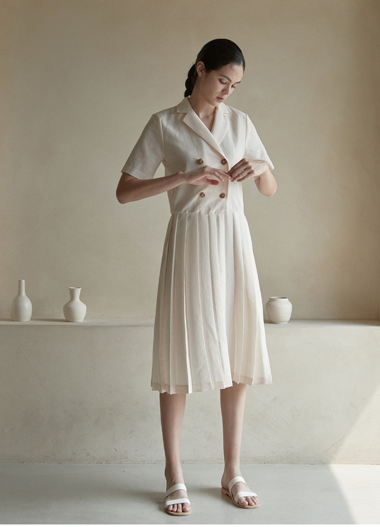 Elevate your wardrobe with this sophisticated short sleeve linen dress from Laura Ren, designed for timeless elegance and effortless style. Crafted from premium breathable linen, this dress features a refined double-breasted front with chic wooden buttons, a sharp notch lapel collar, and a gracefully pleated midi skirt that enhances movement. The tailored fit offers a flattering silhouette, perfect for both work and leisure. Ideal for warm weather, the lightweight linen fabric keeps you cool and polished all day. Pair this versatile dress with minimalist sandals or heels for a refined look that embodies understated sophistication.